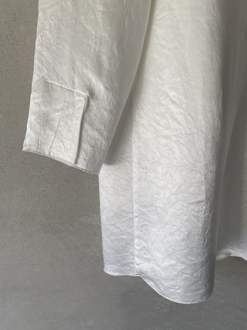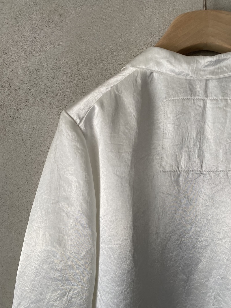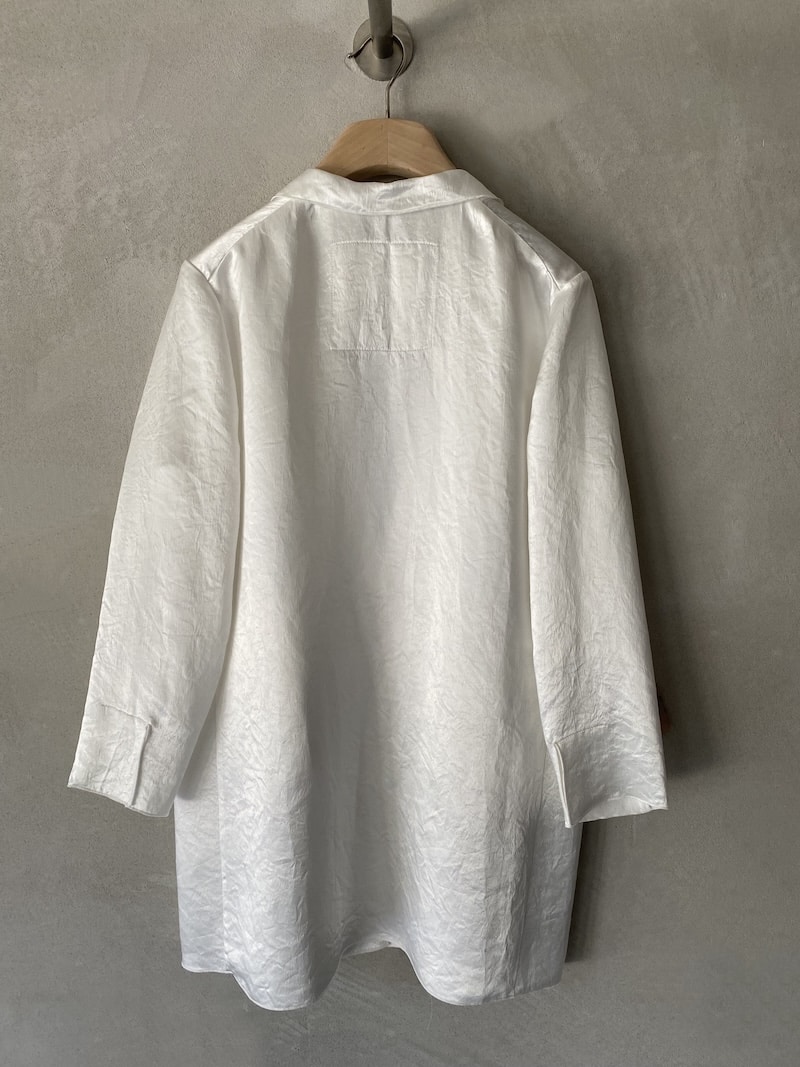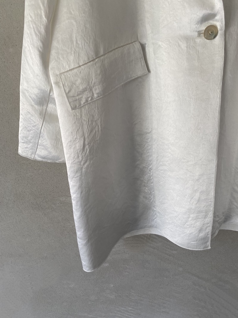 Giacca destrutturata in tessuto di acetato con finitura leggermente stropicciata, completamente sfoderata. Scollo a V profondo con rever classici, chiusura in vita con asola a filetto e bottone in madreperla. Due tasche a filetto leggermente diagonali con patta. Manica 3/4 con spacco al polso sovrapposto. Tutti i profili sono rifiniti con impuntura fitta a vista che definisce i contorni del capo e ne valorizza la costruzione. Linea morbida e fluida con vestibilità oversize.