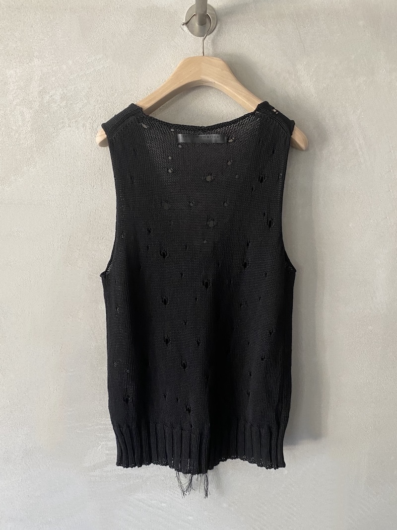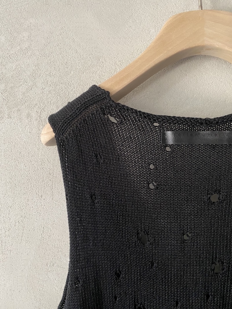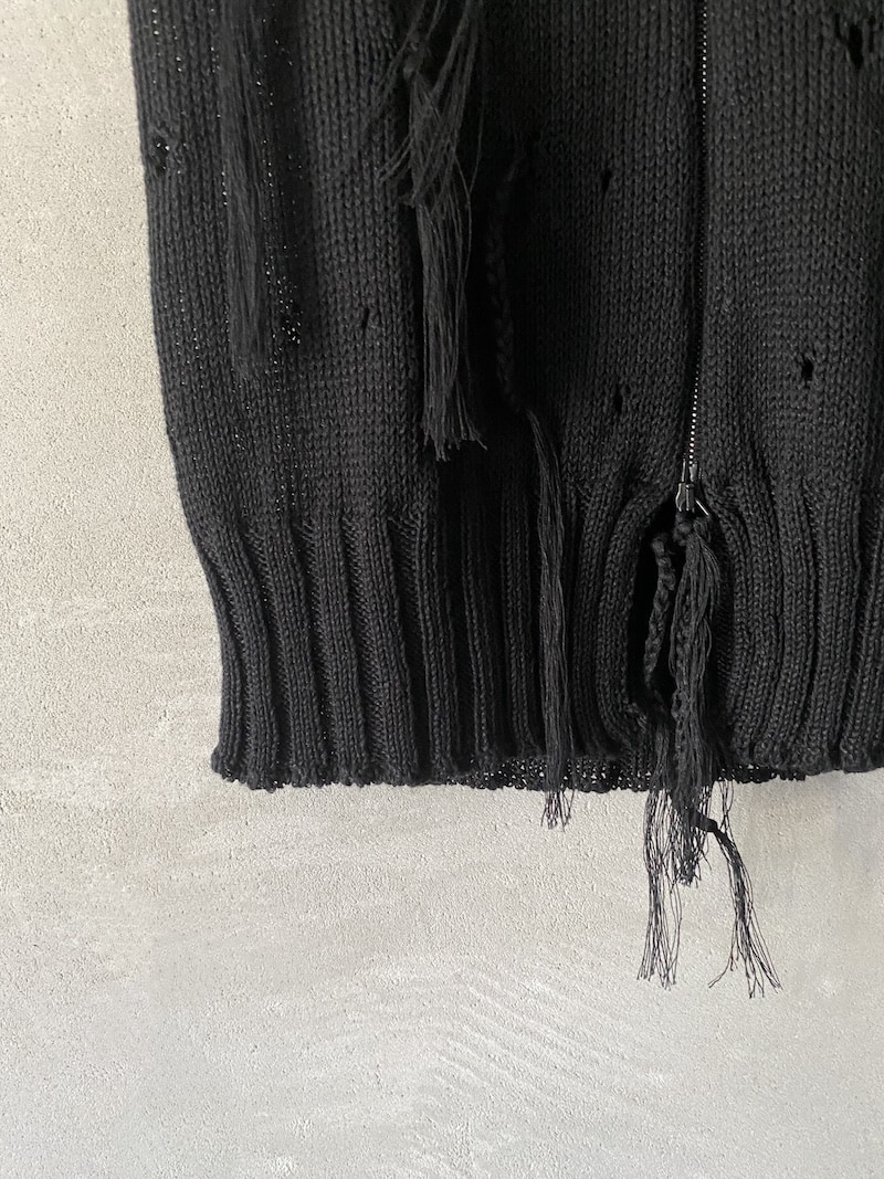 Gilet in maglia traforata di cotone e lino, impreziosito da piccole nappine applicate a mano. Scollo a V profondo e chiusura centrale frontale con zip apribile a doppio cursore. Giri manica ampi e linea morbida. Vestibilità morbida.