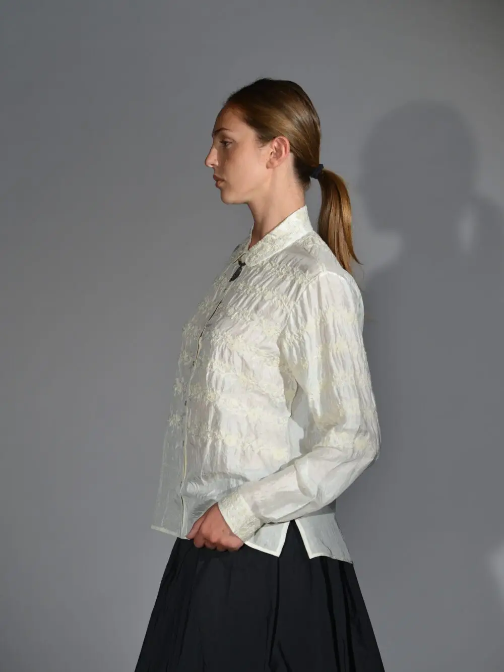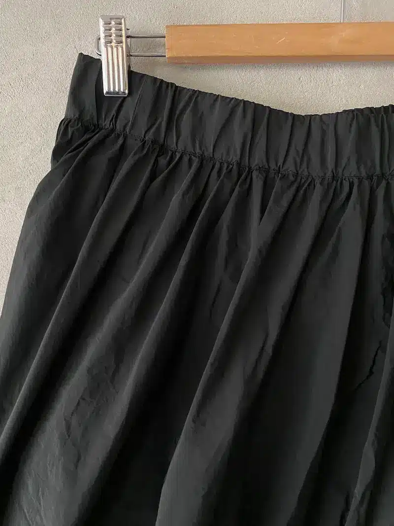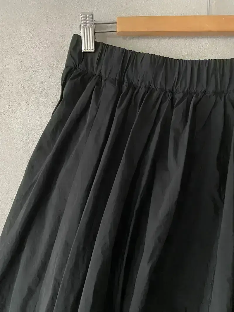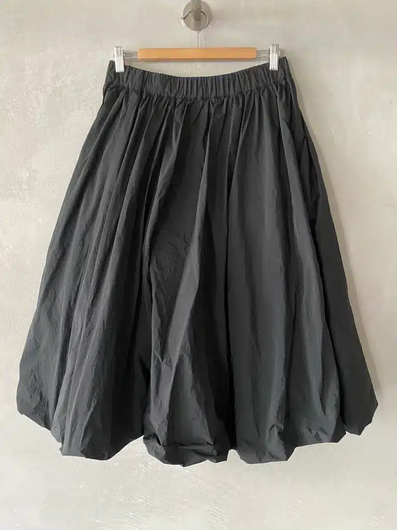 Ampia gonna completamente doppiata, costruita con una piccola arricciatura piatta in vita, elastico alto 4 cm in vita. Misure taglia S: lunghezza 78 cm, circonferenza elastico in vita 74 cm. Le misure delle taglie successive aumenteranno 2 cm in lunghezza e 4 cm in circonferenza.