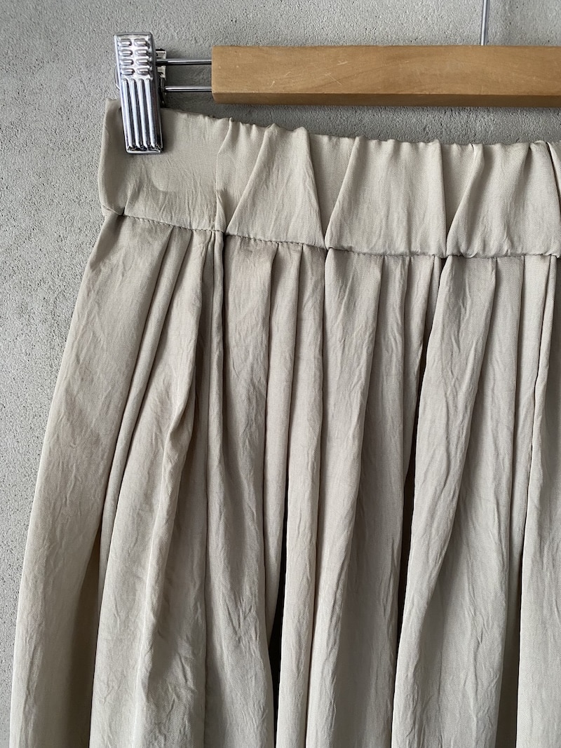 Ampia gonna in tessuto con finitura leggermente stropicciata. Costruita con piccole pieghe piatte, elastico alto 5 cm in vita. Linea ampia e fluida. Vestibilità regolare.