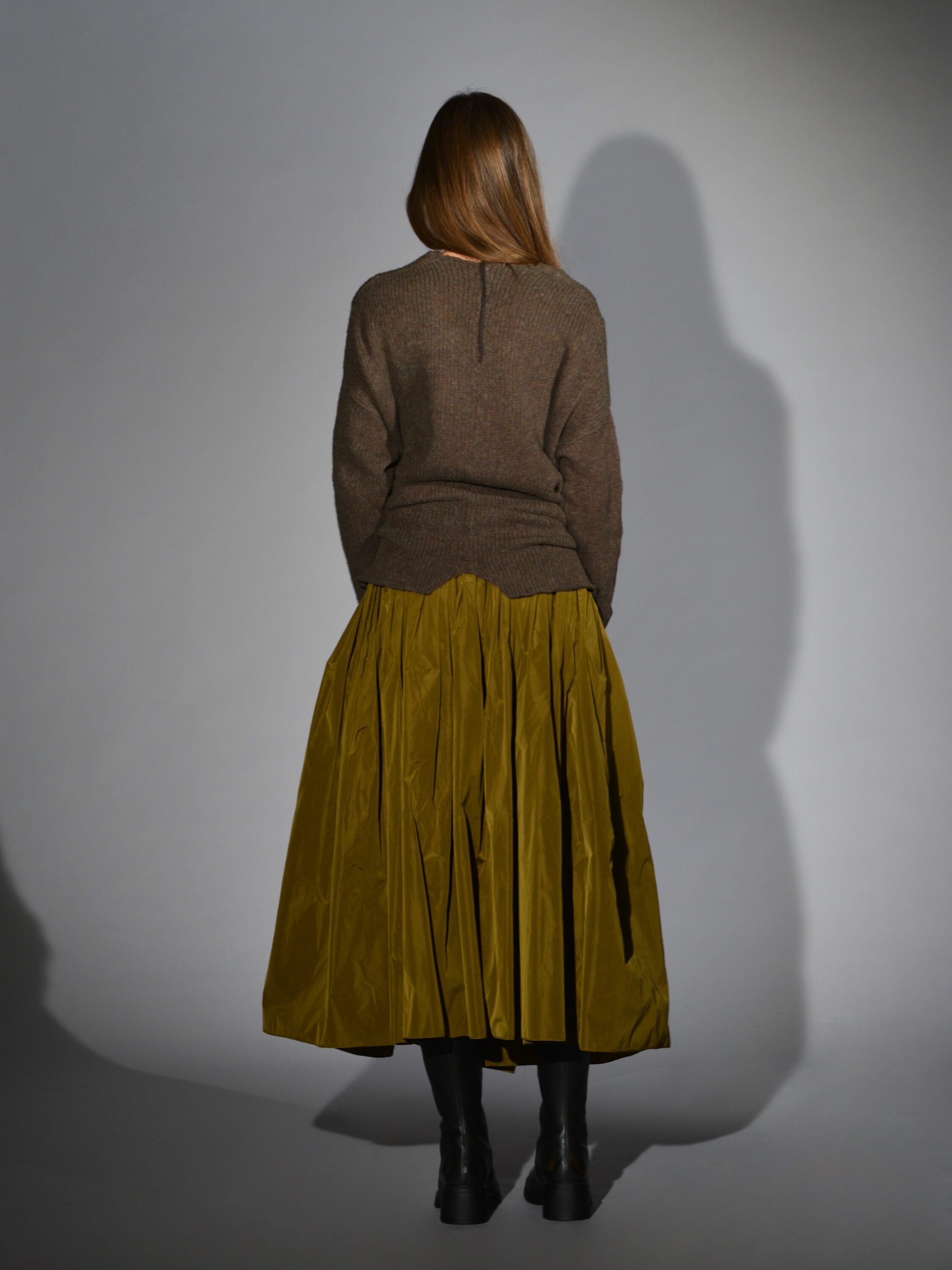 Ampia gonna completamente doppiata con tessuto in tulle, costruita con piccole pieghe piatte e due tasche verticali laterali in cucitura, elastico alto 5 cm in vita. Misure taglia 36: lunghezza 85 cm, circonferenza elastico in vita 76 cm. Le misure delle taglie successive aumenteranno 2 cm in lunghezza e 4 cm in circonferenza.