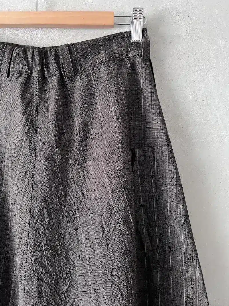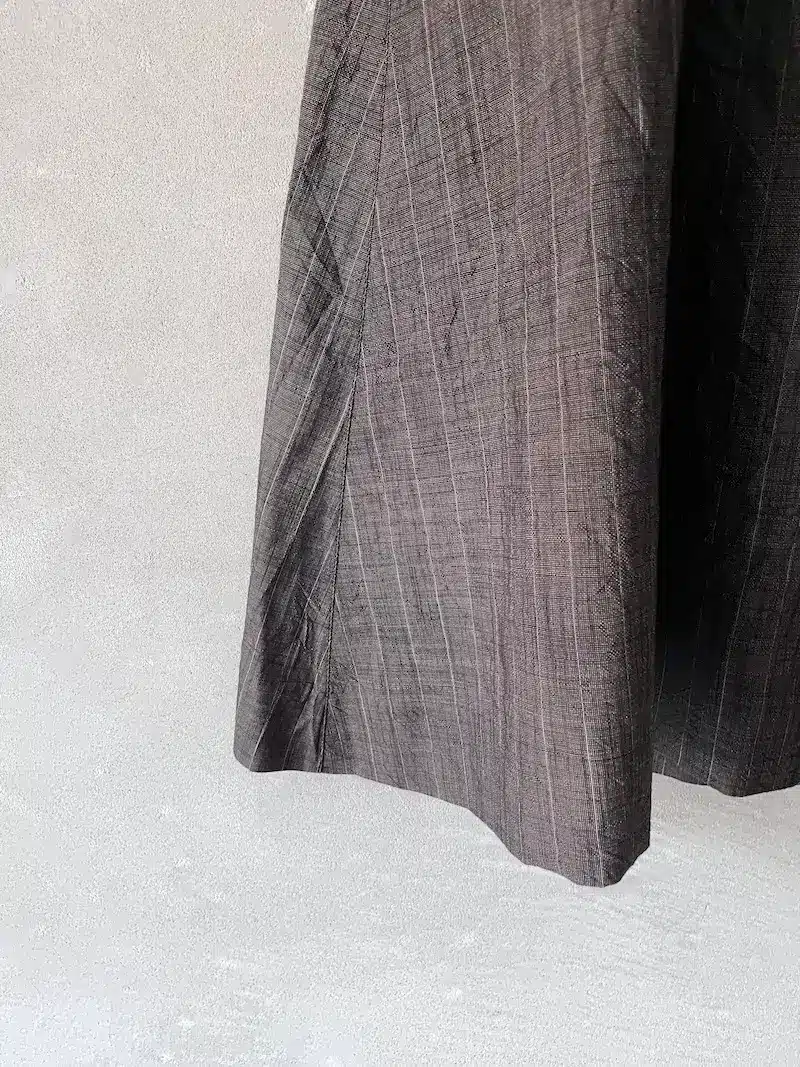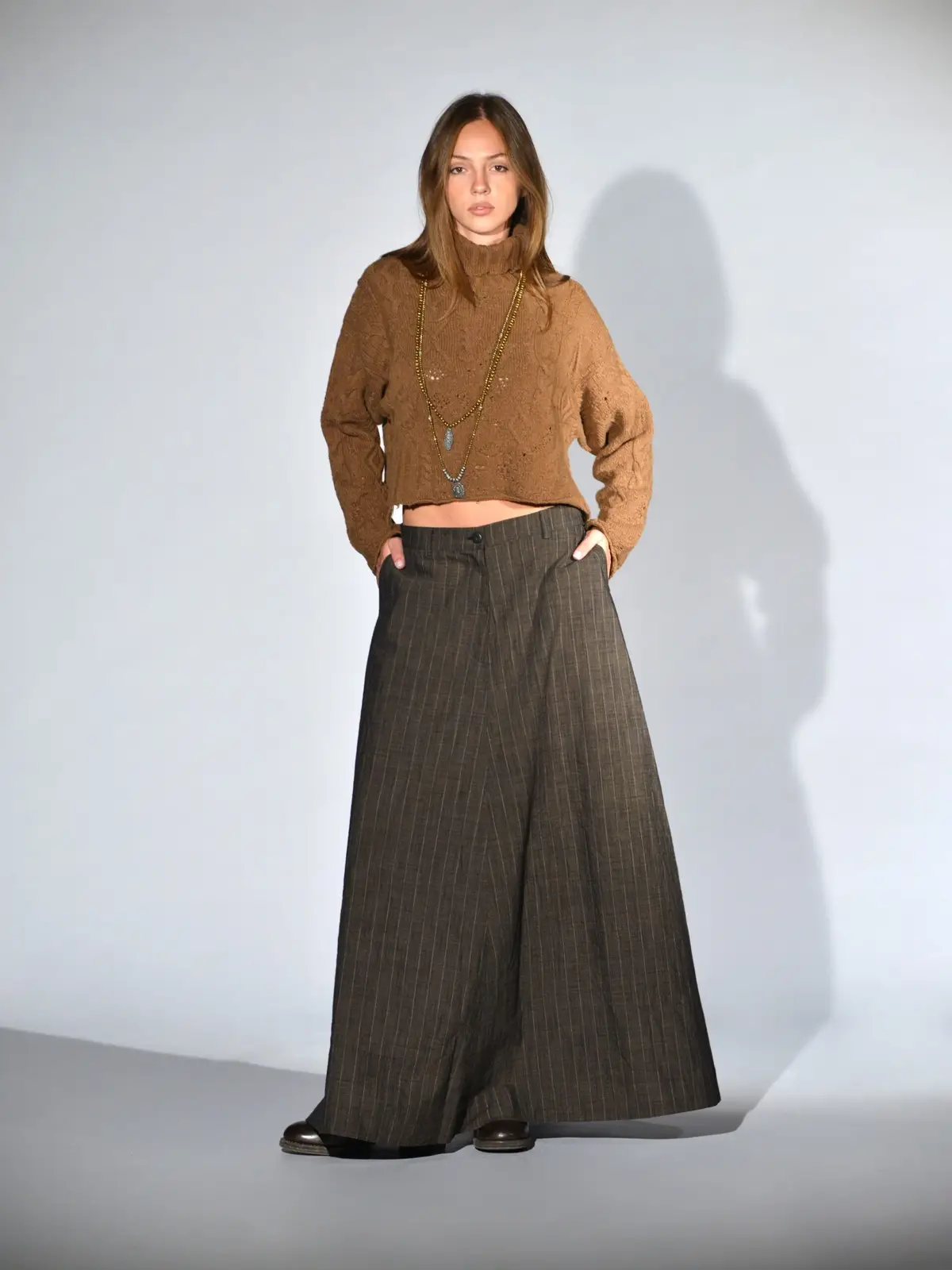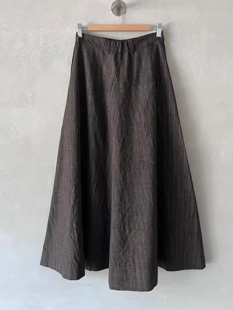 Gonna lunga svasata in tessuto melange di cotone e lana gessato, cintura con passanti ed elastico sul dietro, chiusura centrale davanti con un bottone più zip con patta, due tasche laterali oblique più una tasca a toppa sul dietro. Lunghezza 102 cm, circonferenza cintura 74 cm. Le misure delle taglie successive aumenteranno 2 cm in lunghezza e 4 cm in circonferenza.