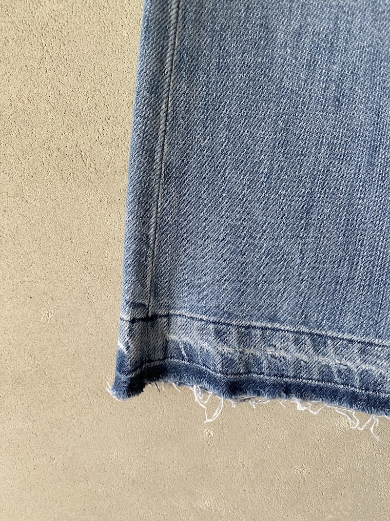 Jeans crop in denim elasticizzato scolorito. Modello 5 tasche in cotone e lino elasticizzato, chiuso con zip e patta, cintura con passanti, vita bassa, orlo a taglio vivo sfrangiato.