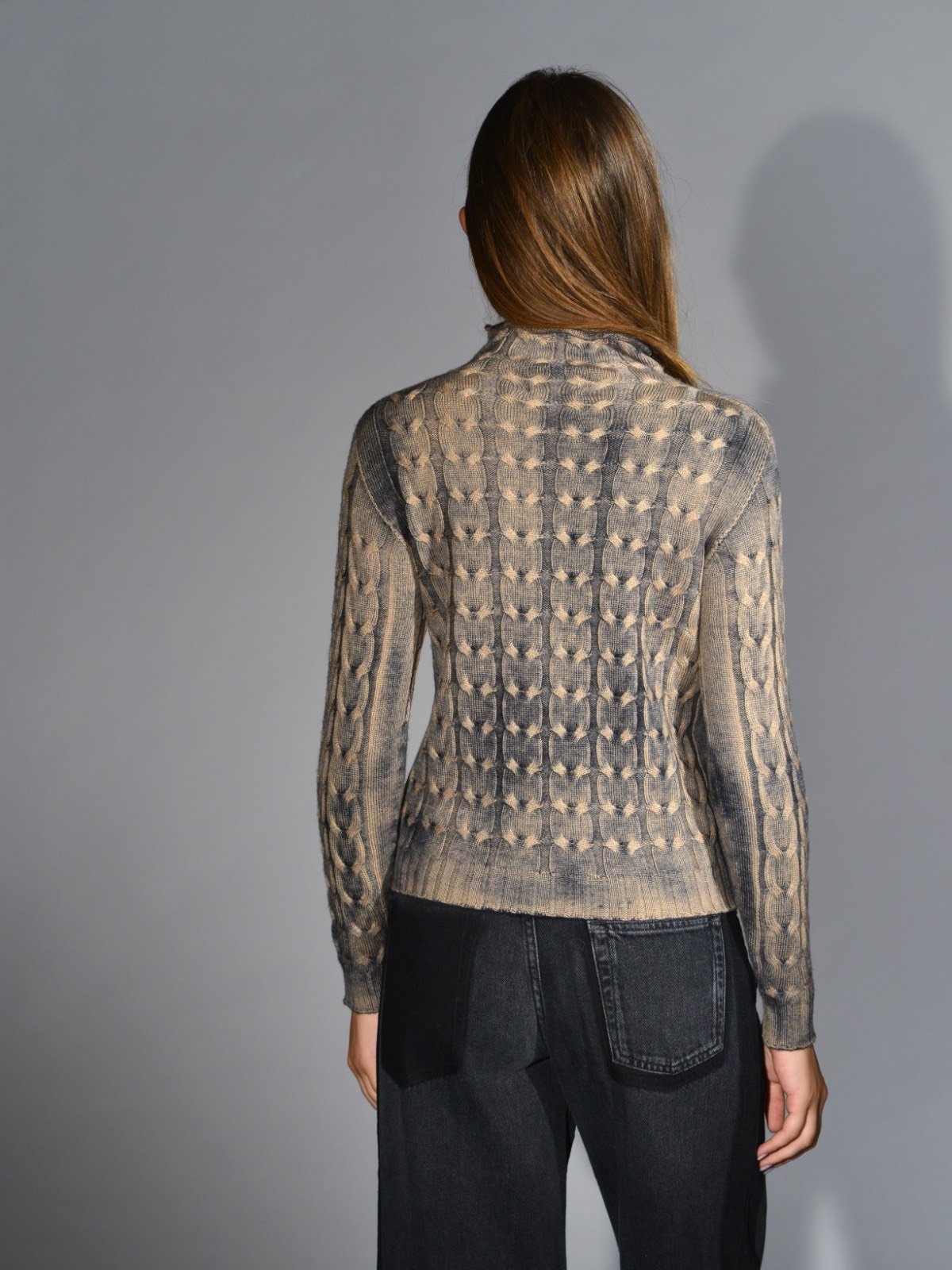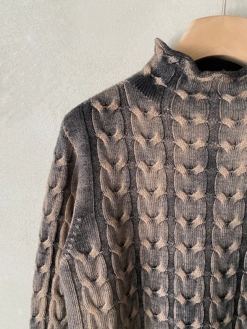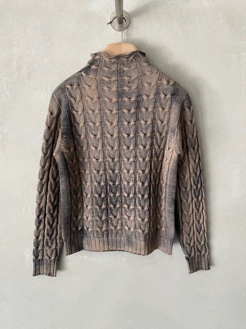 Maglia in lana merinos extrafine con lavorazione a trecce, dipinto a mano, collo a lupetto, manica lunga, vestibilità regolare. Misure taglia S: lunghezza 58 cm, larghezza 46 cm. Le misure delle taglie successive aumenteranno 2 cm in lunghezza e 4 cm in circonferenza.