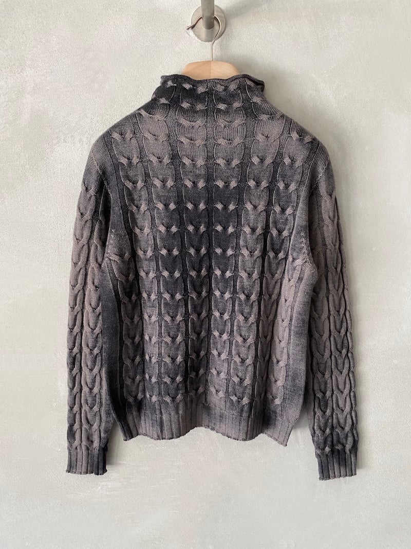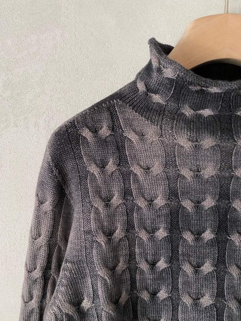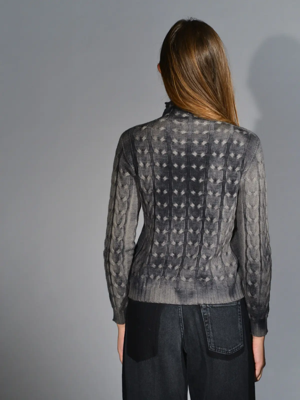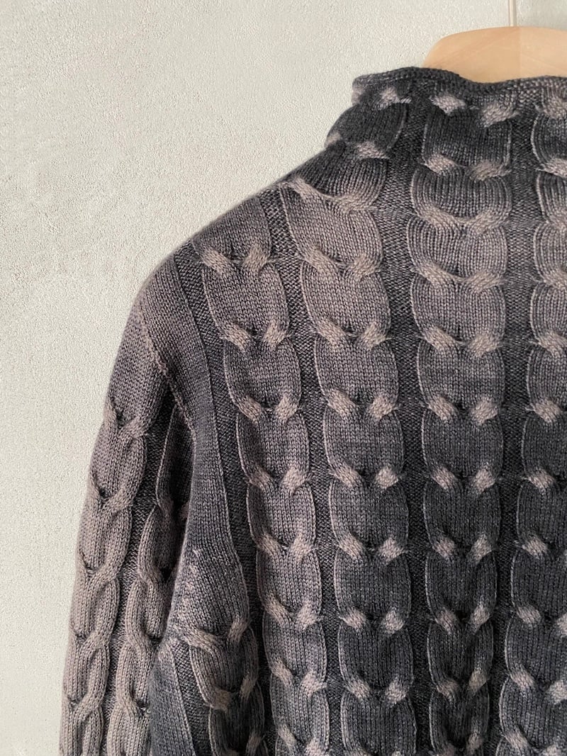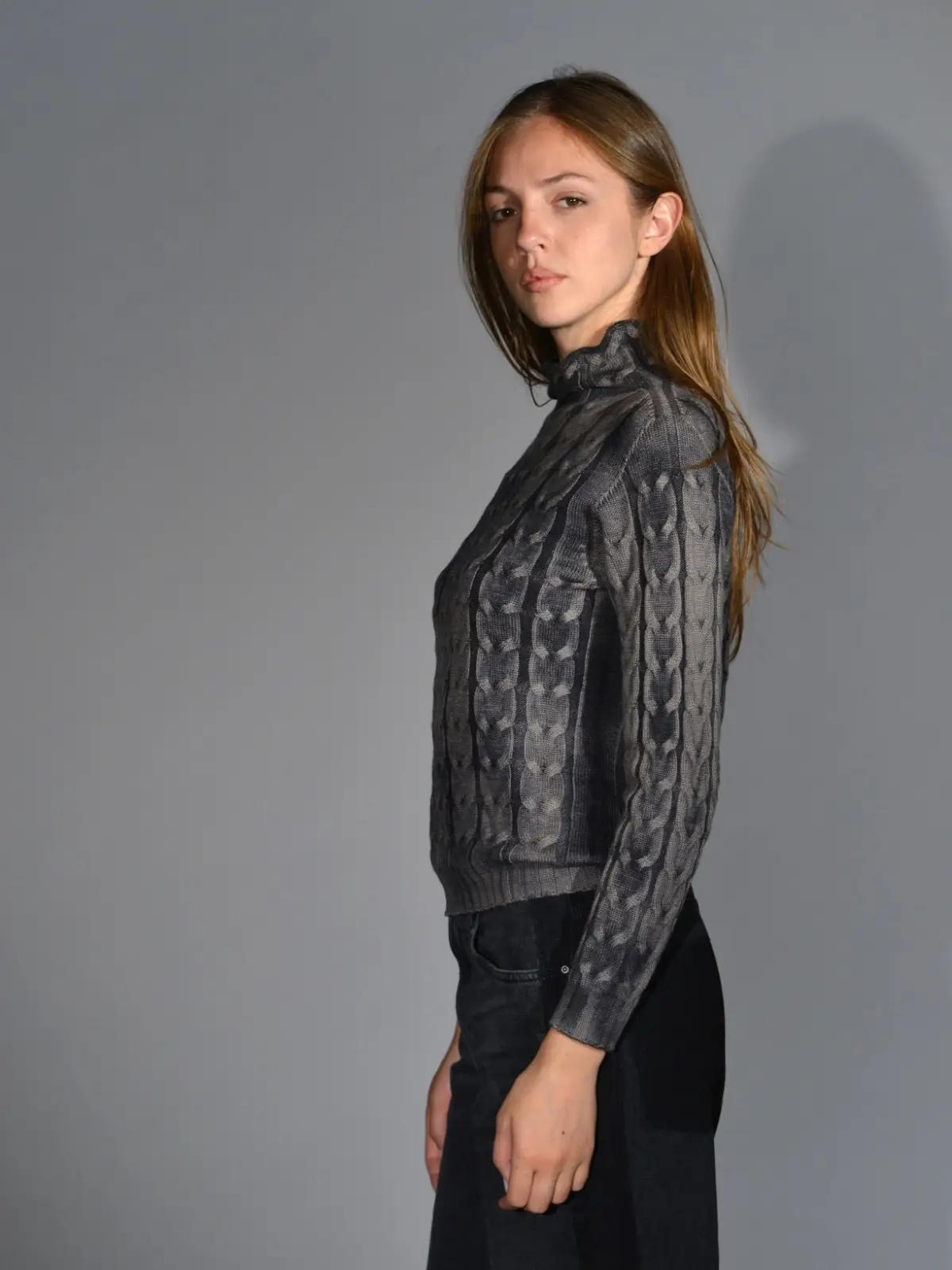Maglia in lana merinos extrafine con lavorazione a trecce, dipinto a mano, collo a lupetto, manica lunga, vestibilità regolare. Misure taglia S: lunghezza 58 cm, larghezza 46 cm. Le misure delle taglie successive aumenteranno 2 cm in lunghezza e 4 cm in circonferenza.