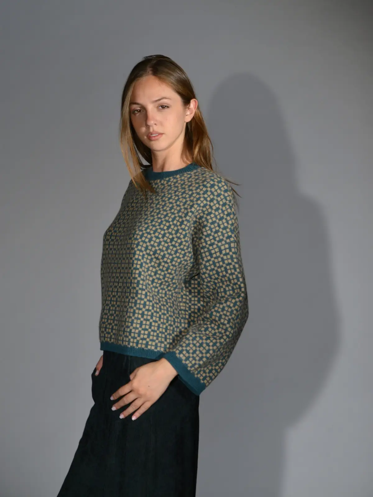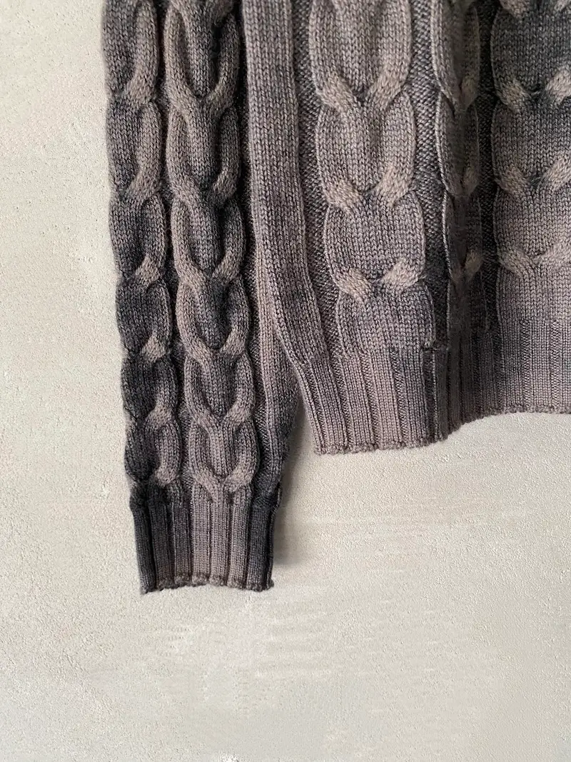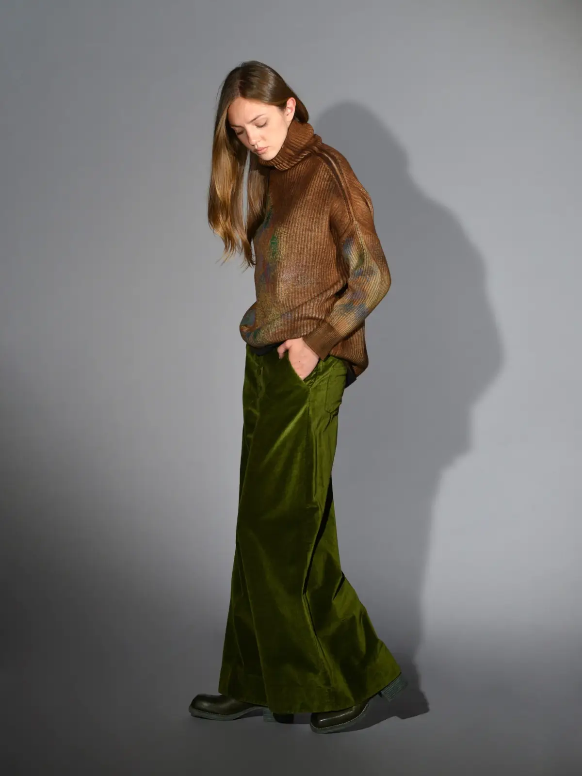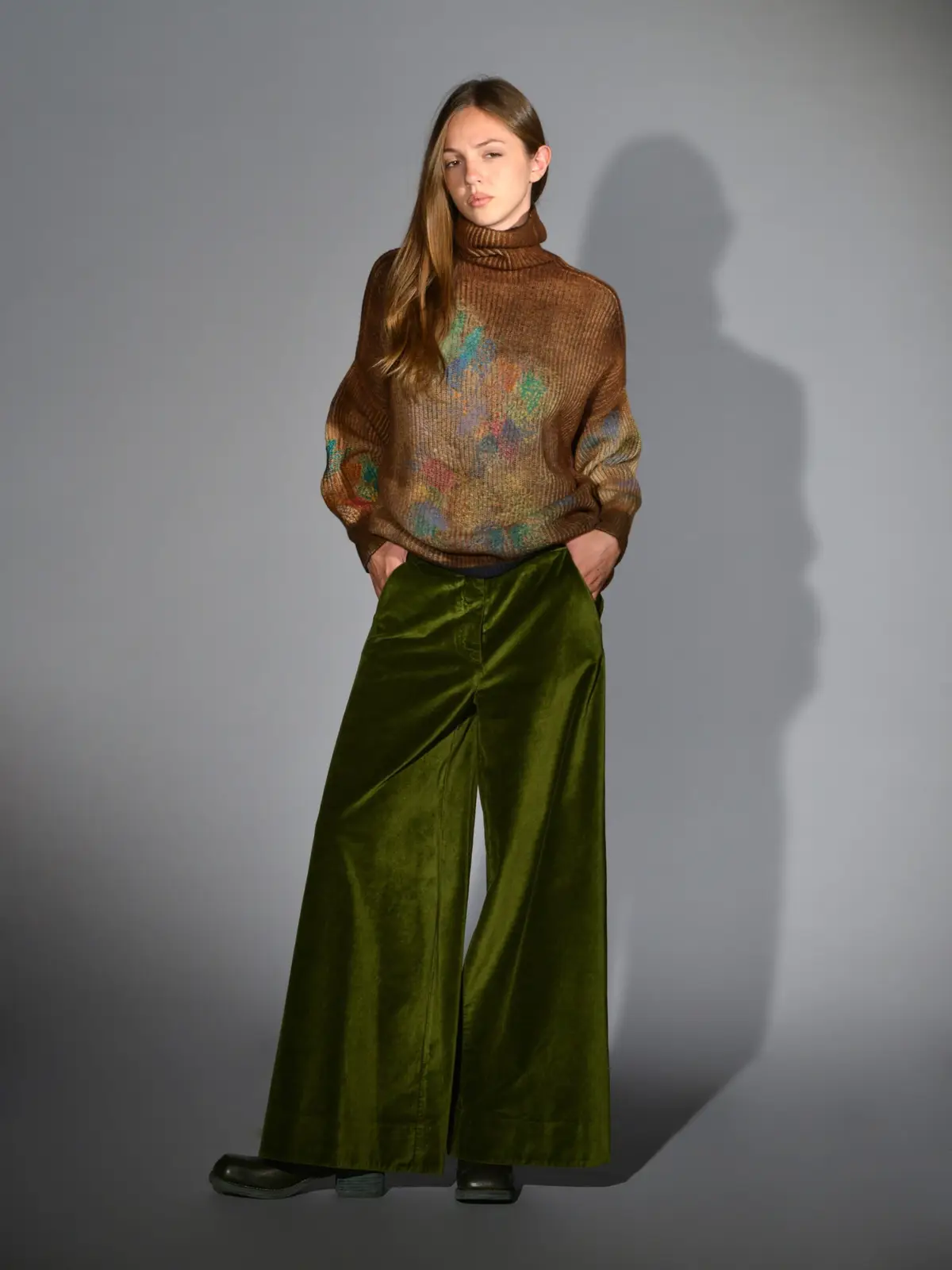 Maglia in lana merinos extrafine con lavorazione a trecce, dipinto a mano, collo a lupetto, manica lunga, vestibilità regolare. Misure taglia S: lunghezza 58 cm, larghezza 46 cm. Le misure delle taglie successive aumenteranno 2 cm in lunghezza e 4 cm in circonferenza.