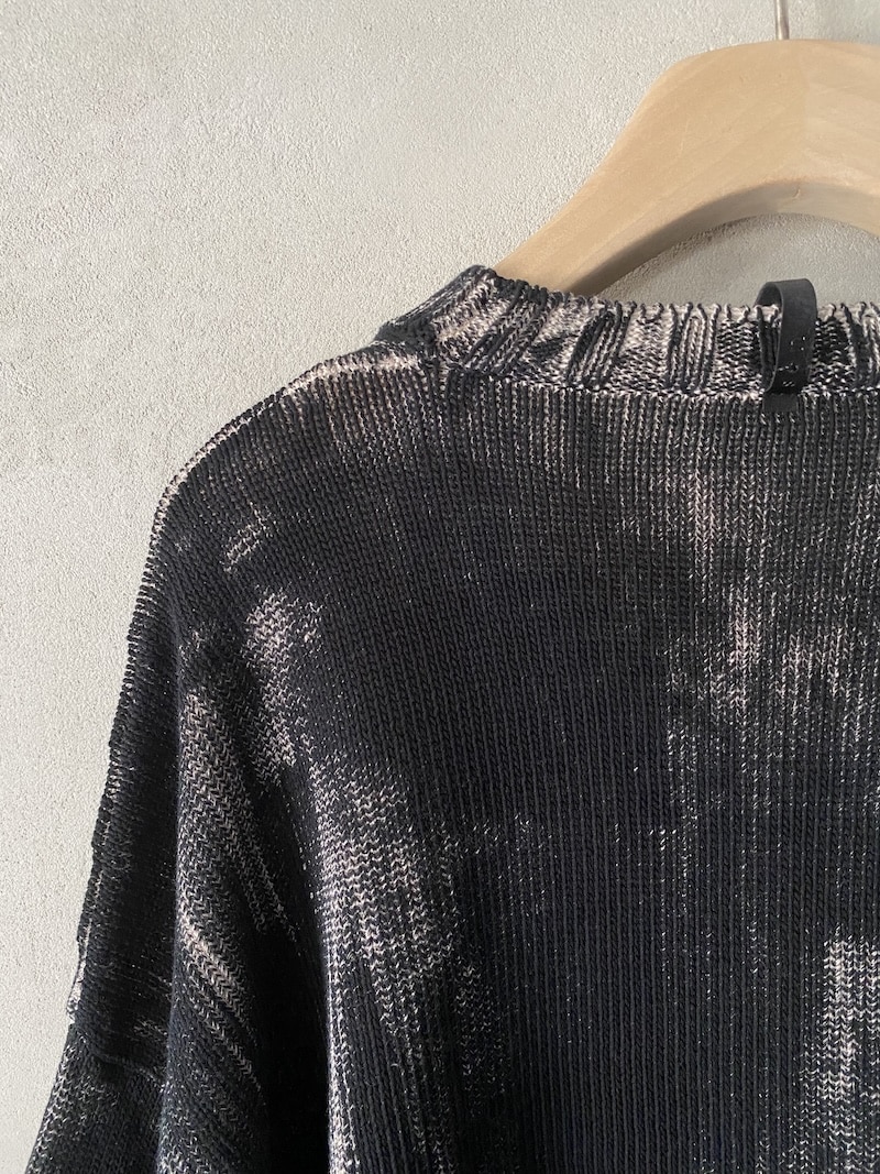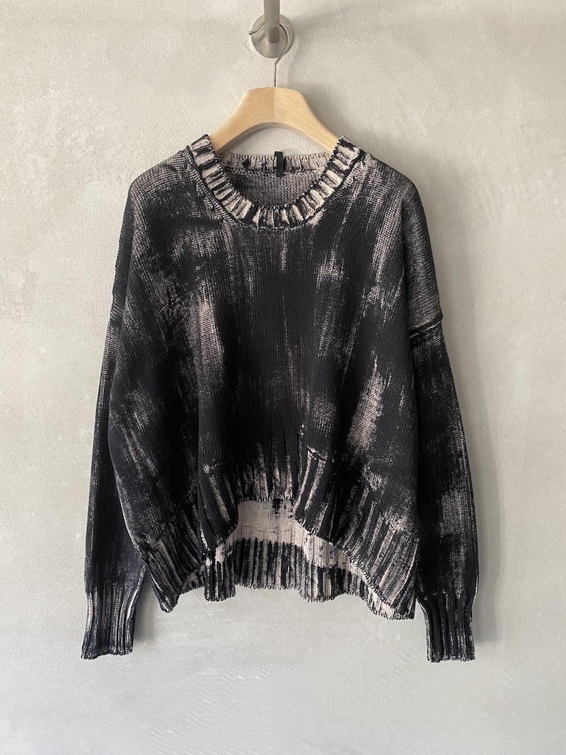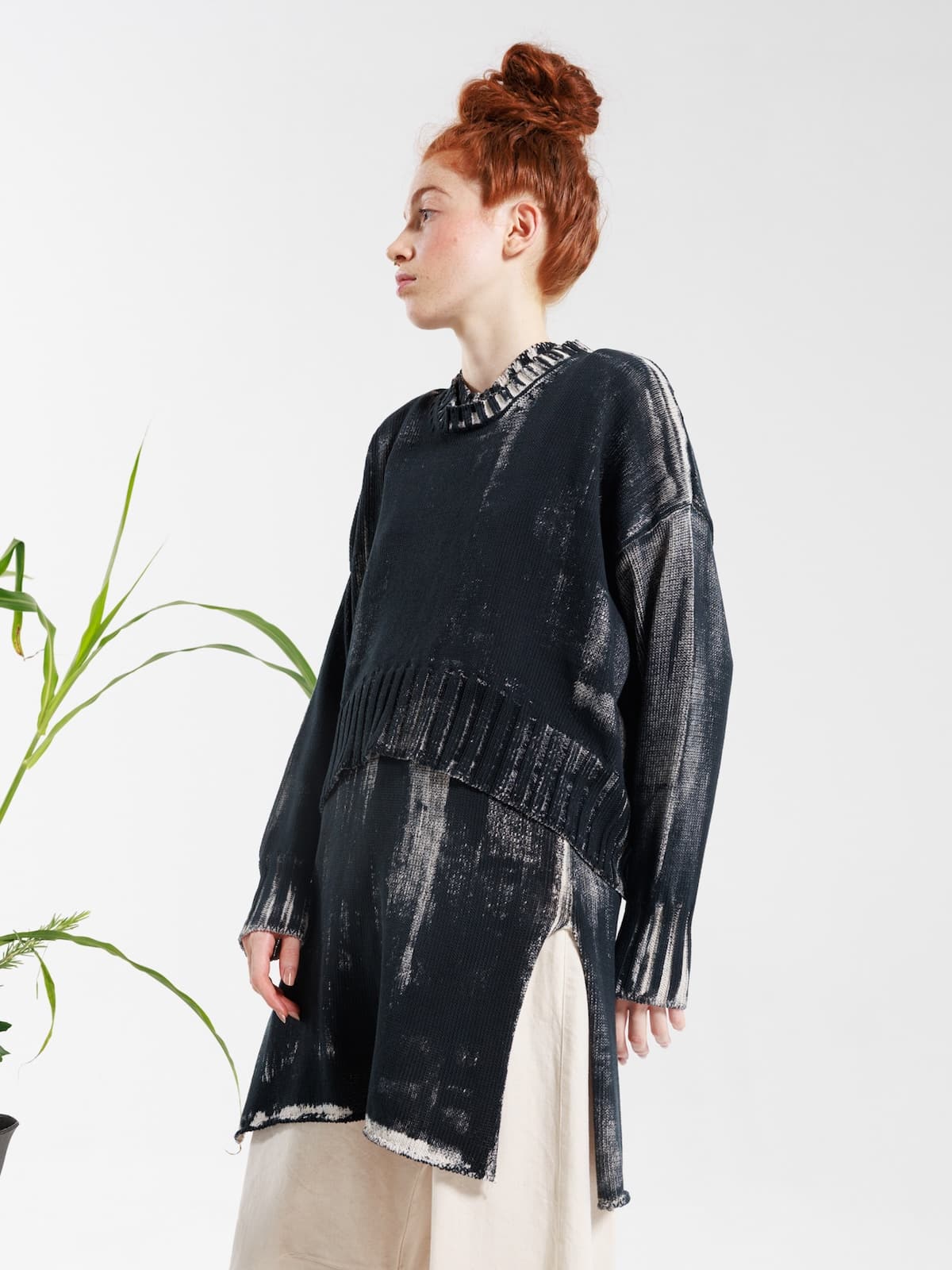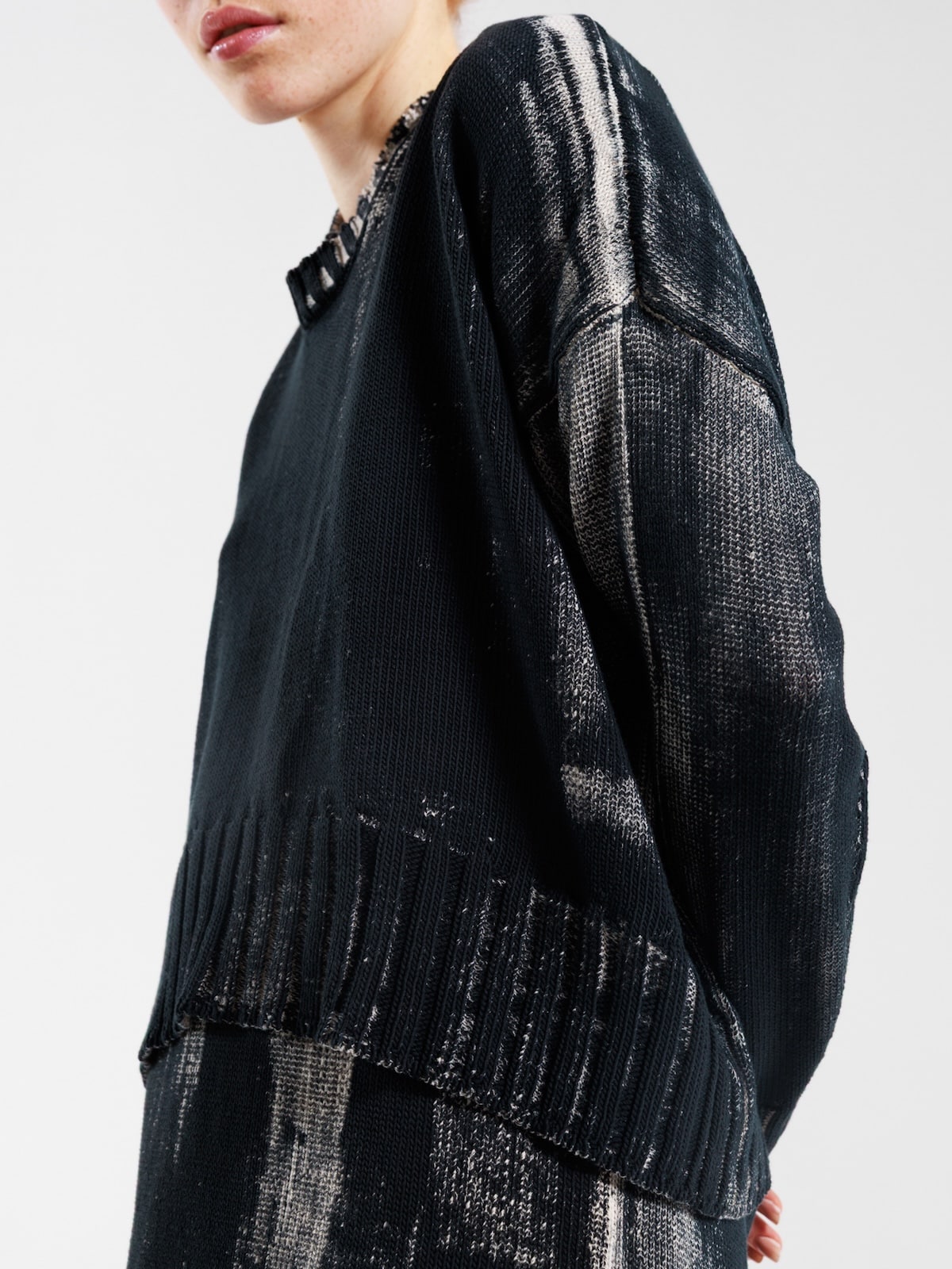Maglia in cotone dipinto a mano con fondo écru e pittura nera. Scollo ampio, spalla calata e maniche lunghe con polsini a costine. Fondo dalla linea ellittica, leggermente più lungo al centro dietro. Vestibilità morbida.