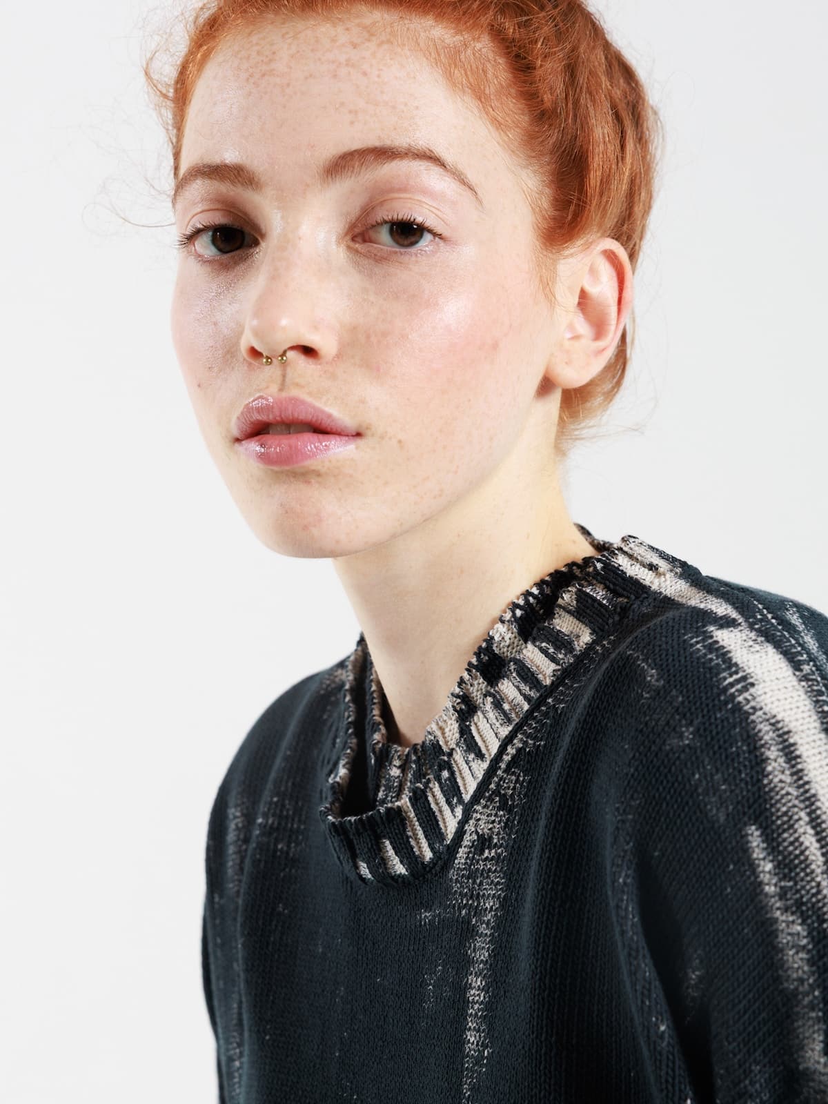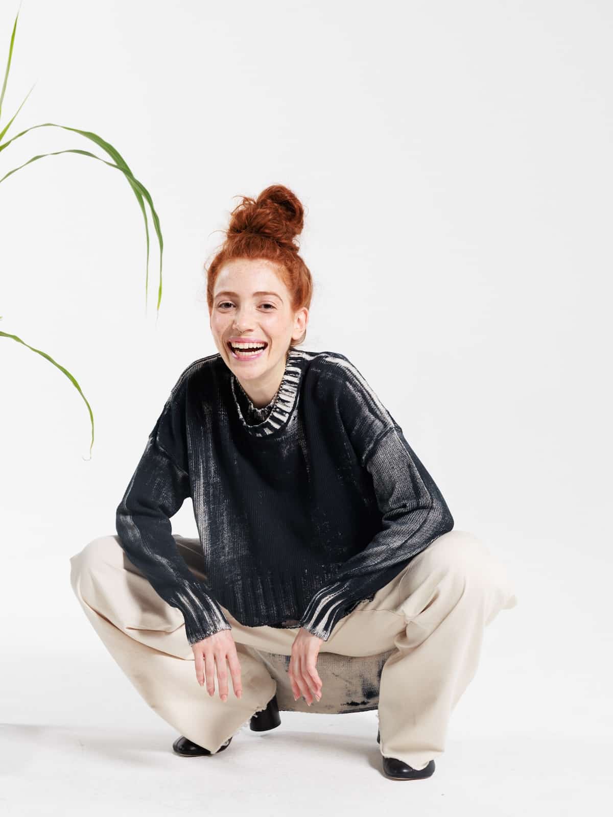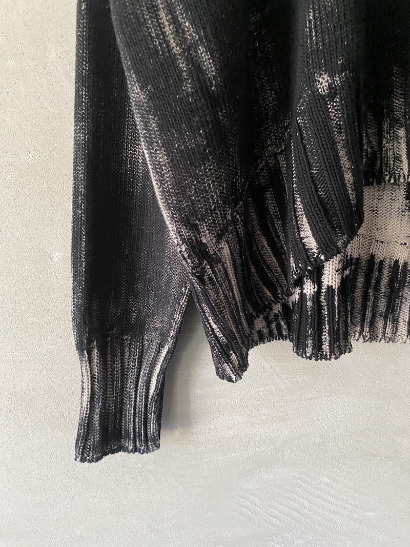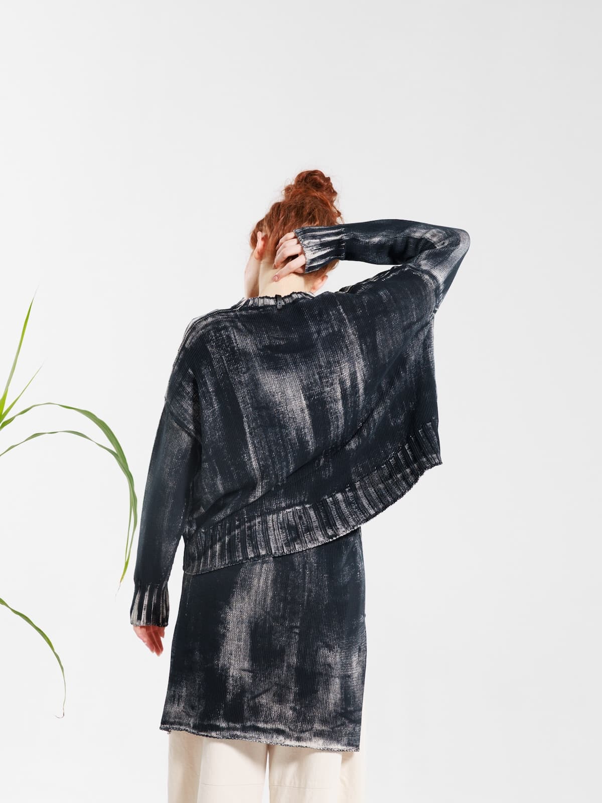 Maglia in cotone dipinto a mano con fondo écru e pittura nera. Scollo ampio, spalla calata e maniche lunghe con polsini a costine. Fondo dalla linea ellittica, leggermente più lungo al centro dietro. Vestibilità morbida.