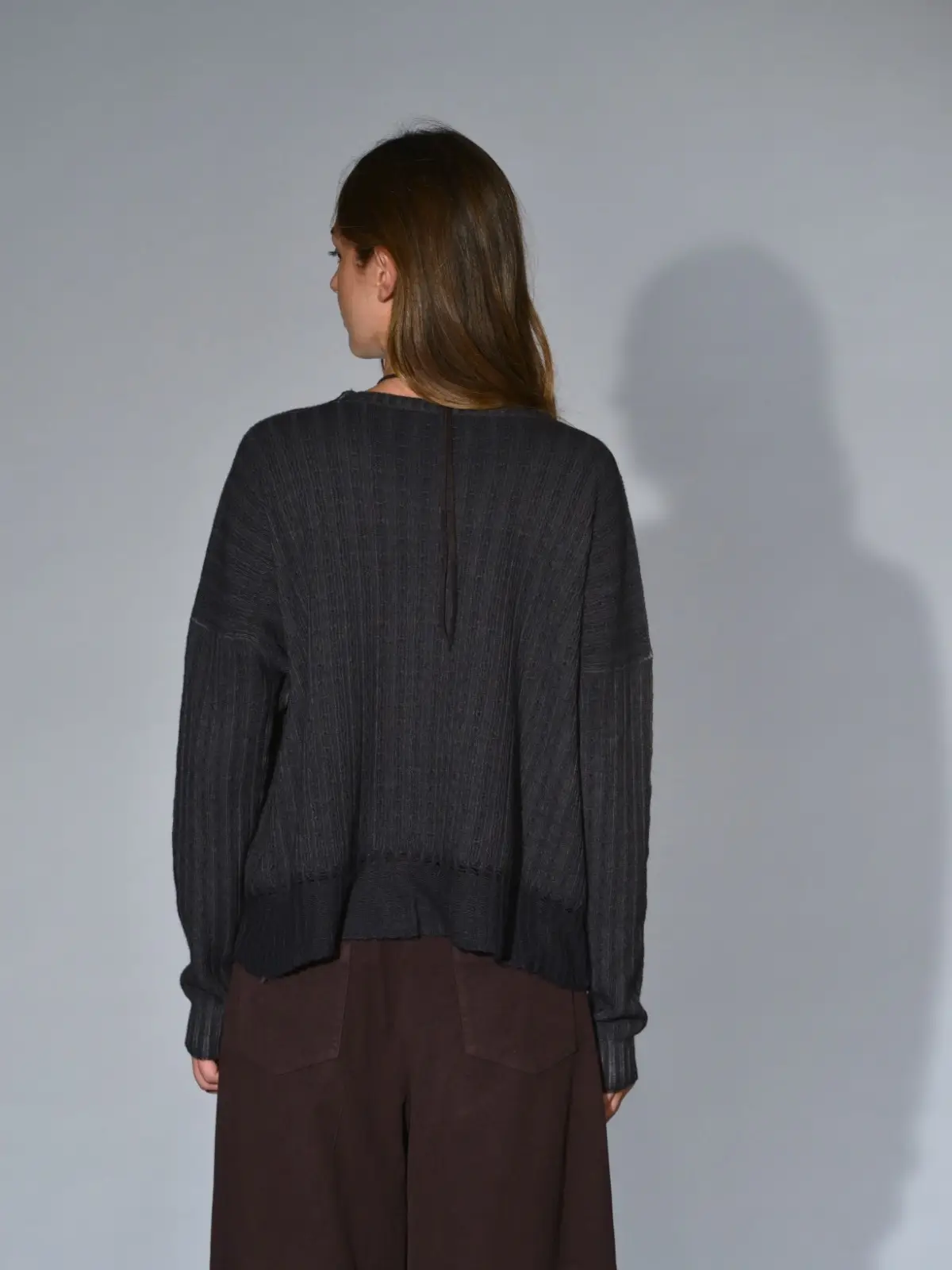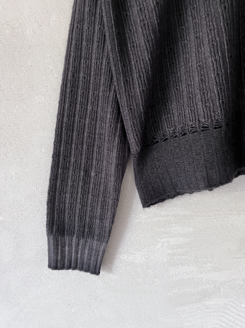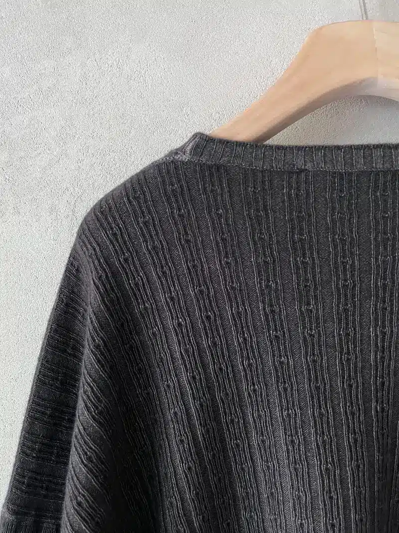 Maglia leggera  boxi in cashmere delavè con motivo pointelle, scollo tondo sceso, spalla calata. Misure taglia I: lunghezza 56 cm, larghezza 68 cm. Le misure della taglia successiva aumenteranno 3 cm in lunghezza e 6 cm in circonferenza.