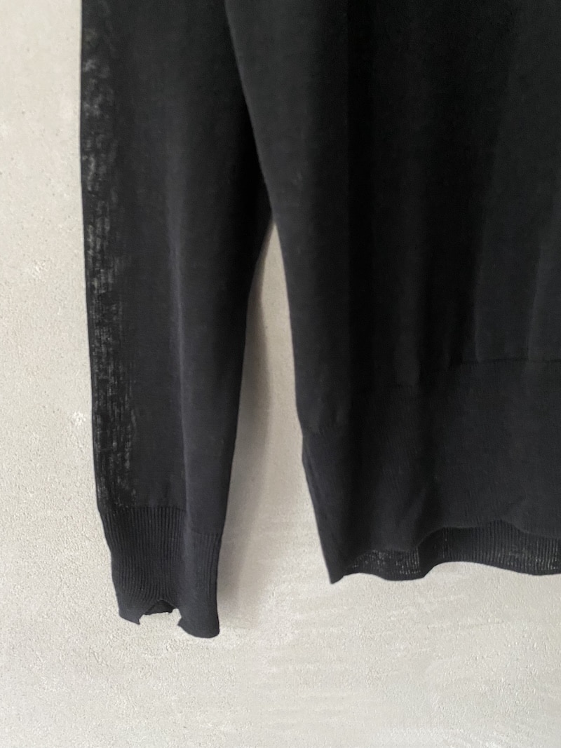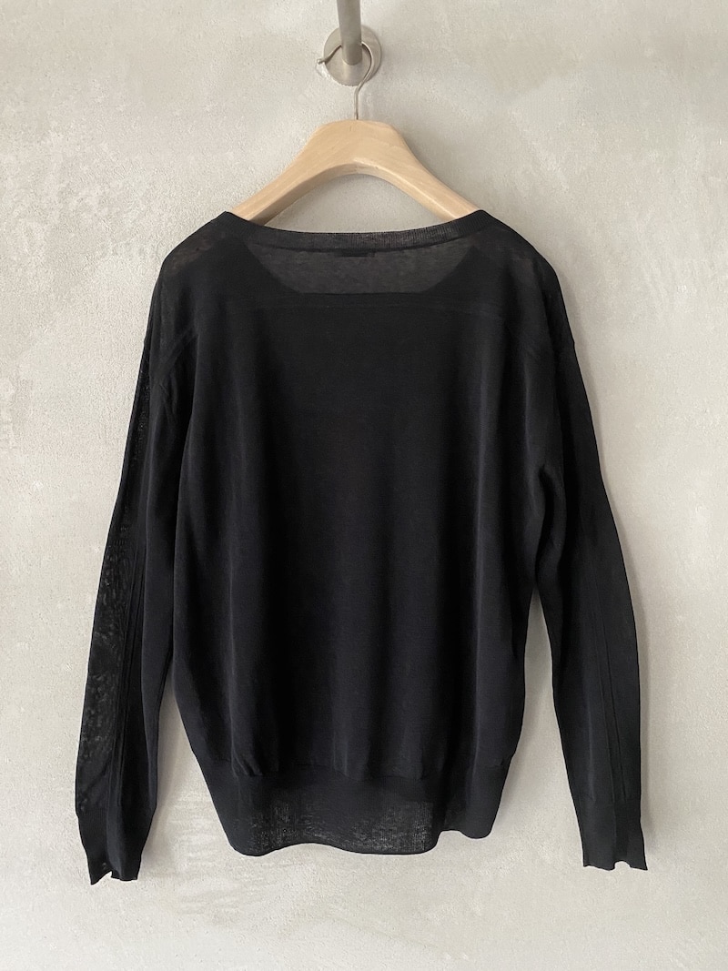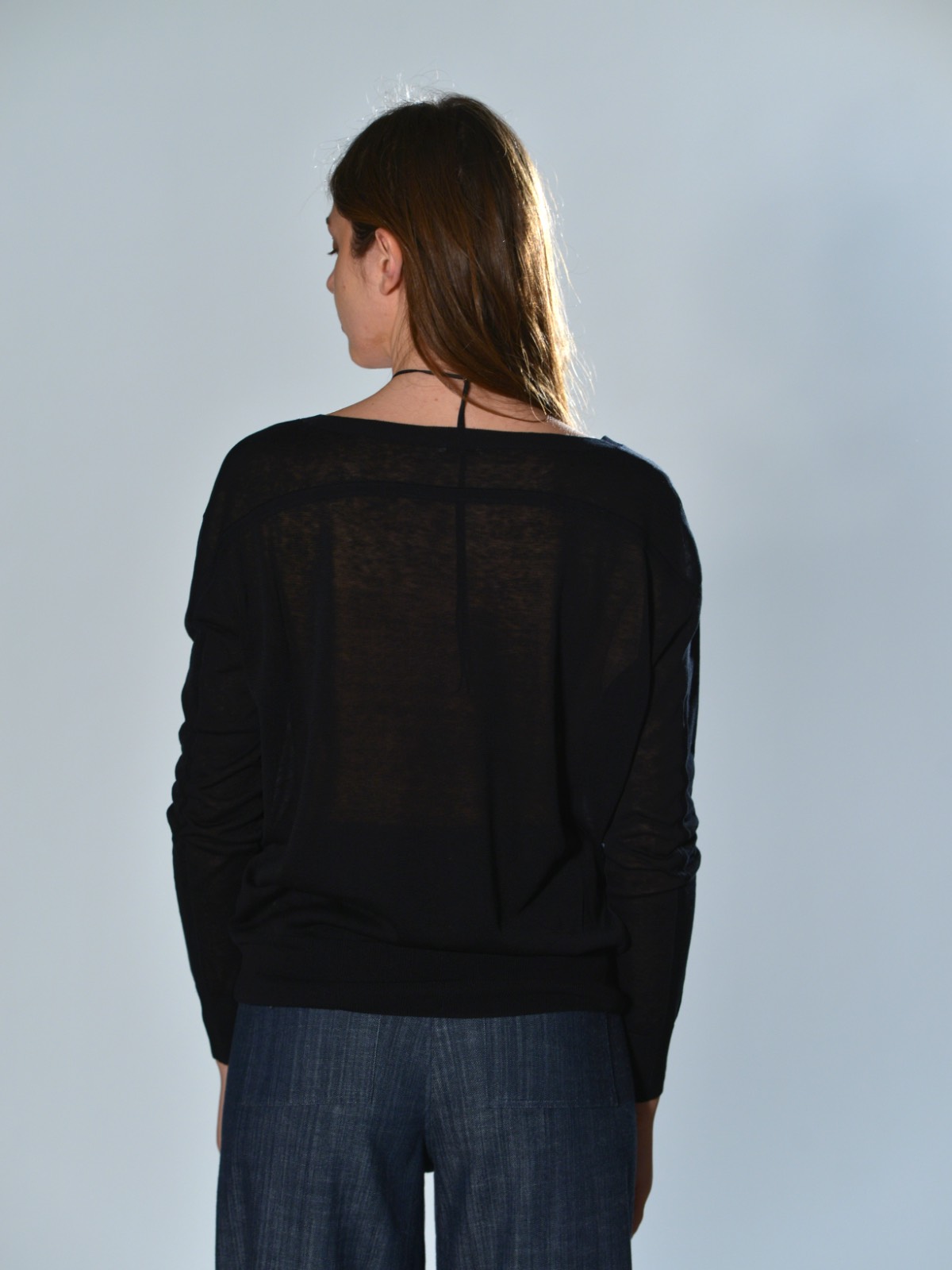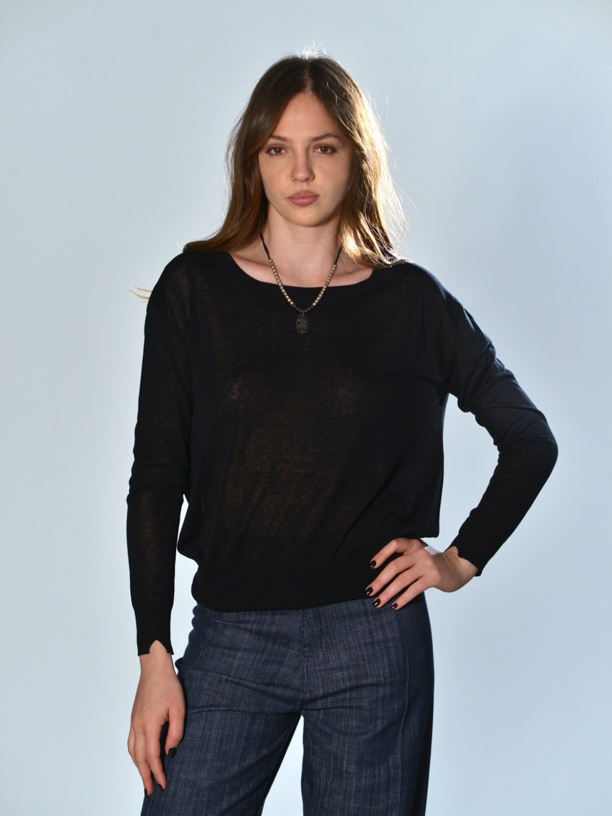 Maglia in seta e cotone con effetto leggermente trasparente. Scollo tondo ampio, spalla calata e maniche lunghe con polsino a costine. Fondo rifinito a costina che crea un leggero effetto blusante. Vestibilità over.