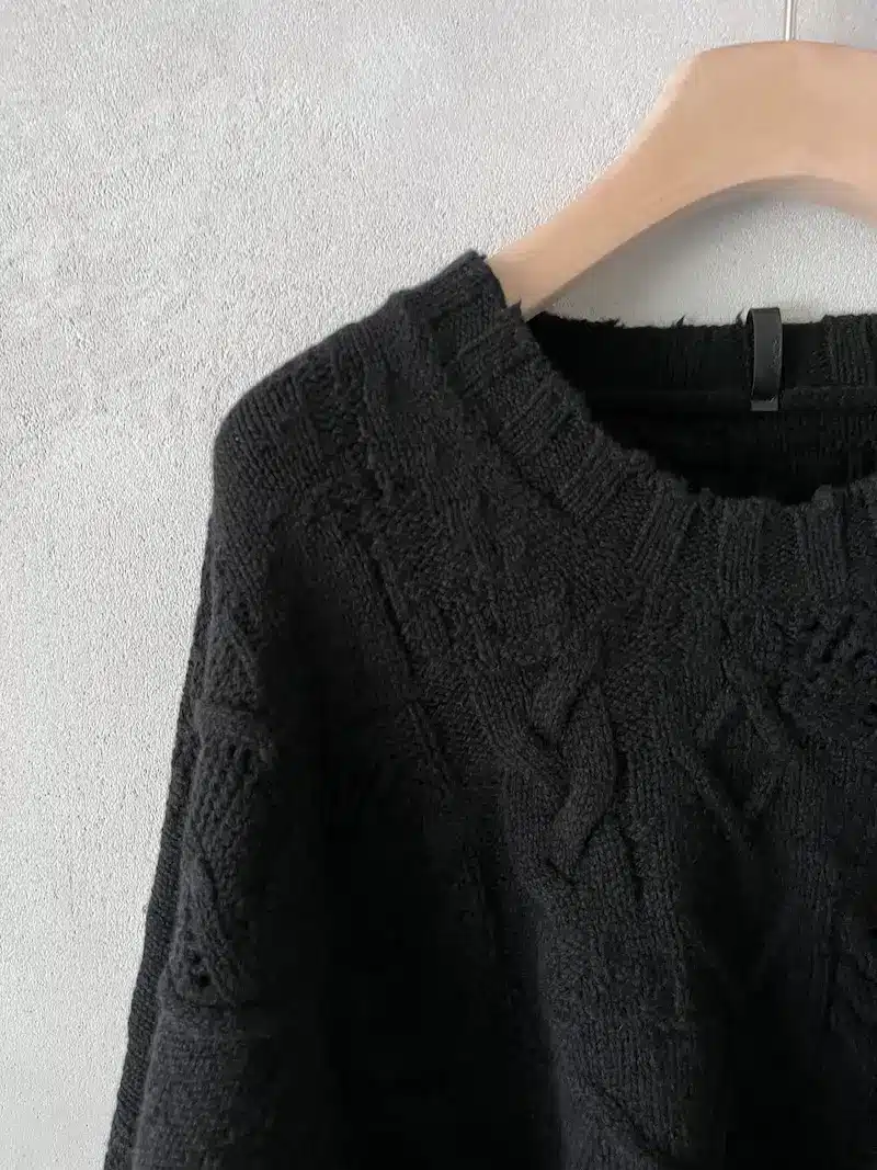 Maglia over boxi in lana merino con punti maglia misti, collo tondo sceso, spalla calata. Misure taglia I: lunghezza 56 cm, larghezza 78 cm. Le misure della taglia successiva aumenteranno 3 cm in lunghezza e 6 cm in circonferenza.