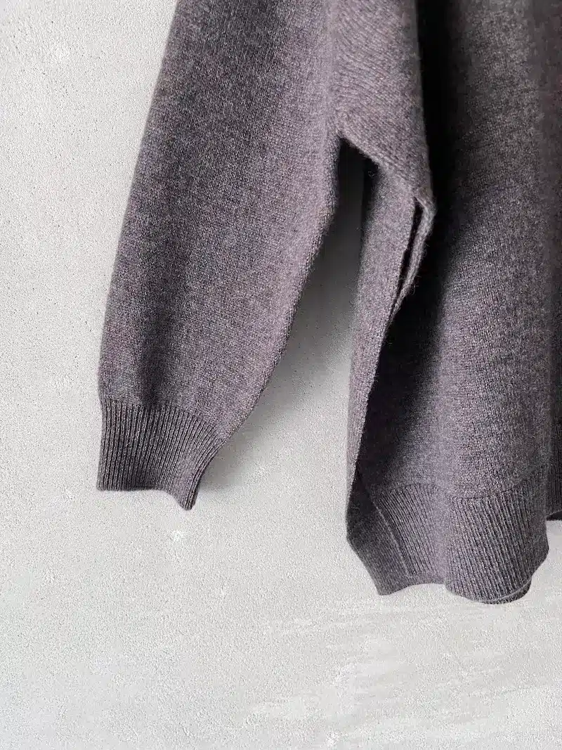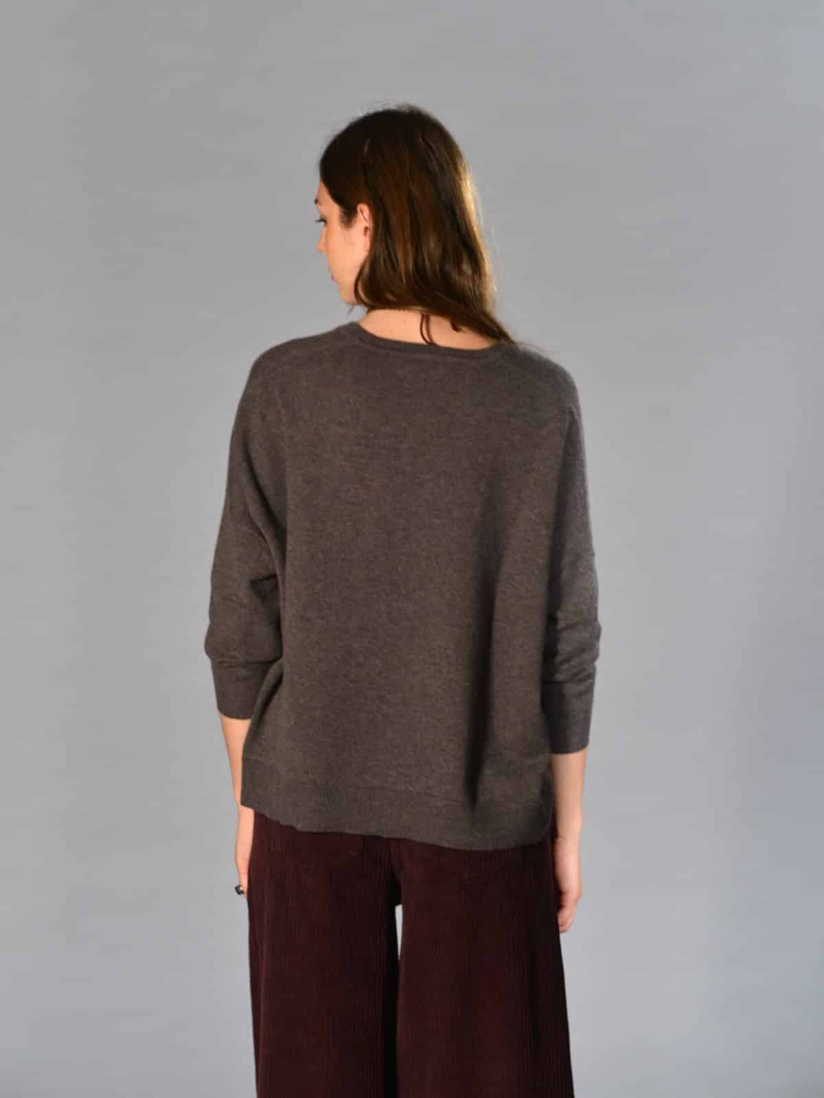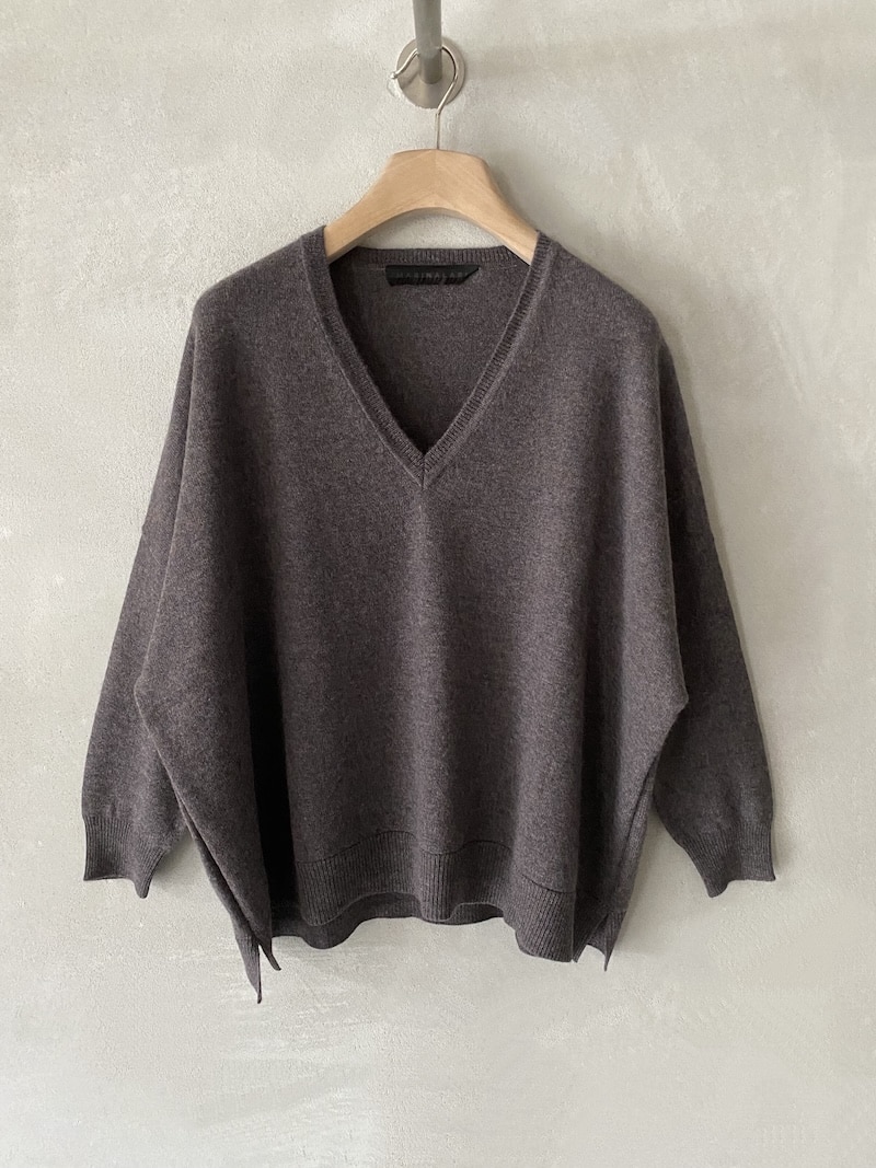 Maglia over boxi in cashmere melange, scollo a V profondo, completamente aperto ai lati, manica 3/4. Misure taglia S: lunghezza 56 cm, larghezza 68 cm. Le misure delle taglie successive aumenteranno 2 cm in lunghezza e 4 cm in circonferenza.