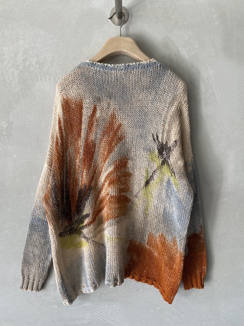 Maglia in seta dipinta a mano. Scollo tondo ampio, spalla calata. Vestibilità oversize.