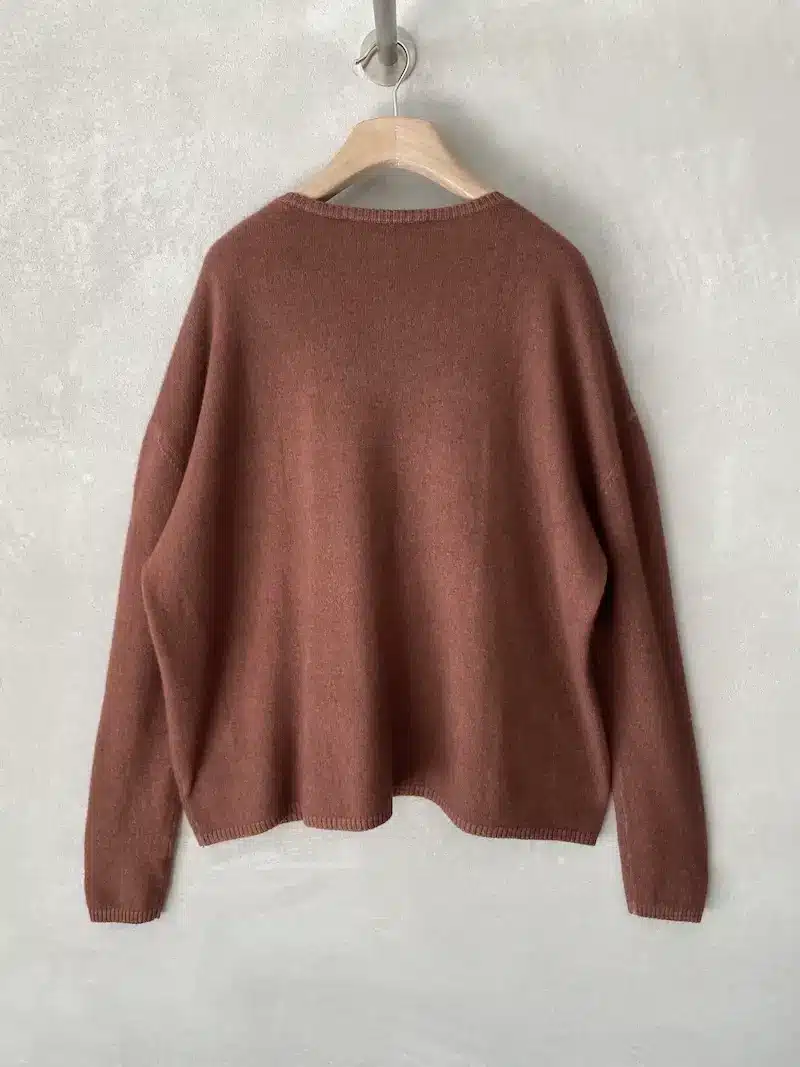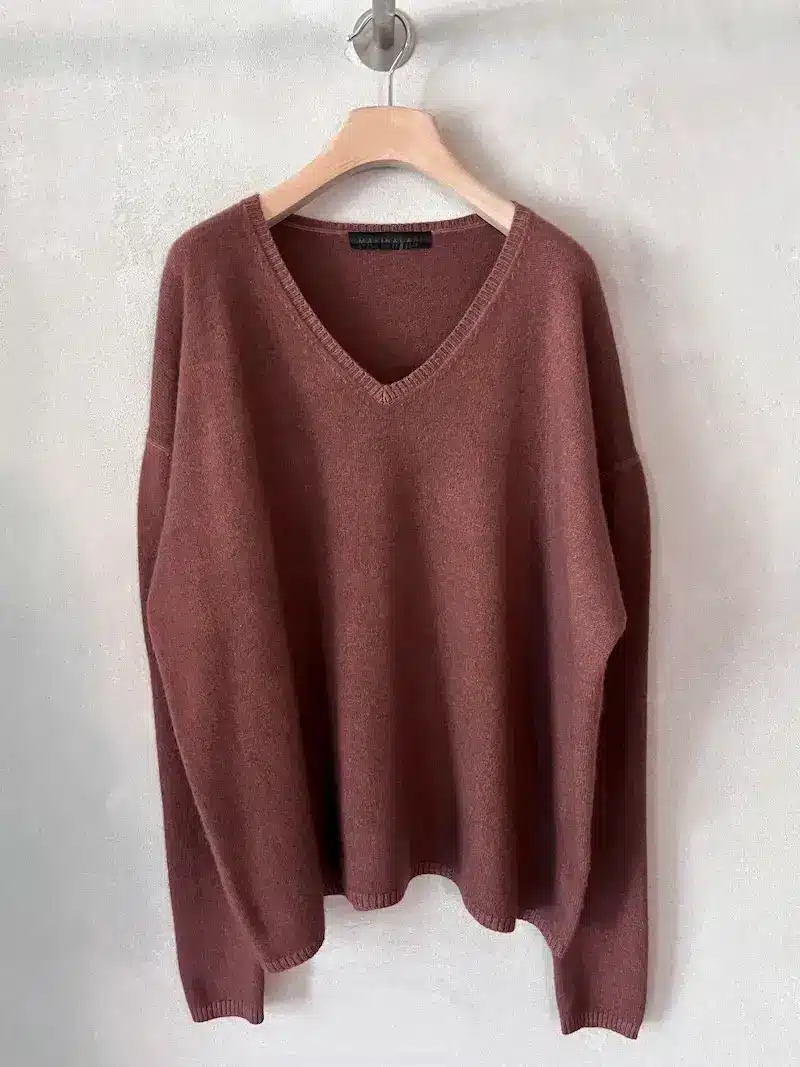 Maglia over in cashmere peso leggero delavè, scollo a V, spalla calata. Misure taglia I: lunghezza 64 cm, larghezza 66 cm. Le misure della taglia successiva aumenteranno 3 cm in lunghezza e 6 cm in circonferenza.