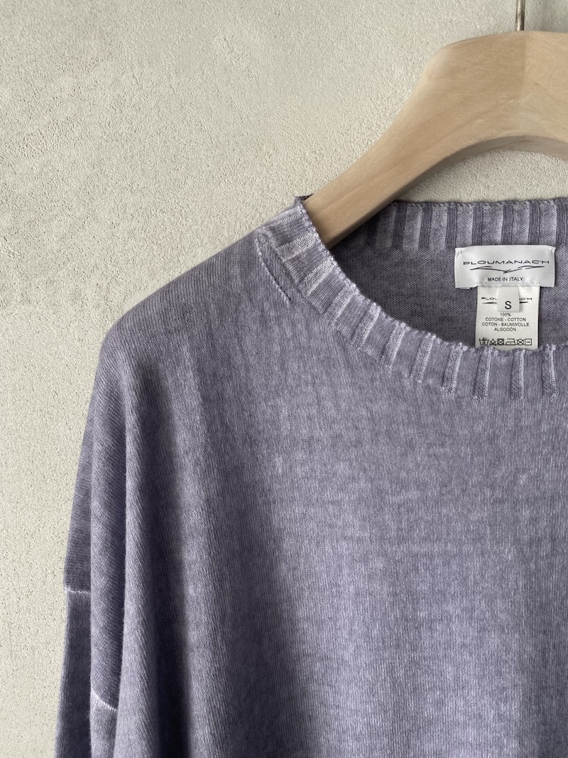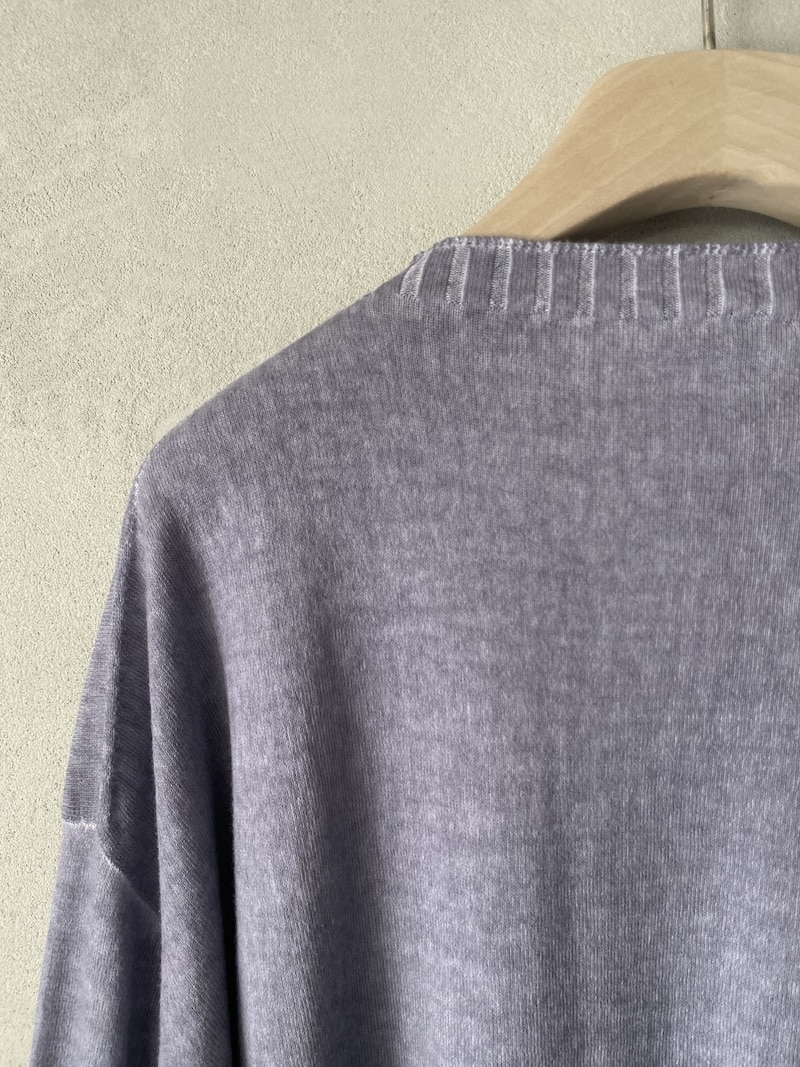 Maglia over leggera in cotone, scollo tondo ampio, spalla calata. Fit oversize.