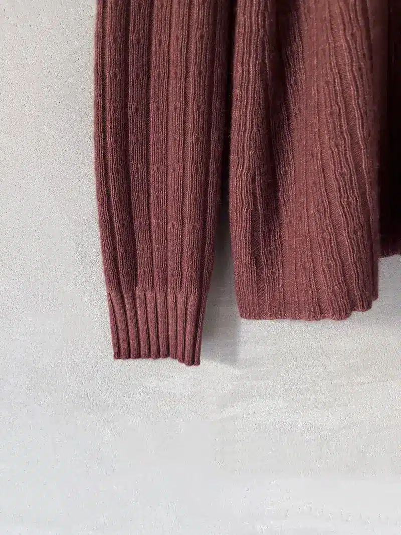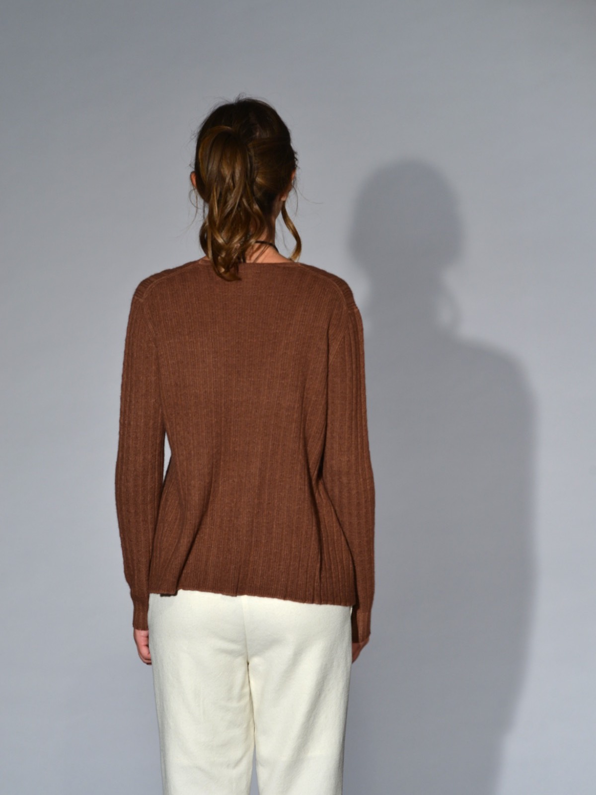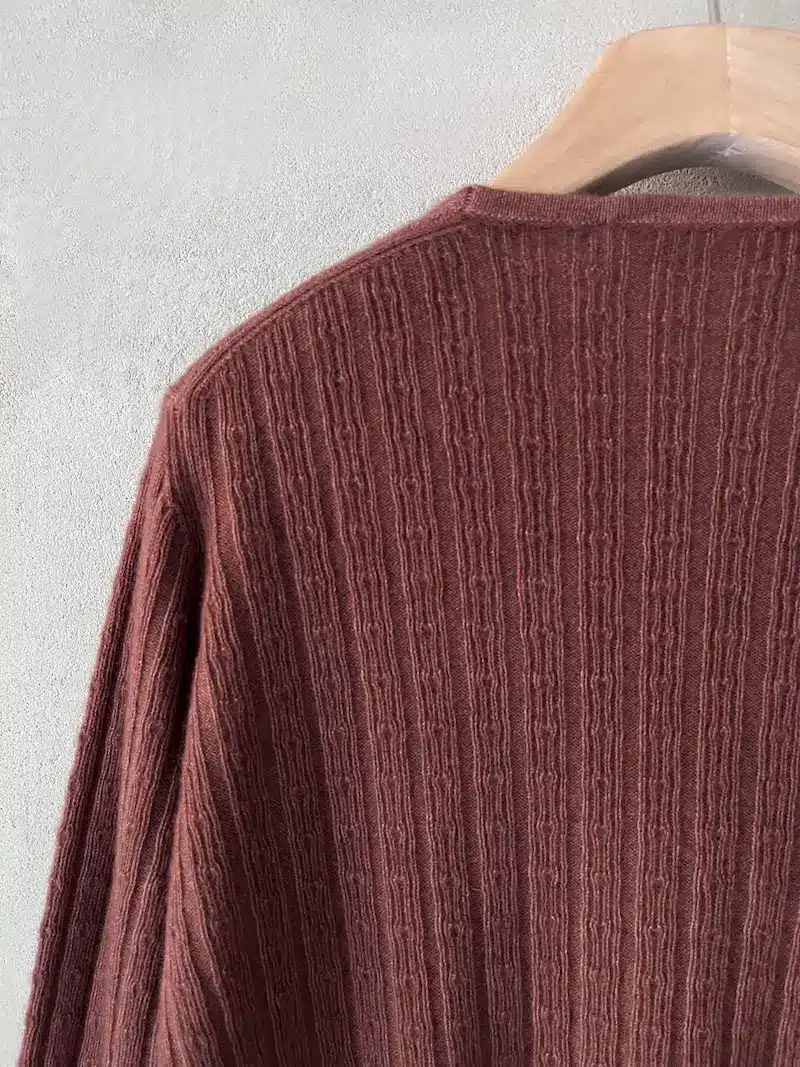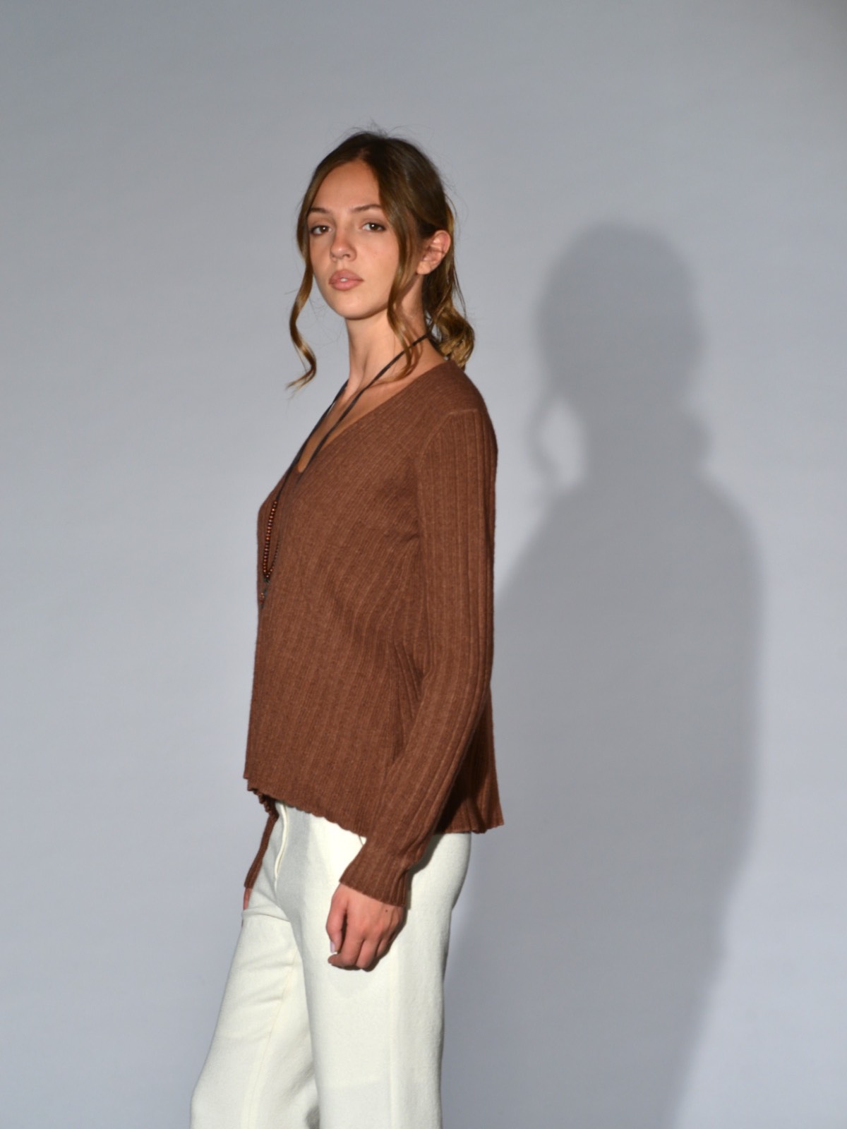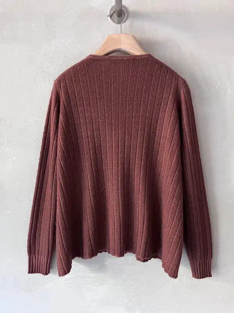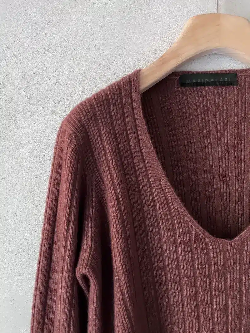 Maglia svasata in cashmere delavè leggero con motivo pointelle, scollo a V profondo. Misure taglia I: lunghezza 60 cm, larghezza torace 48 cm, larghezza fondo 60 cm. Le misure della taglia successiva aumenteranno 3 cm in lunghezza e 6 cm in circonferenza.