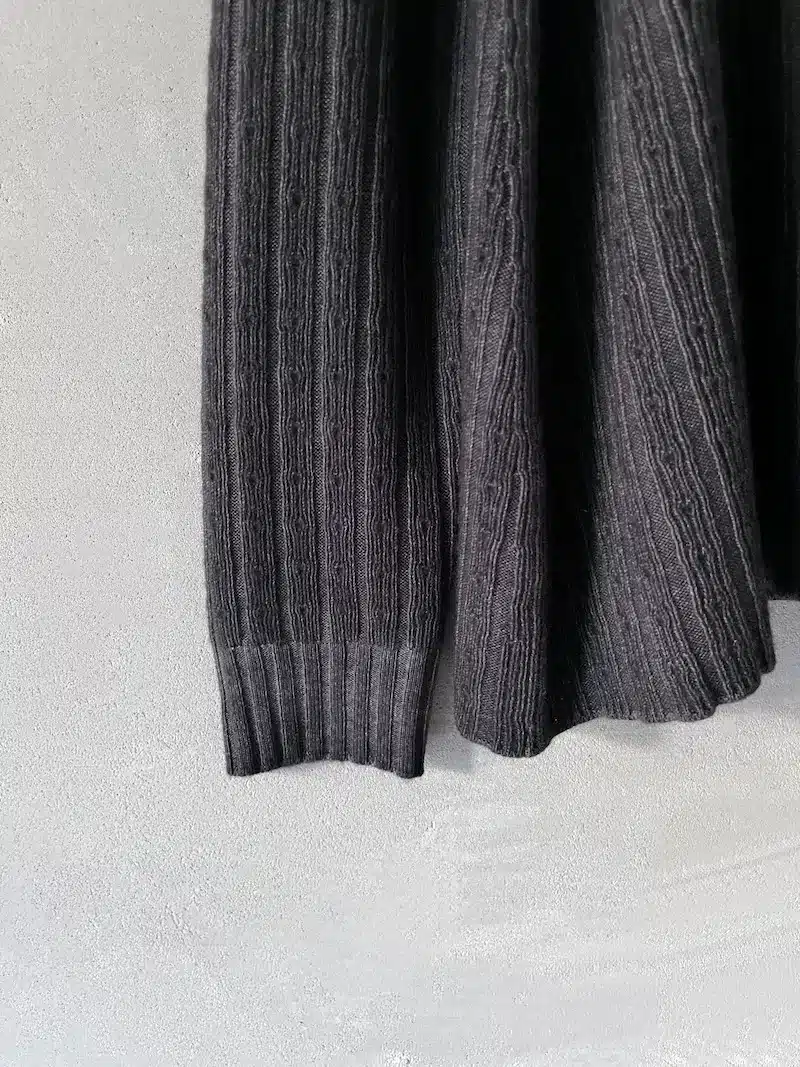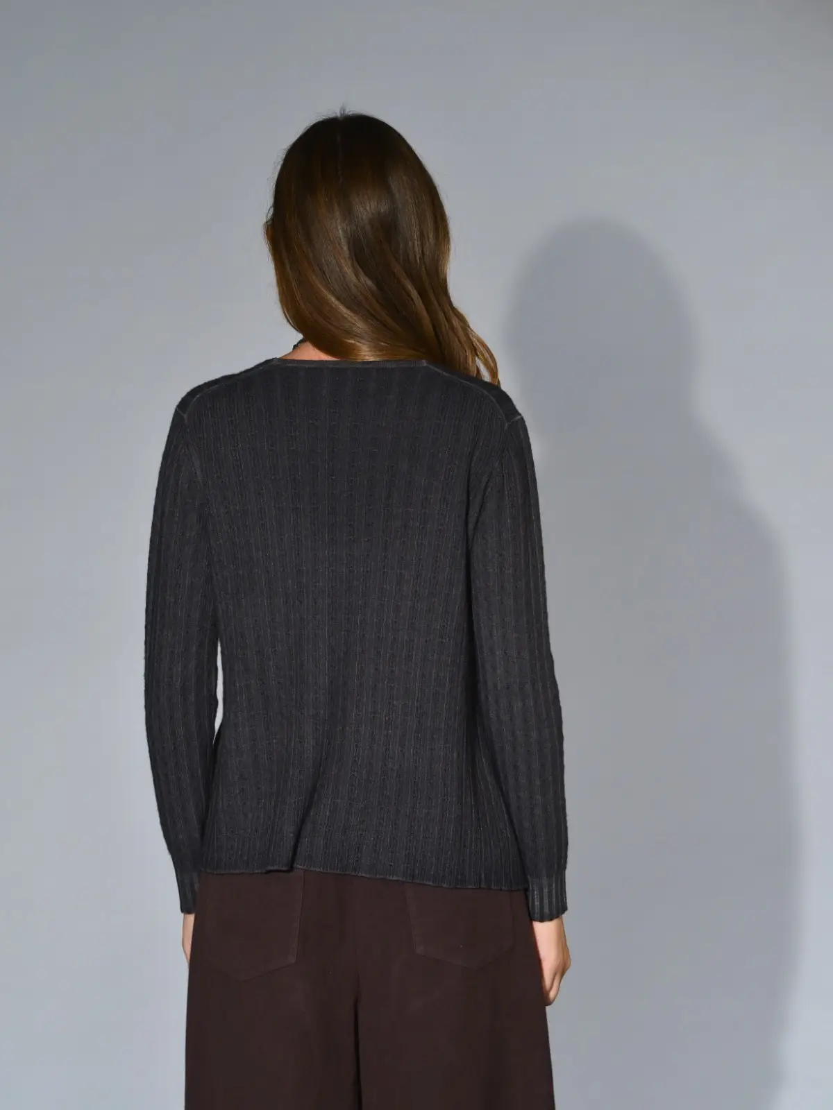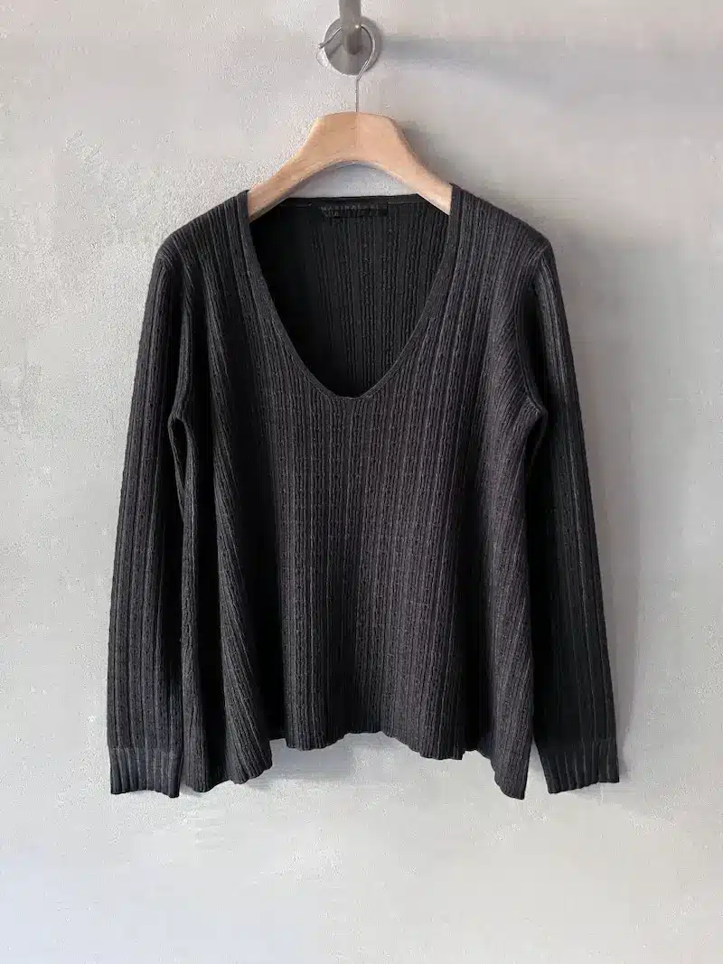Maglia svasata in cashmere delavè leggero con motivo pointelle, scollo a V profondo. Misure taglia I: lunghezza 60 cm, larghezza torace 48 cm, larghezza fondo 60 cm. Le misure della taglia successiva aumenteranno 3 cm in lunghezza e 6 cm in circonferenza.