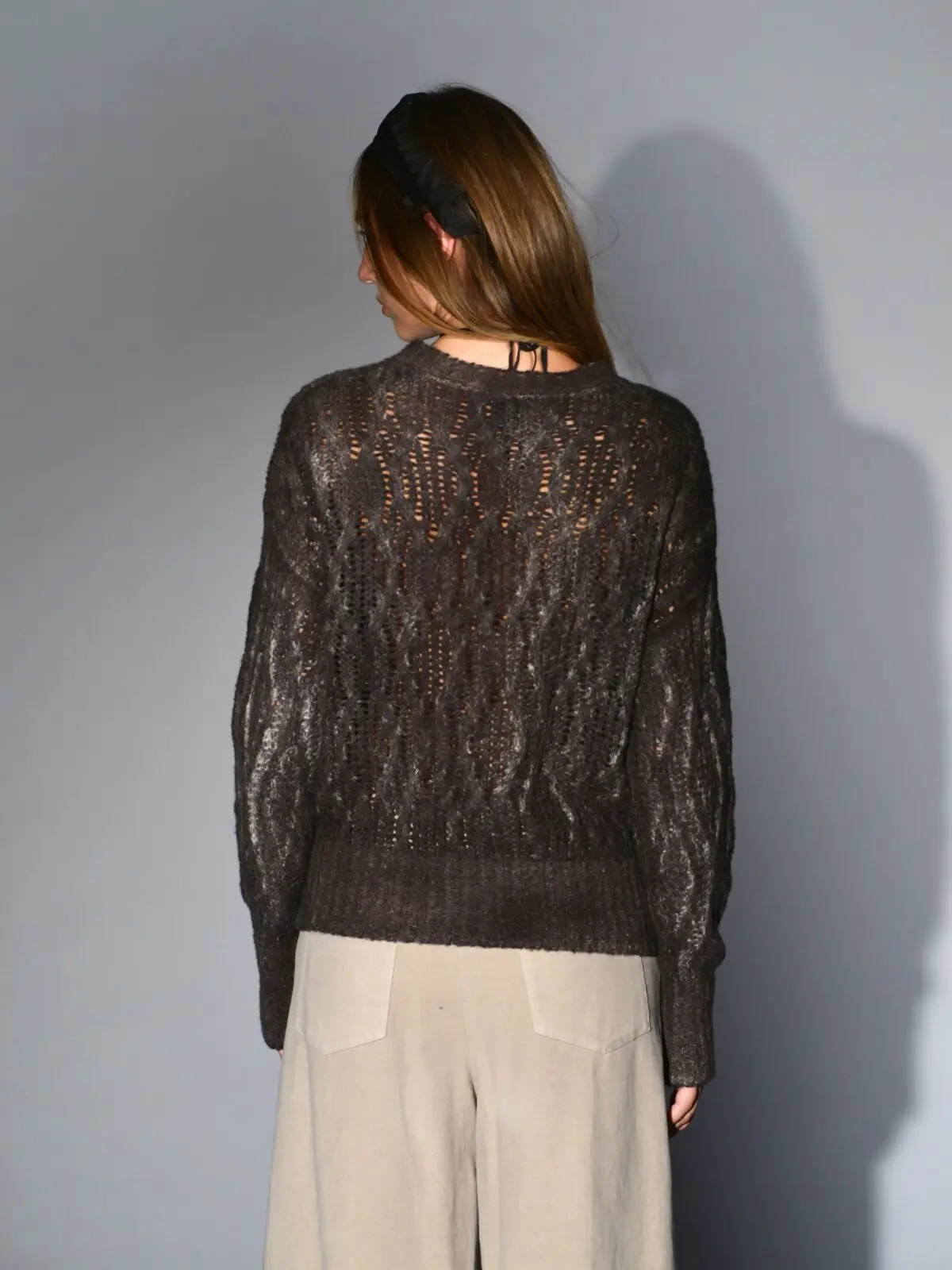 Maglia in cashmere e seta tinto a mano, punto maglia traforato, scollo tondo sceso, spalla calata, manica lunga. Misure taglia S: lunghezza 62 cm, larghezza torace 54 cm. Le misure delle taglie successive aumenteranno 2 cm in lunghezza e 4 cm in circonferenza.