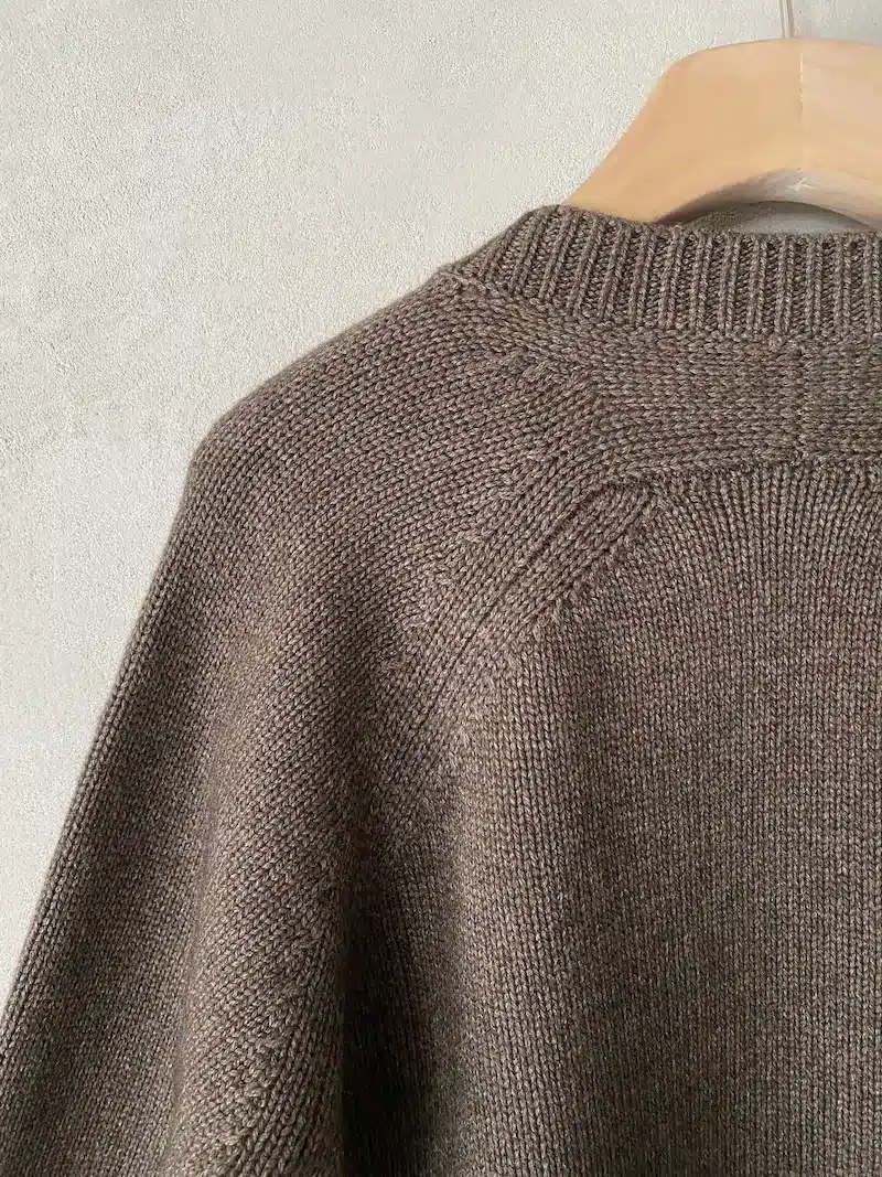 Maglione oversize in cashmere e lana, peso medio, scollo a V, spacco alto sul lato sinistro, manica raglan, giro manica sceso. Misure taglia I: lunghezza 62 cm, larghezza 56 cm. Le misure delle taglie successive aumenteranno 2 cm in lunghezza e 4 cm in circonferenza.