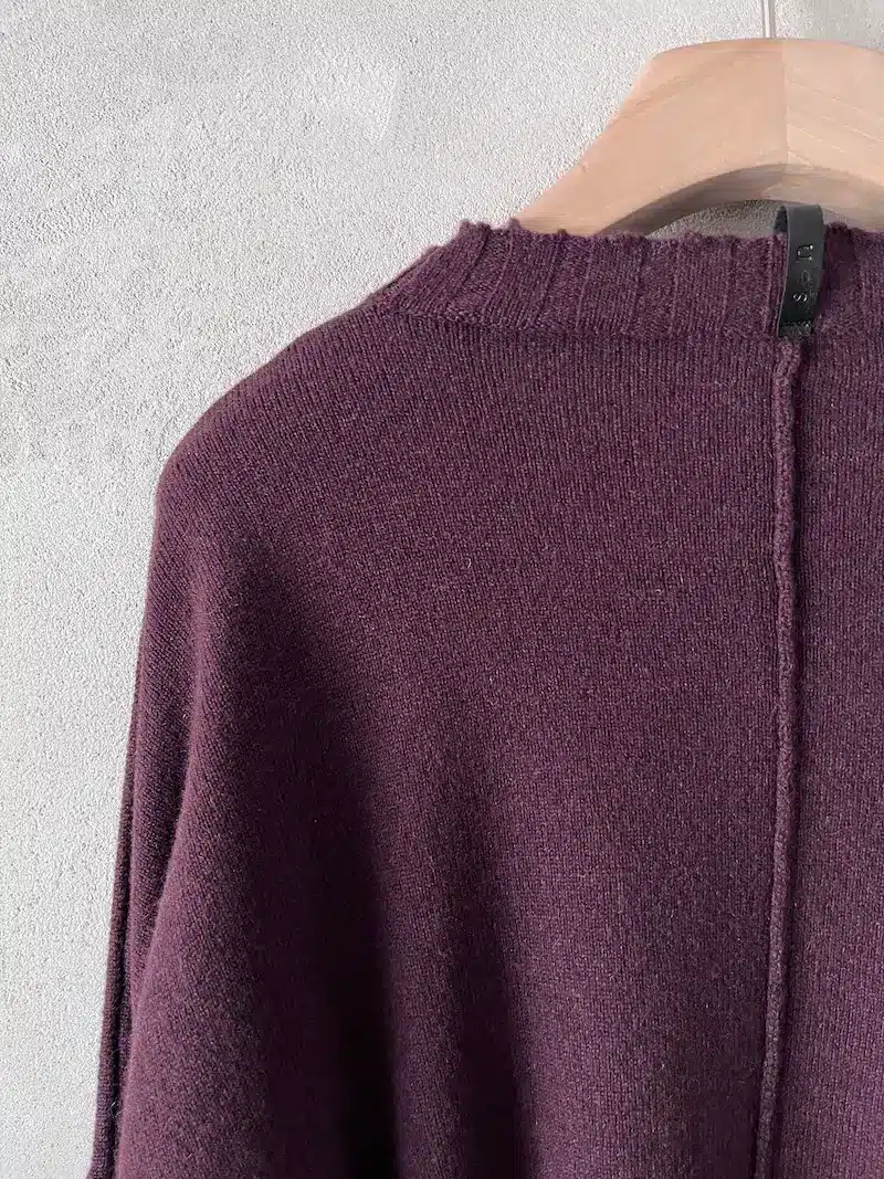 Maglia molto over in cashmere riciclato con lunghezze asimmetriche, scollo a U, manica lunga e spalla calata. Lunghezze 70/78 cm, larghezza 78 cm.
