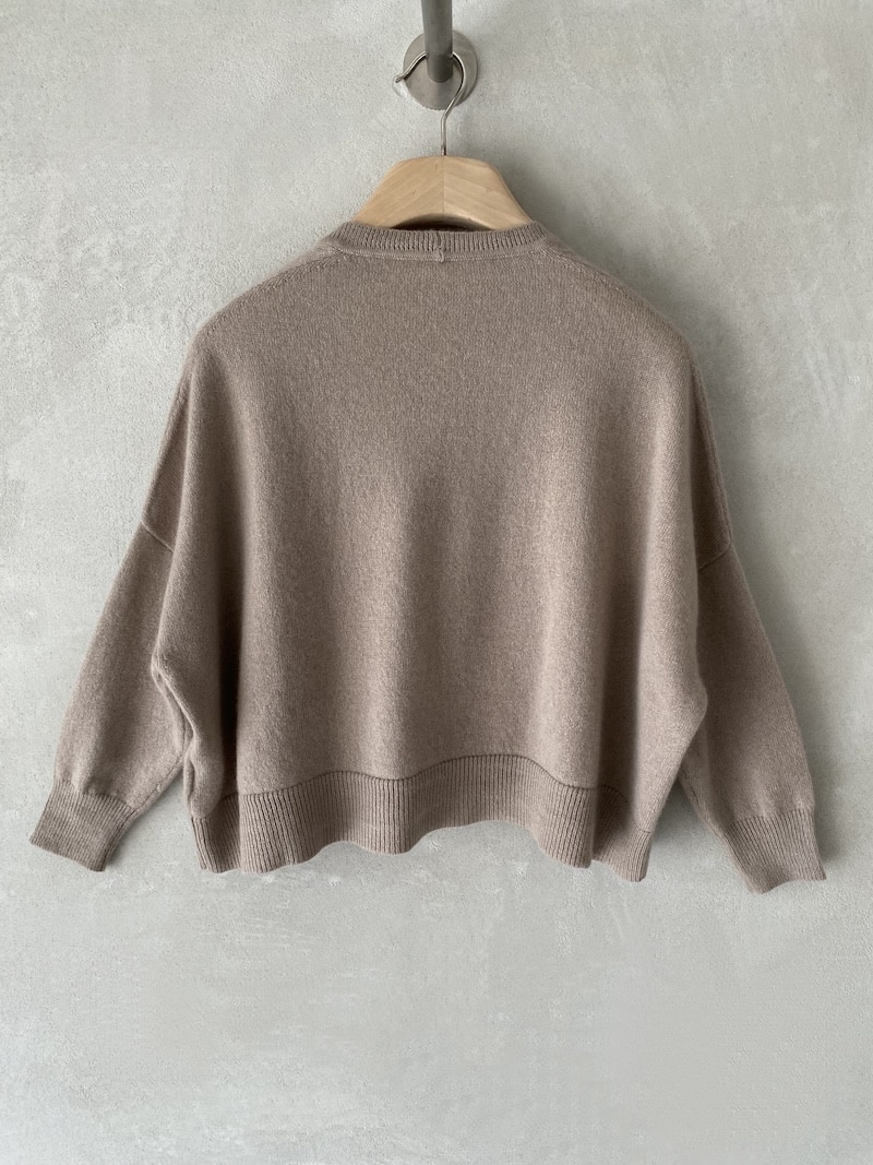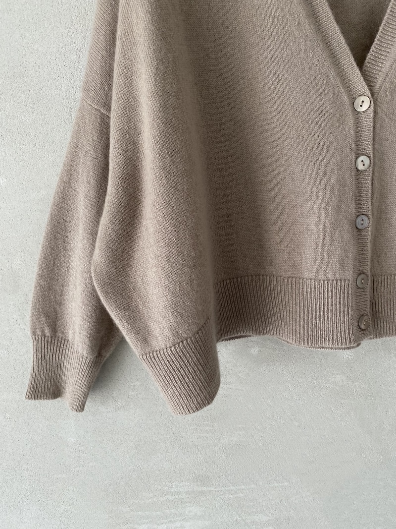 Mini cardigan in cashmere con scollo a V e chiusura frontale con bottoni. Spalla scesa e maniche a 3/4 con polsino a costina. Linea ampia e leggermente corta con volume morbido. Fondo rifinito con fascia a costina.