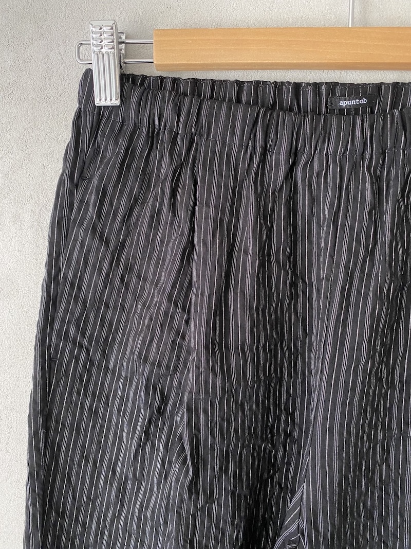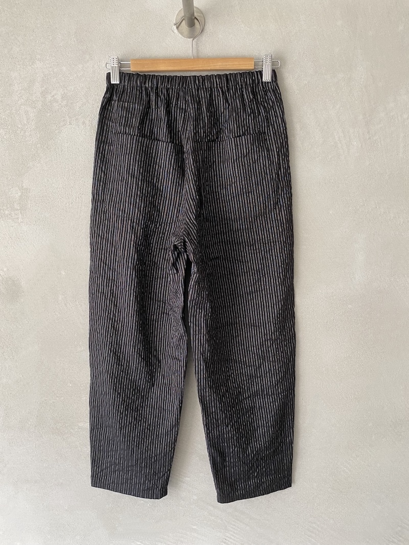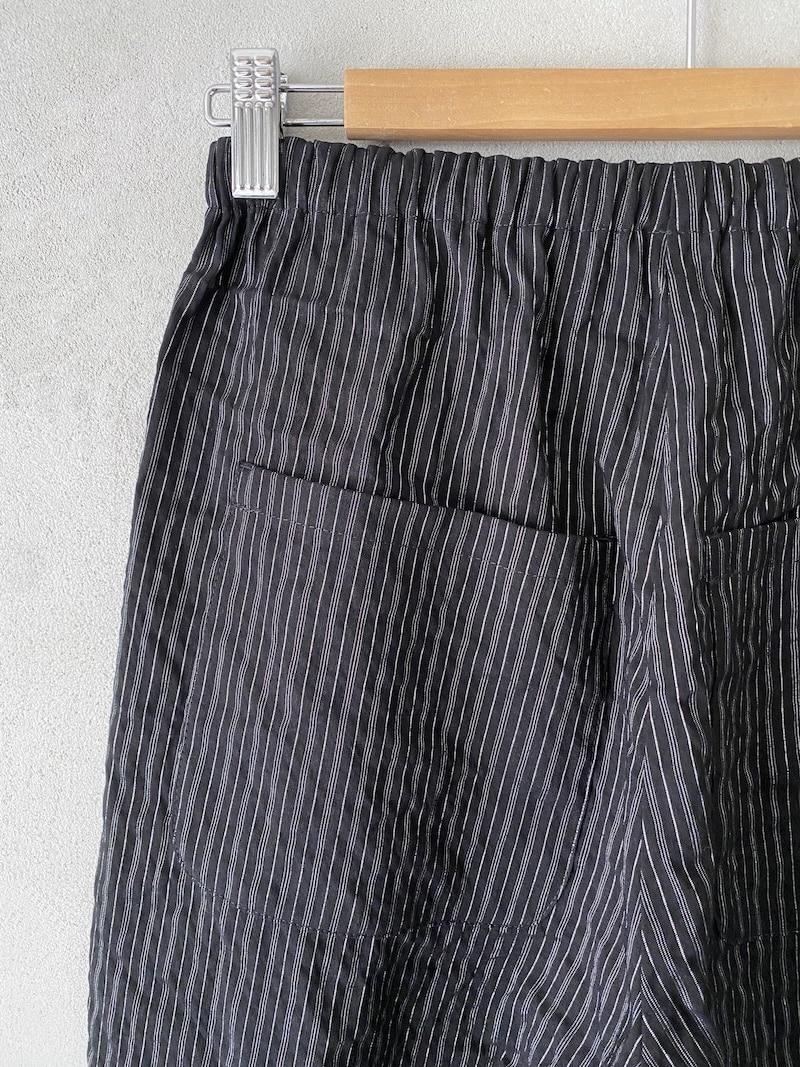 Pantalone in viscosa e lino a righe sottili. Vita con elastico basso e arricciatura. Linea dritta con volume morbido e gamba regolare. Due tasche laterali inserite in cucitura e due tasche applicate sul dietro. Fondo dritto con orlo impunturato. Vestibilità morbida.