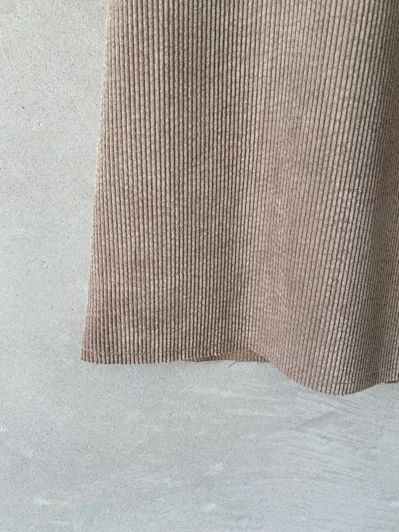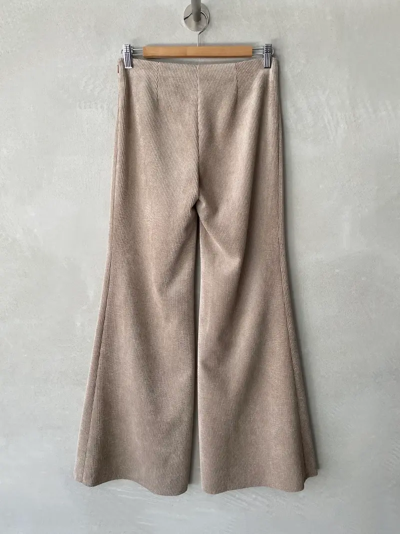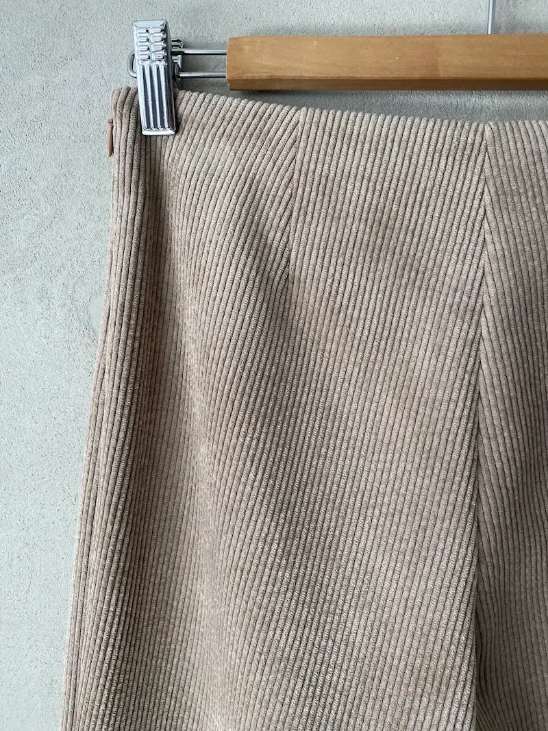 Pantaloni aderenti a zampa in velluto a coste, chiuso di lato con una zip invisibile, orlo a taglio vivo, vita media. Misure taglia 38: lunghezza 108 cm,  circonferenza vita 72 cm. Le misure delle taglie successive aumenteranno 2 cm in lunghezza e 4 cm in circonferenza.