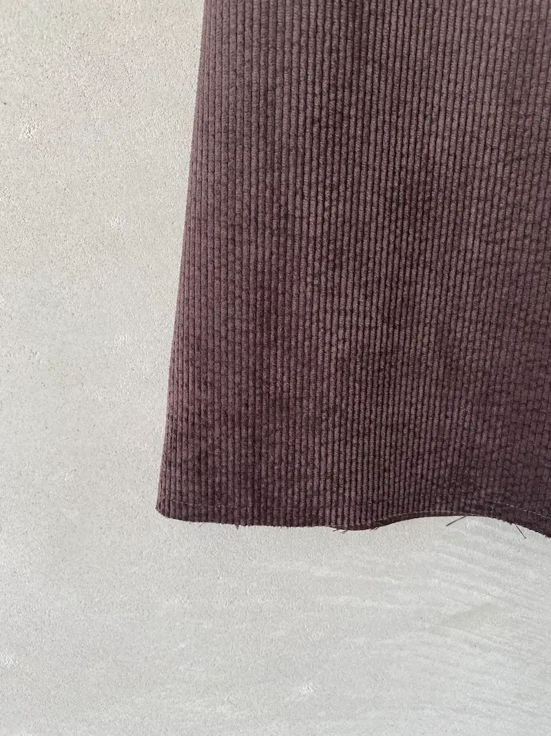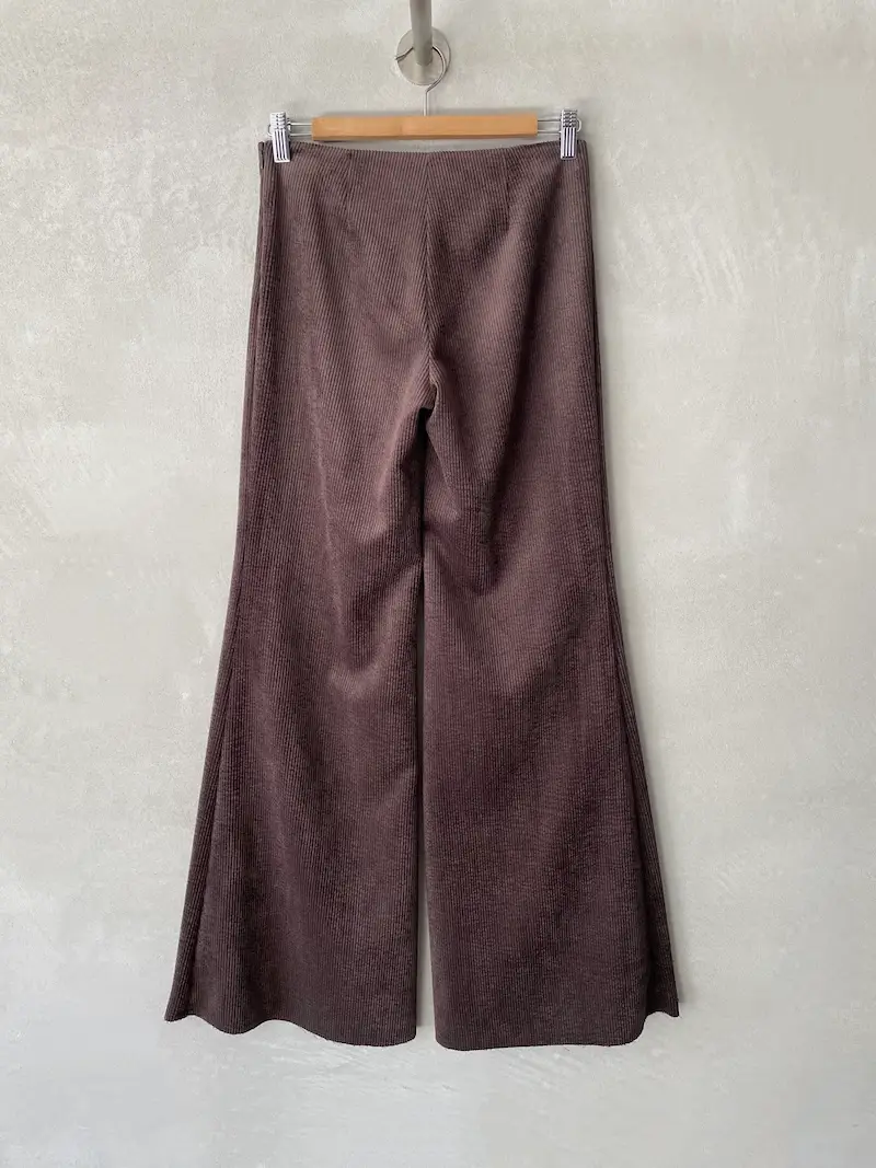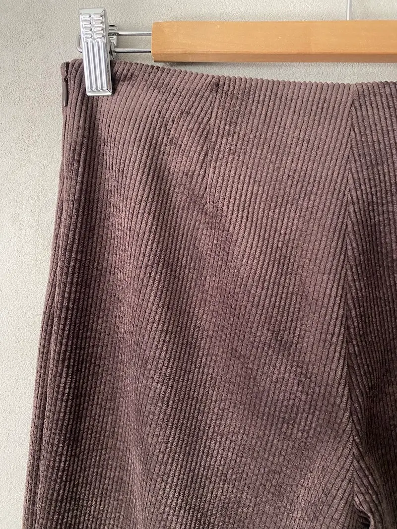 Pantaloni aderenti a zampa in velluto a coste, chiuso di lato con una zip invisibile, orlo a taglio vivo, vita media. Misure taglia 38: lunghezza 108 cm, circonferenza vita 72 cm. Le misure delle taglie successive aumenteranno 2 cm in lunghezza e 4 cm in circonferenza.