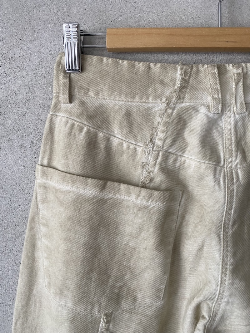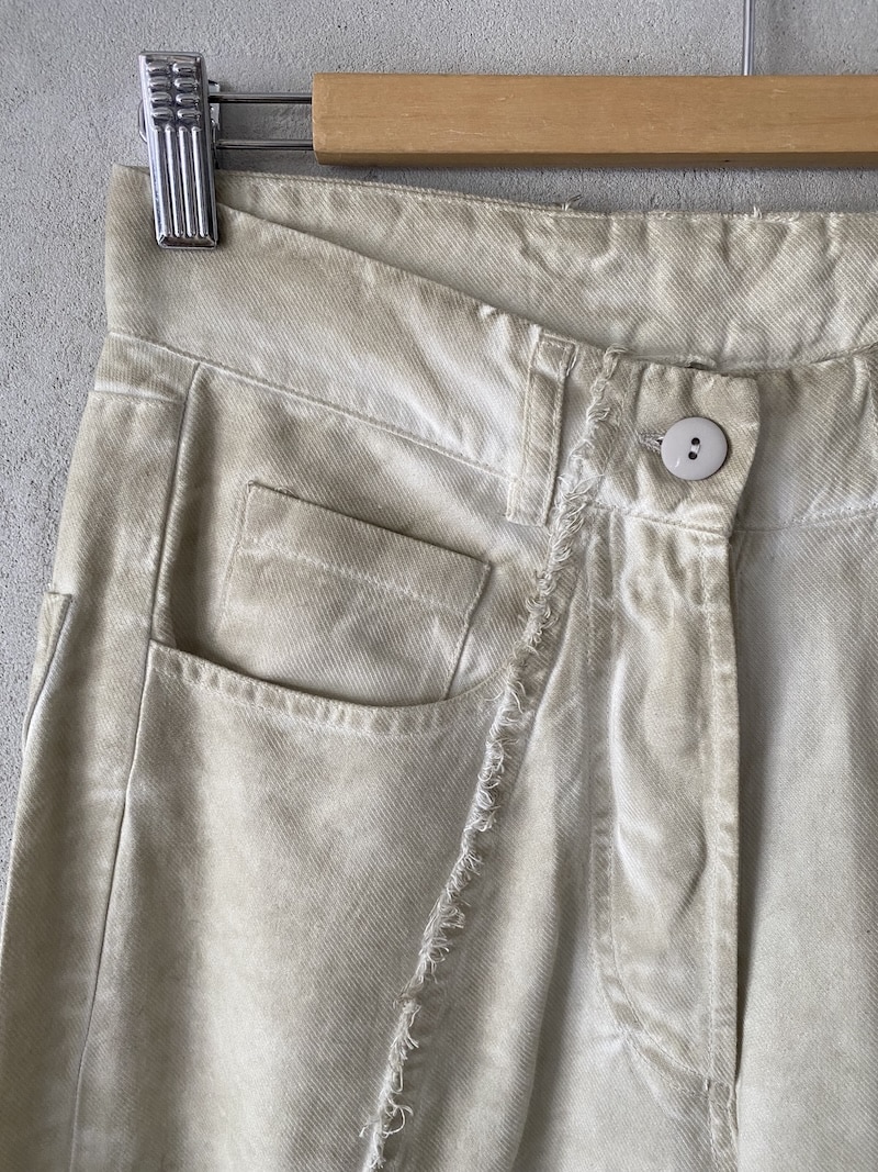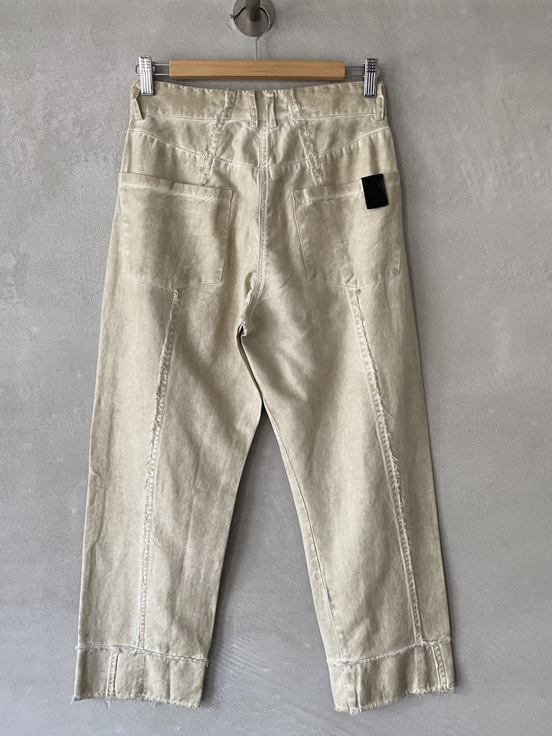 Pantaloni crop in tessuto denim. Modello cinque tasche, cintura con passanti, chiusura frontale con bottoni e patta. Orlo e cuciture centrali a vivo sfilacciato. Vestibilità over.