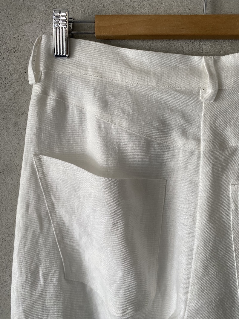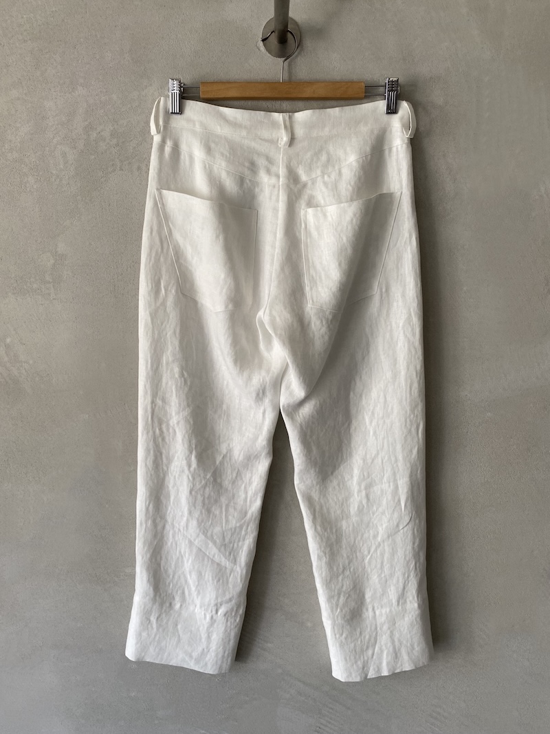 Pantaloni alla caviglia in tessuto di lino dalla texture leggermente stropicciata. Presentano cavallo basso e costruzione a 5 tasche, con due tasche frontali, taschino e tasche posteriori. Vita media con cinturino dotato di passanti, chiusura frontale con zip e patta. Linea dritta con vestibilità confortevole.