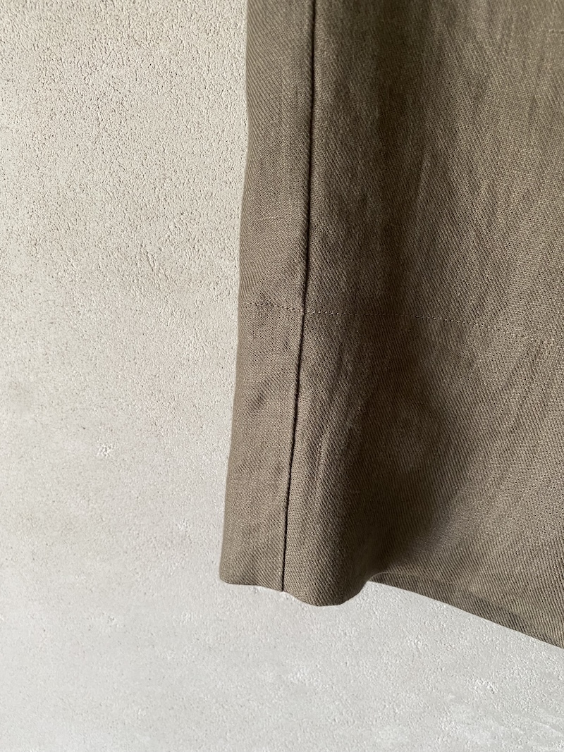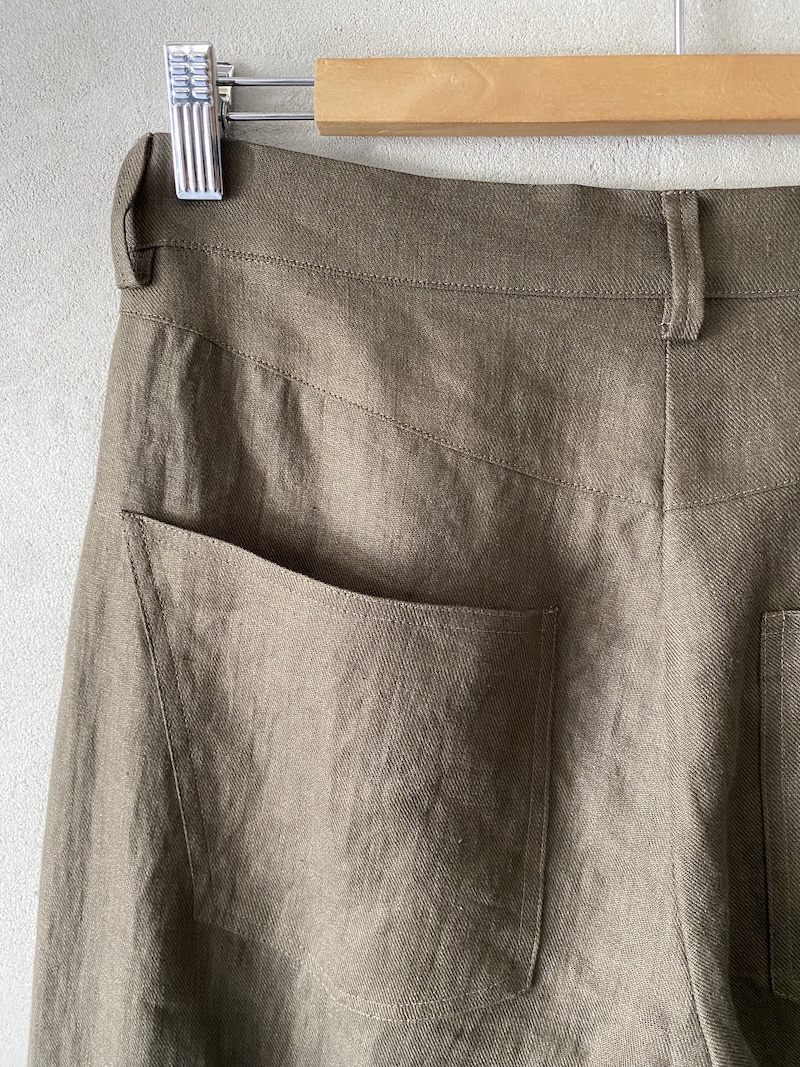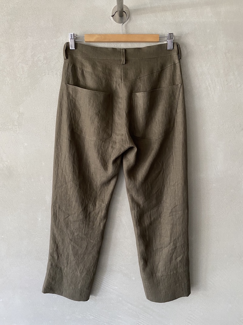 Pantaloni alla caviglia in tessuto di lino dalla texture leggermente stropicciata. Presentano cavallo basso e costruzione a 5 tasche, con due tasche frontali, taschino e tasche posteriori. Vita media con cinturino dotato di passanti, chiusura frontale con zip e patta. Linea dritta con vestibilità confortevole.