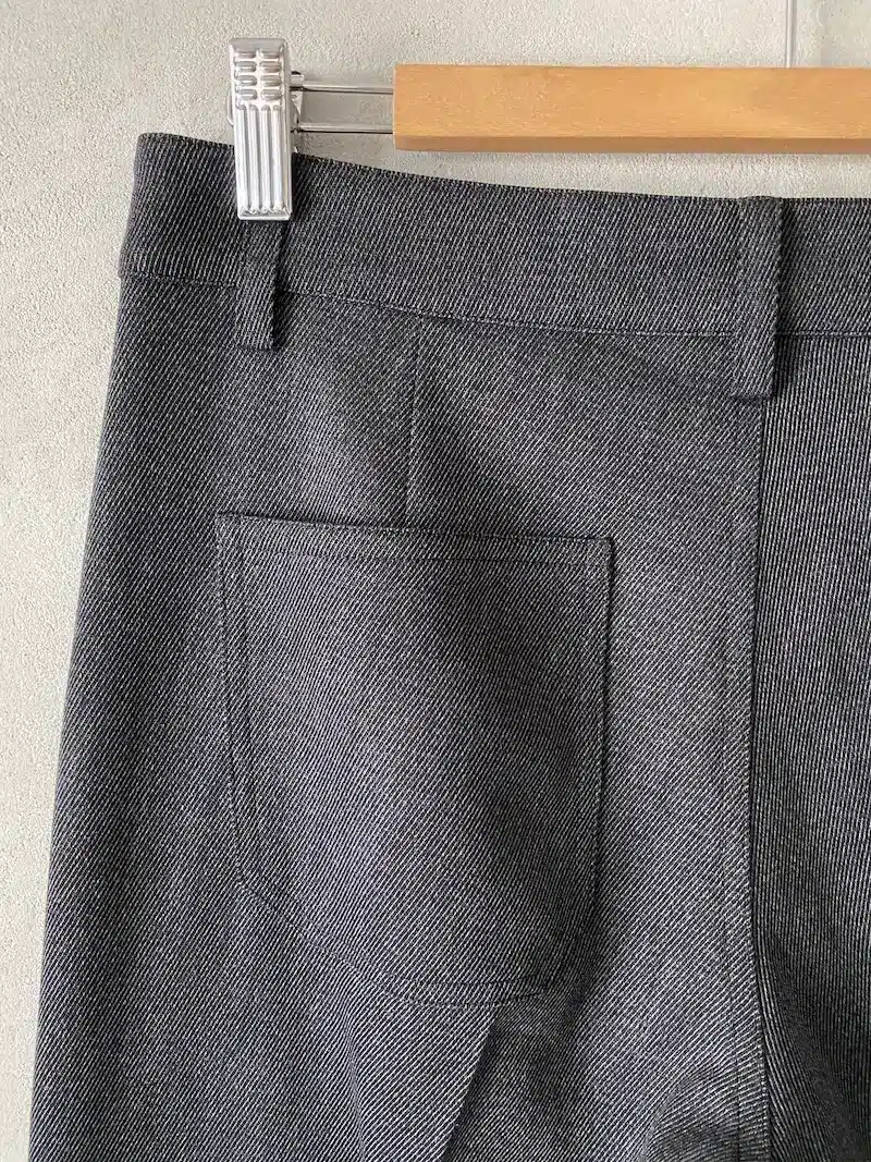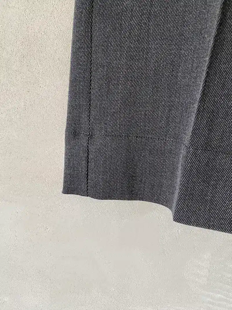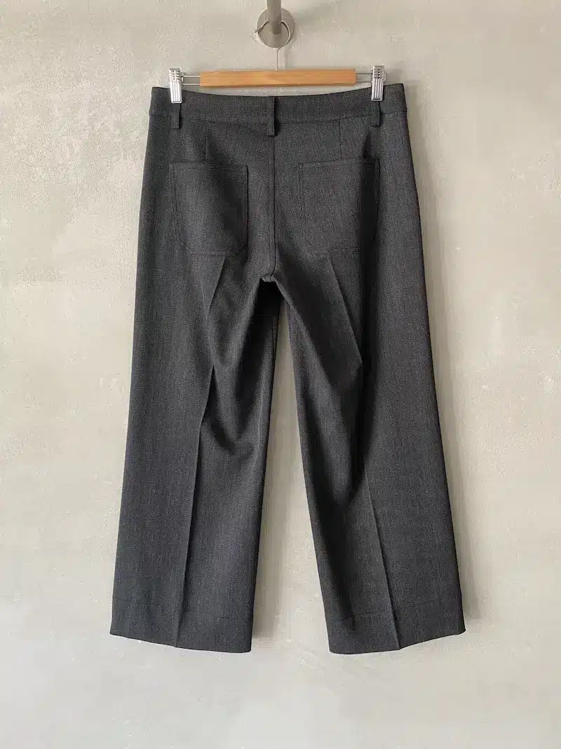 Pantaloni corti alla caviglia in tessuto melange con trama diagonale, gamba dritta, vita media, due tasche oblique laterali davanti, due tasche a toppa dietro, cintura con passanti, chiuso davanti con zip e bottone. Misure taglia 38: lunghezza 92 cm, circonferenza vita 80 cm. Le misure delle taglie successive aumenteranno 2 cm in lunghezza e 4 cm in circonferenza.
