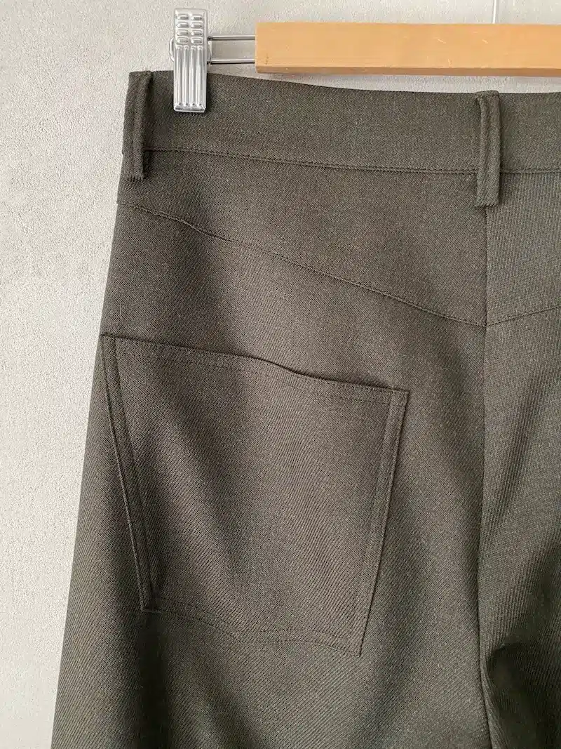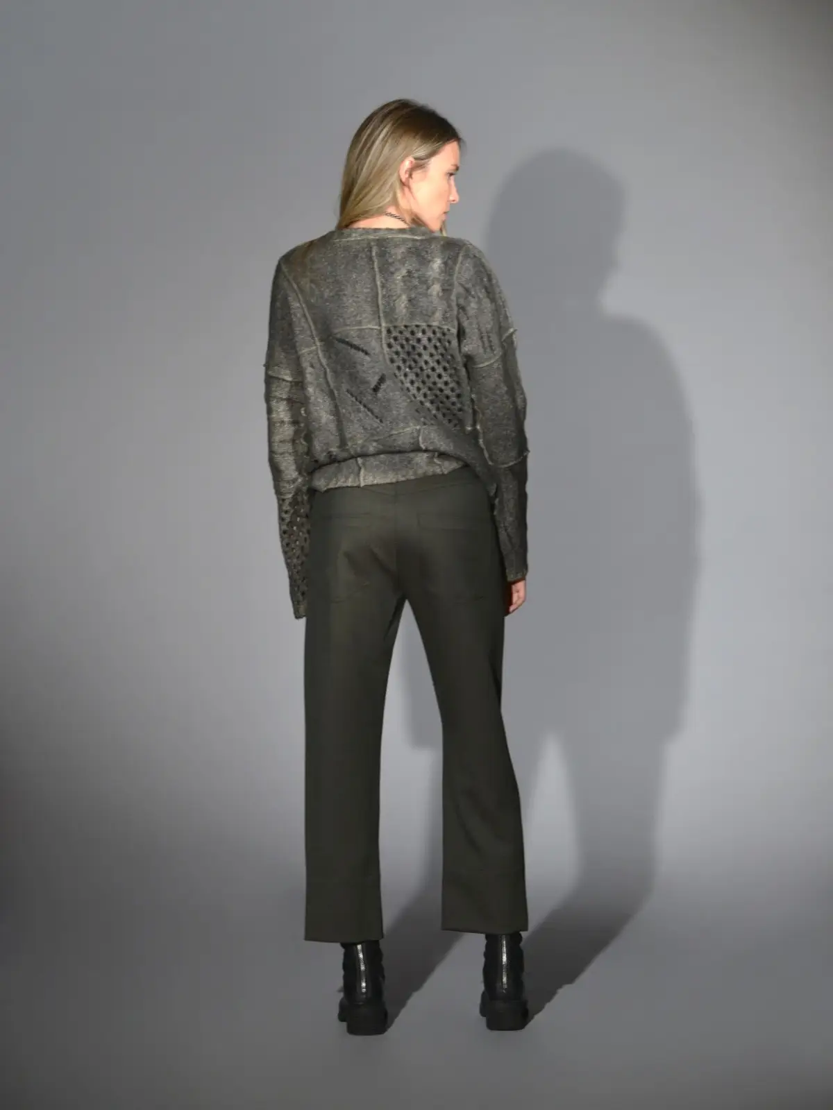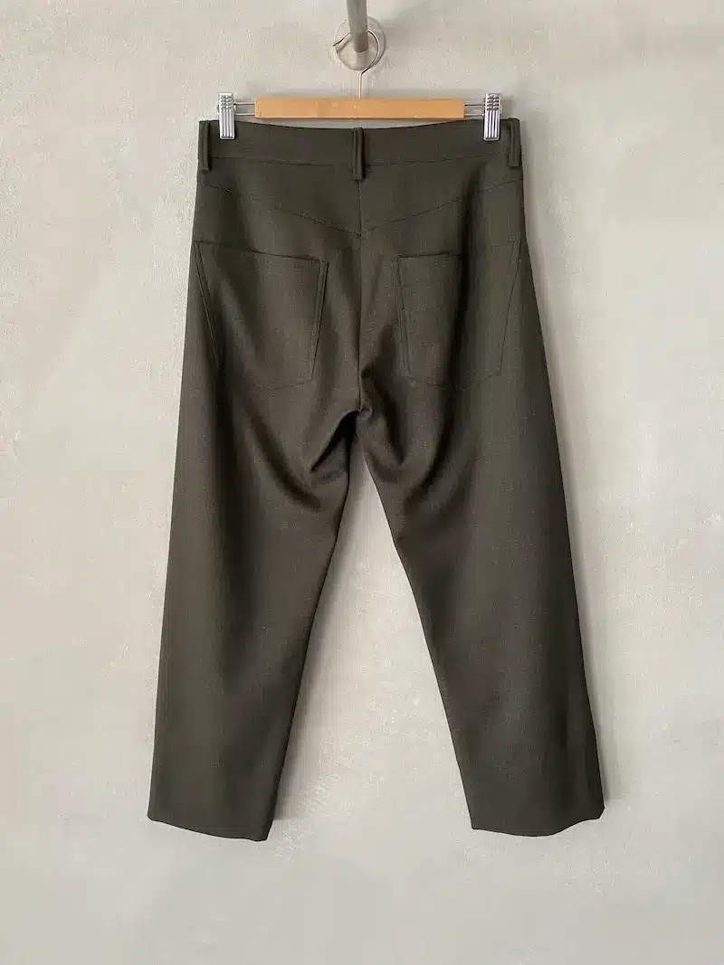Pantaloni corti alla caviglia in tessuto melange con trama diagonale, gamba dritta, vita media, due tasche oblique laterali davanti, due tasche a toppa dietro, cintura con passanti, chiuso davanti con zip e bottone. Misure taglia 38: lunghezza 92 cm, circonferenza vita 80 cm. Le misure delle taglie successive aumenteranno 2 cm in lunghezza e 4 cm in circonferenza.