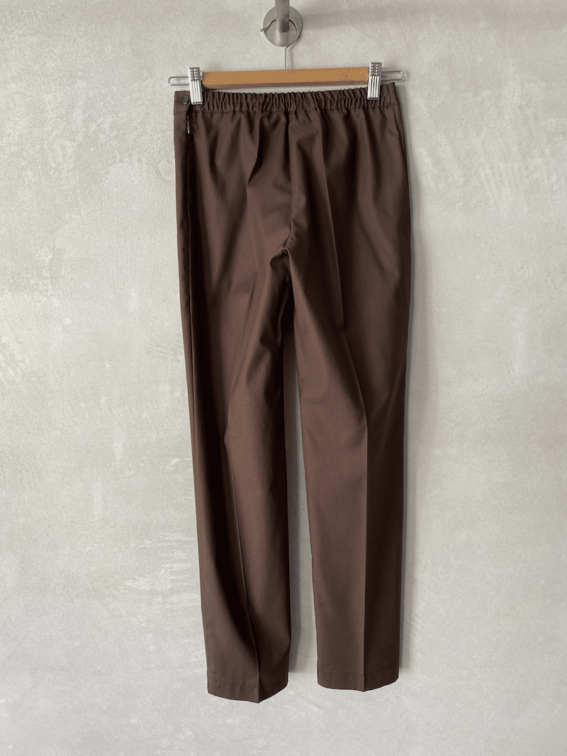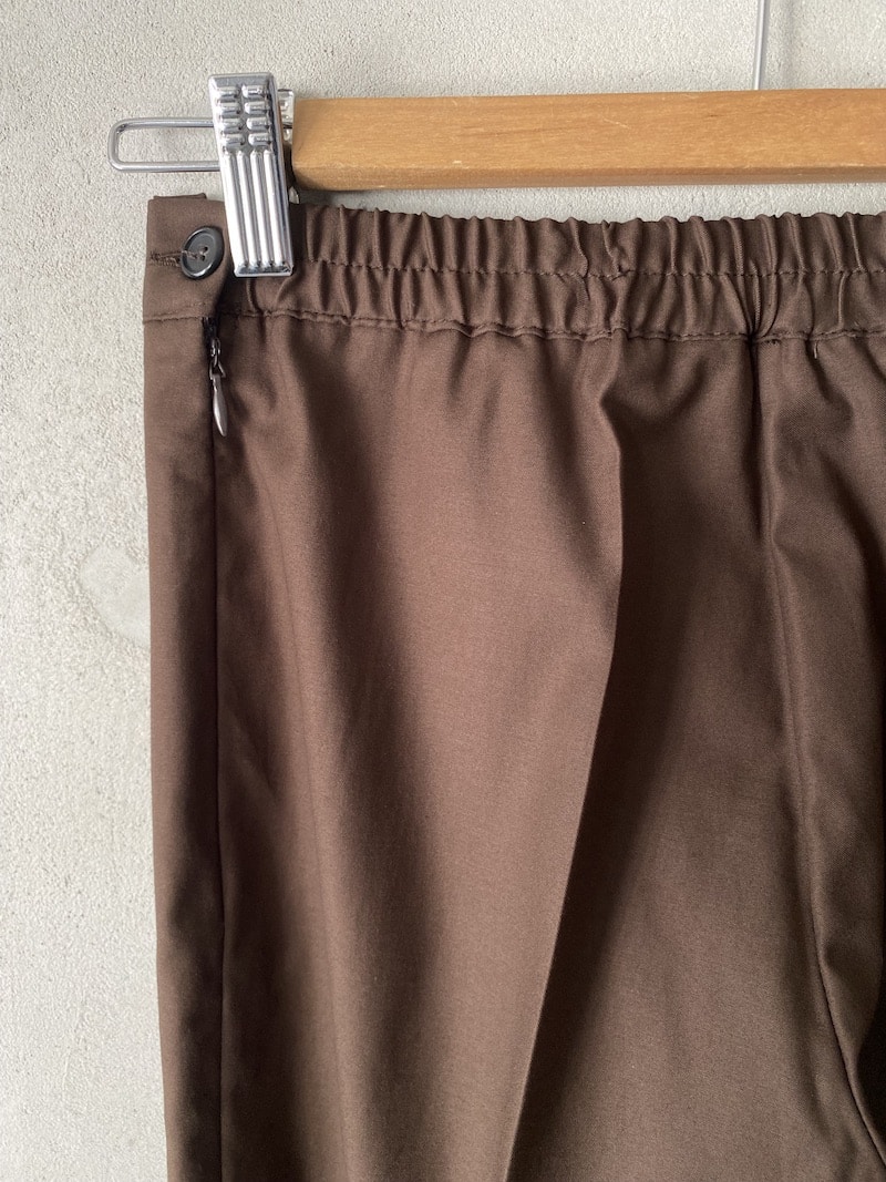 Pantaloni corti alla caviglia in cotone elasticizzato, lunghezza 92 cm, cintura con elastico dietro chiusa di lato con zip e bottone.