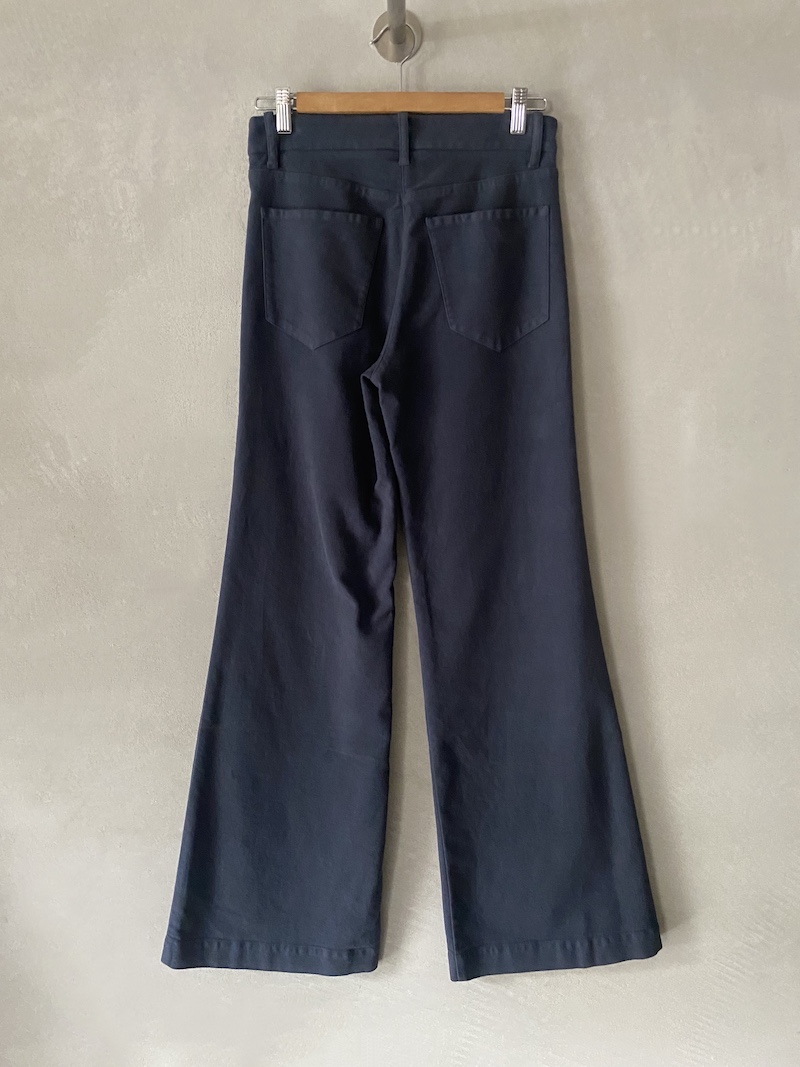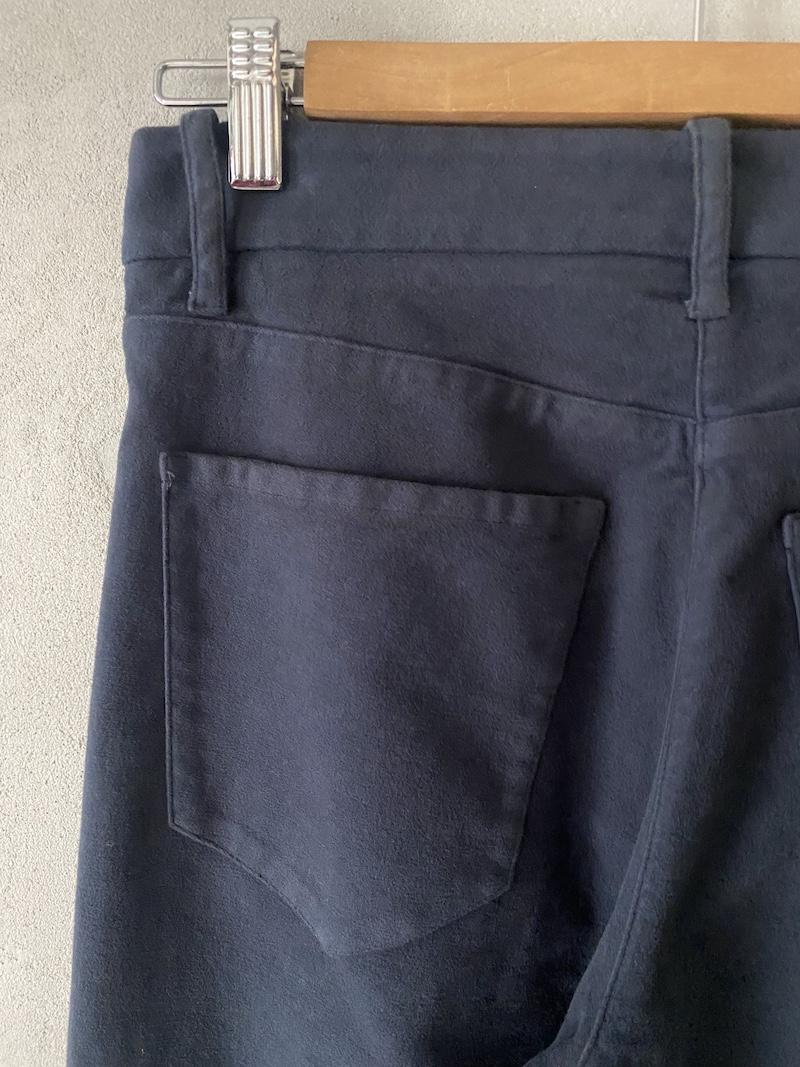 Pantaloni gamba dritta in fustagno di cotone, modello jeans con 4 tasche, due tasche a toppa dietro, chiuso con zip e bottone, cintura con passanti. Misure taglia 38: lunghezza 110 cm, circonferenza cintura 72 cm, ampiezza fondo orlo 31 cm. Le taglie successive aumenteranno di 2 cm in lunghezza e 4 cm in circonferenza.