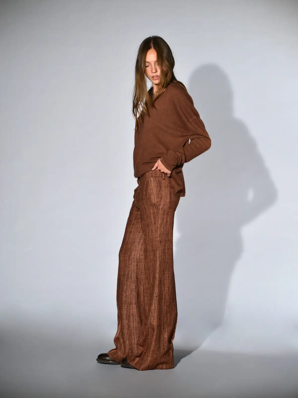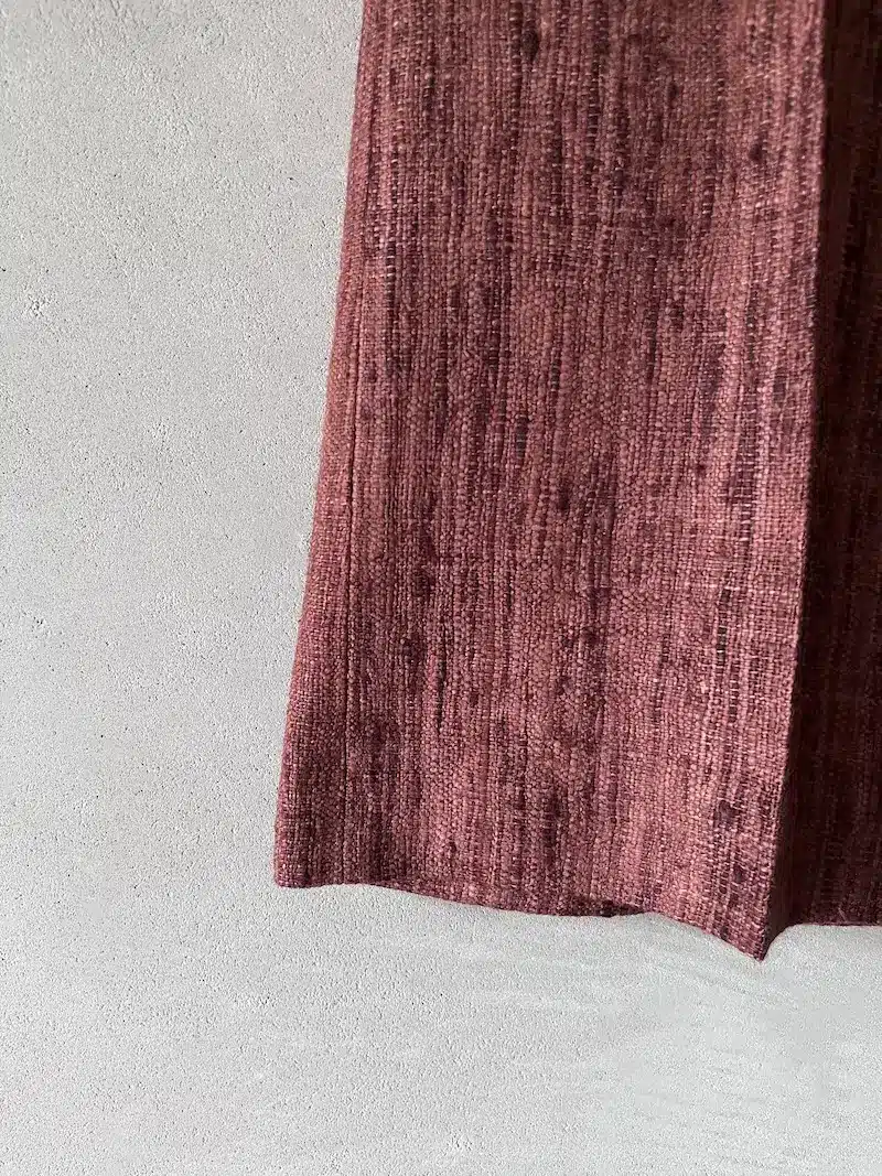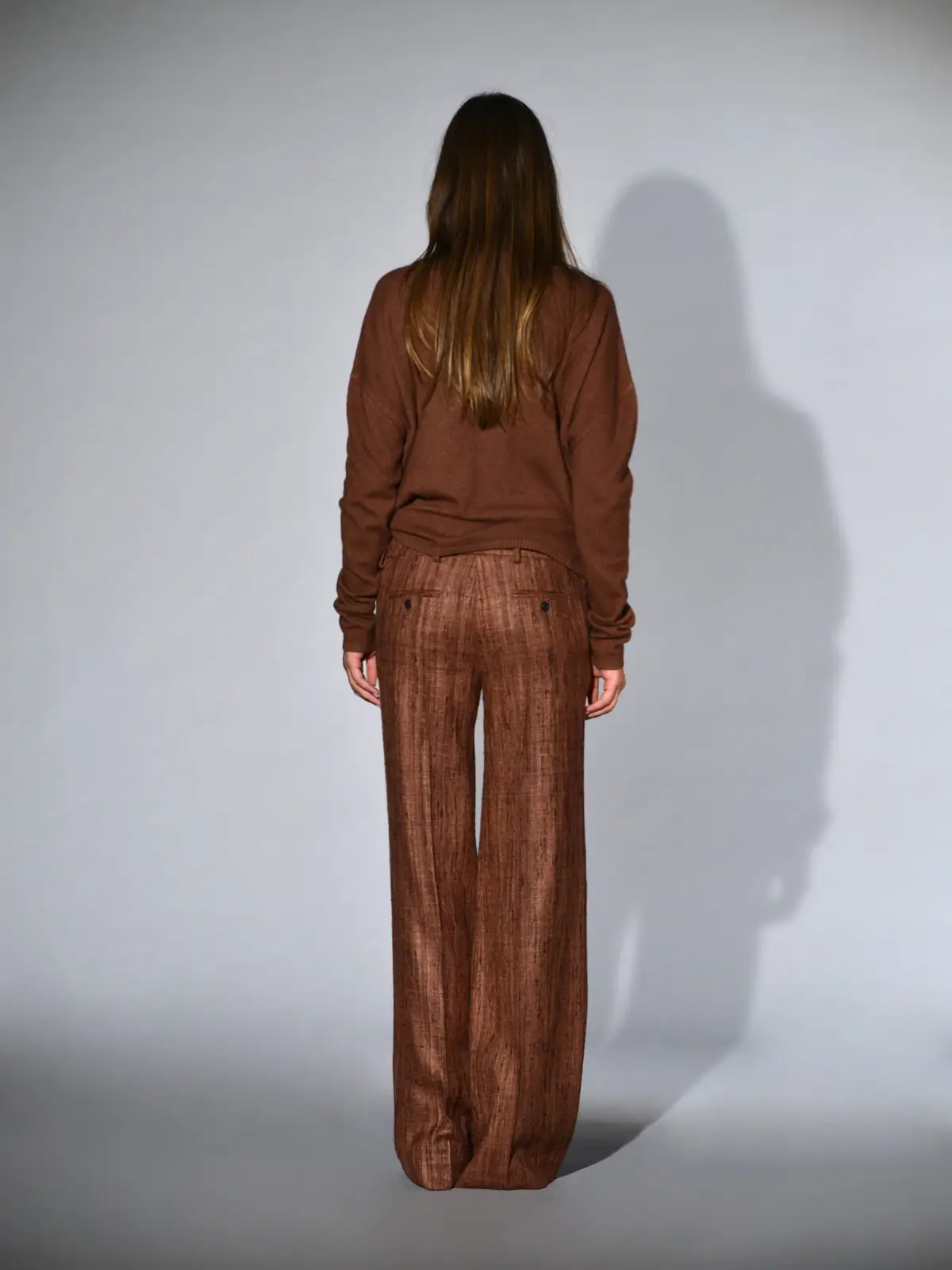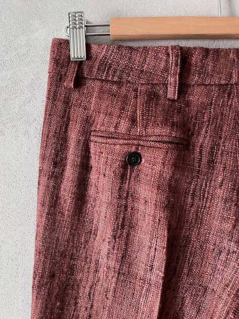 Pantaloni in seta burette con gamba dritta leggermente svasata in fondo, vita bassa, cintura con passanti chiusa con 1 bottone, chiusura centrale davanti con zip e patta, 2 tasche oblique laterali, 2 tasche posteriori a filetto chiuse con asola e bottone. Misure tg. 38: lunghezza 106 cm, circonferenza cintura 76 cm, circonferenza fianchi 92 cm. Le misure delle taglie successive aumenteranno 1 cm in lunghezza e 4 cm in circonferenza.