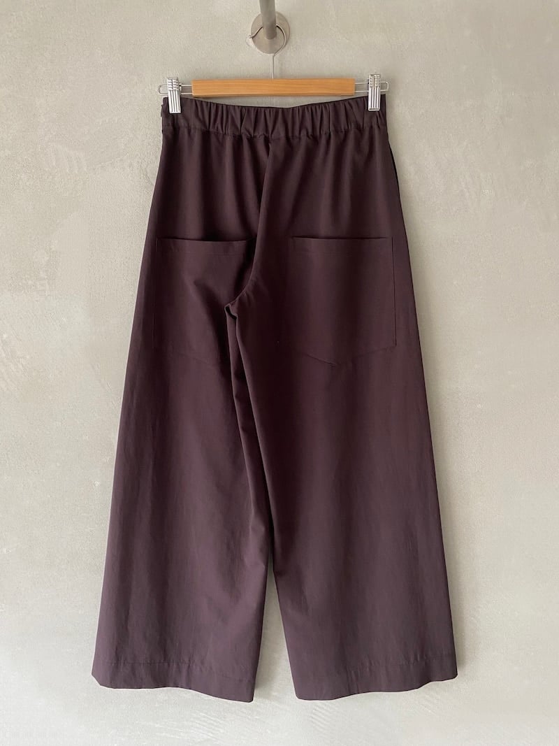 Pantaloni in lino e viscosa. Vita liscia sul davanti con elastico sul retro. Linea ampia con volume morbido e gamba larga. Due tasche laterali inserite in cucitura e due tasche applicate sul dietro. Fondo dritto con orlo impunturato. Vestibilità regolare.