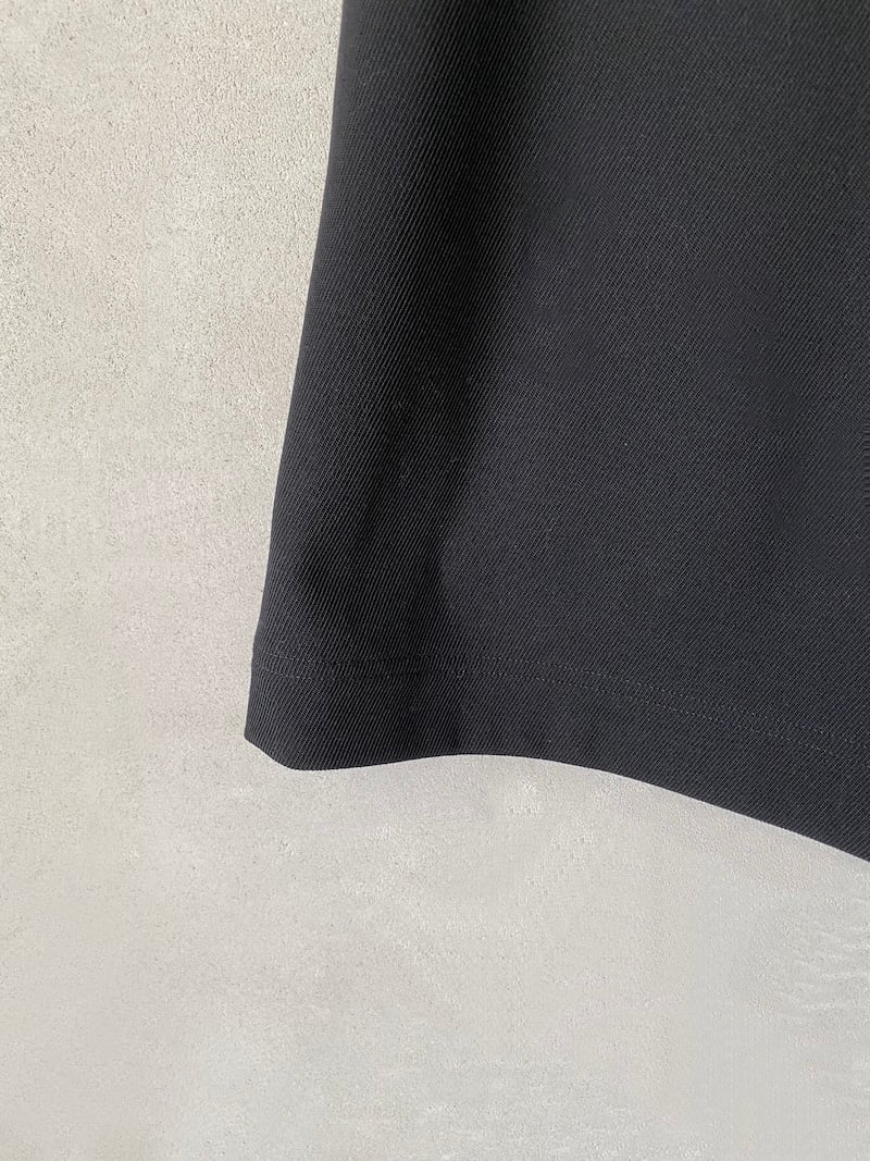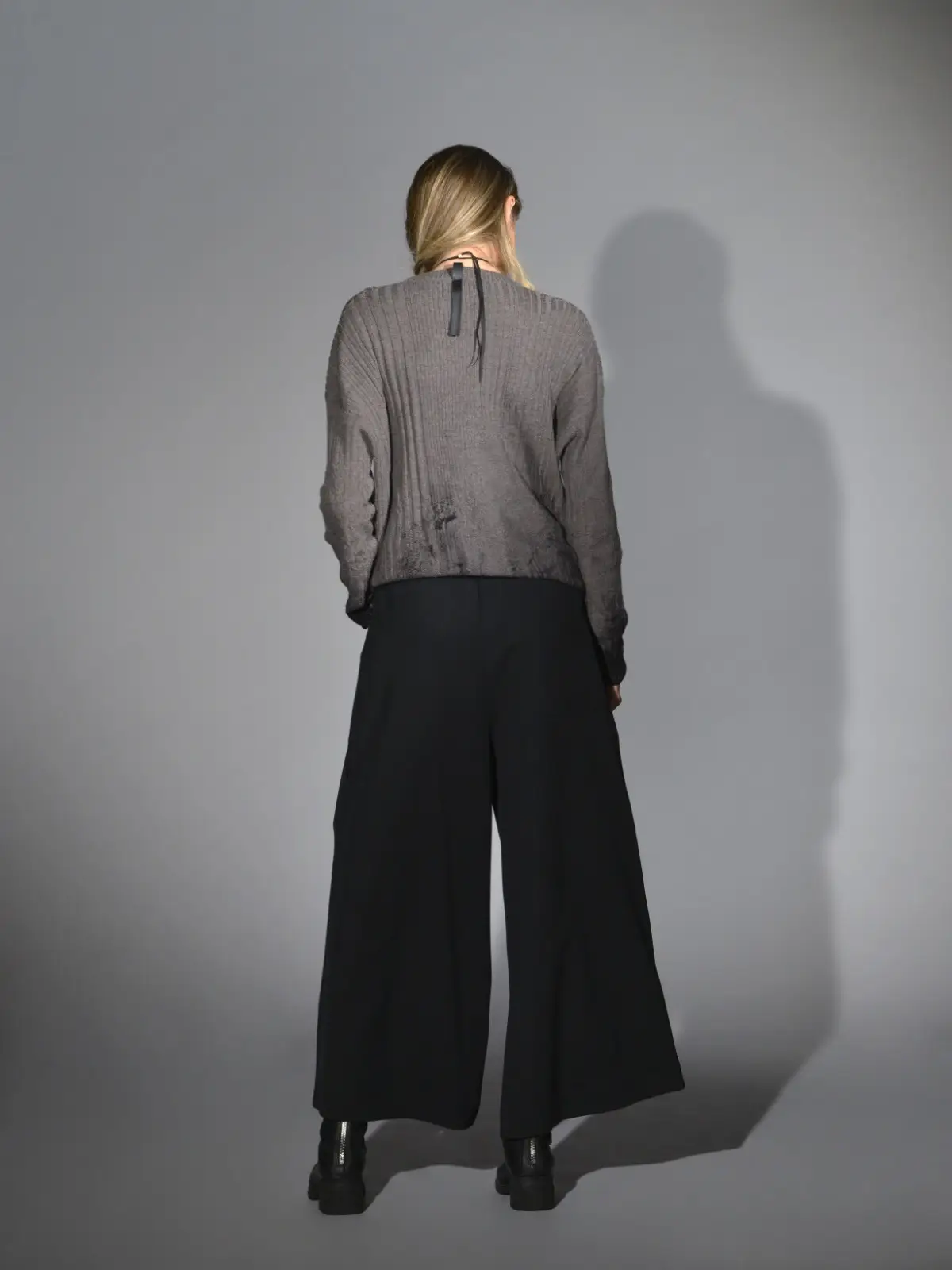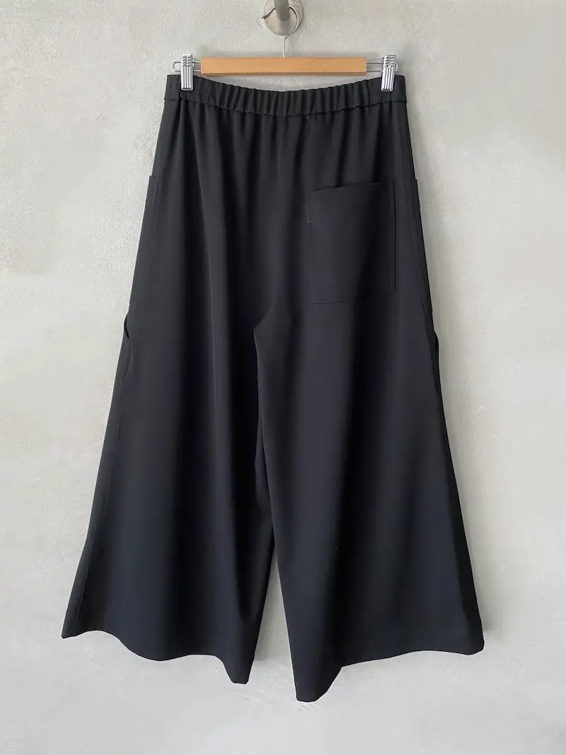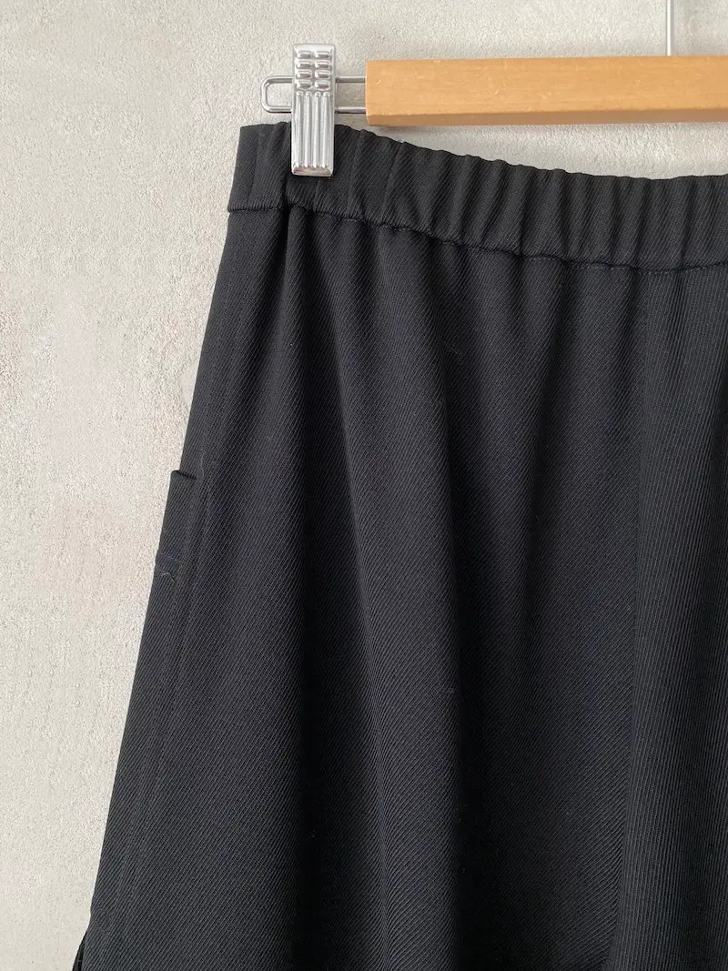 Pantaloni oversize con gamba larga e ampie tasche, cintura con elastico dietro, chiuso davanti con un bottone e cerniera con patta, doppie tasche laterali più una tasca a toppa posteriore sul lato destro. Misure taglia 38: lunghezza 94 cm, circonferenza cintura 74 cm. Le taglie successive aumenteranno 2 cm in lunghezza e 4 cm in circonferenza.