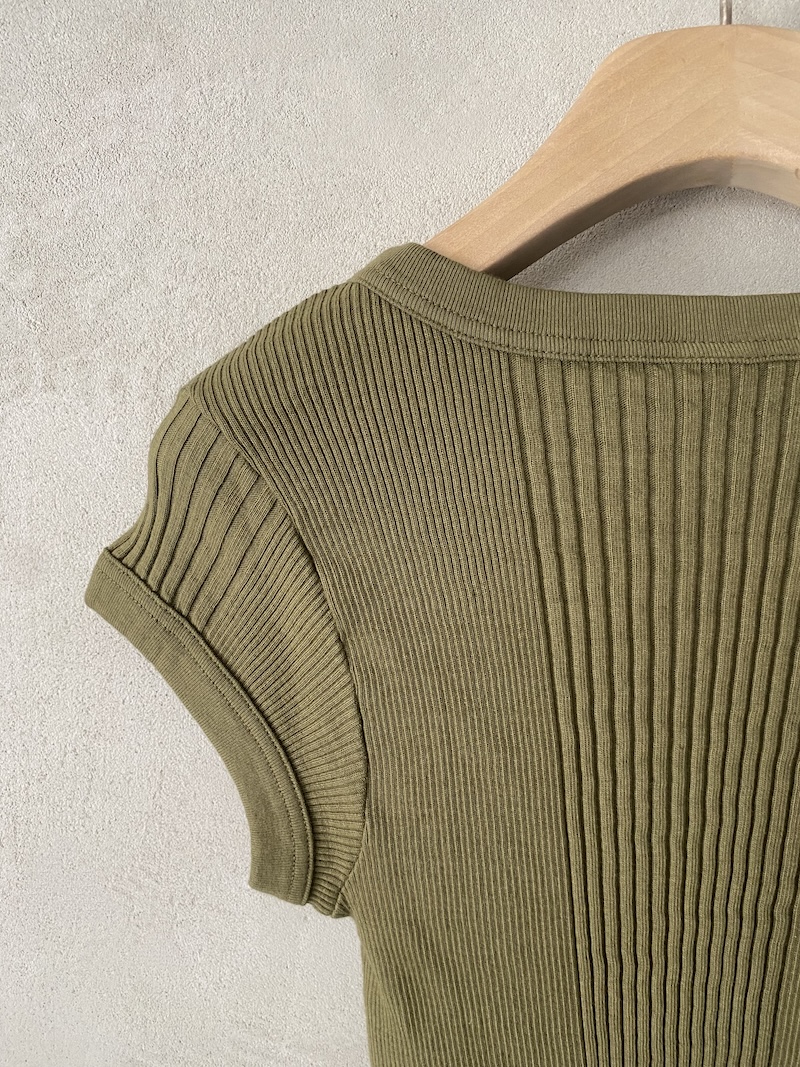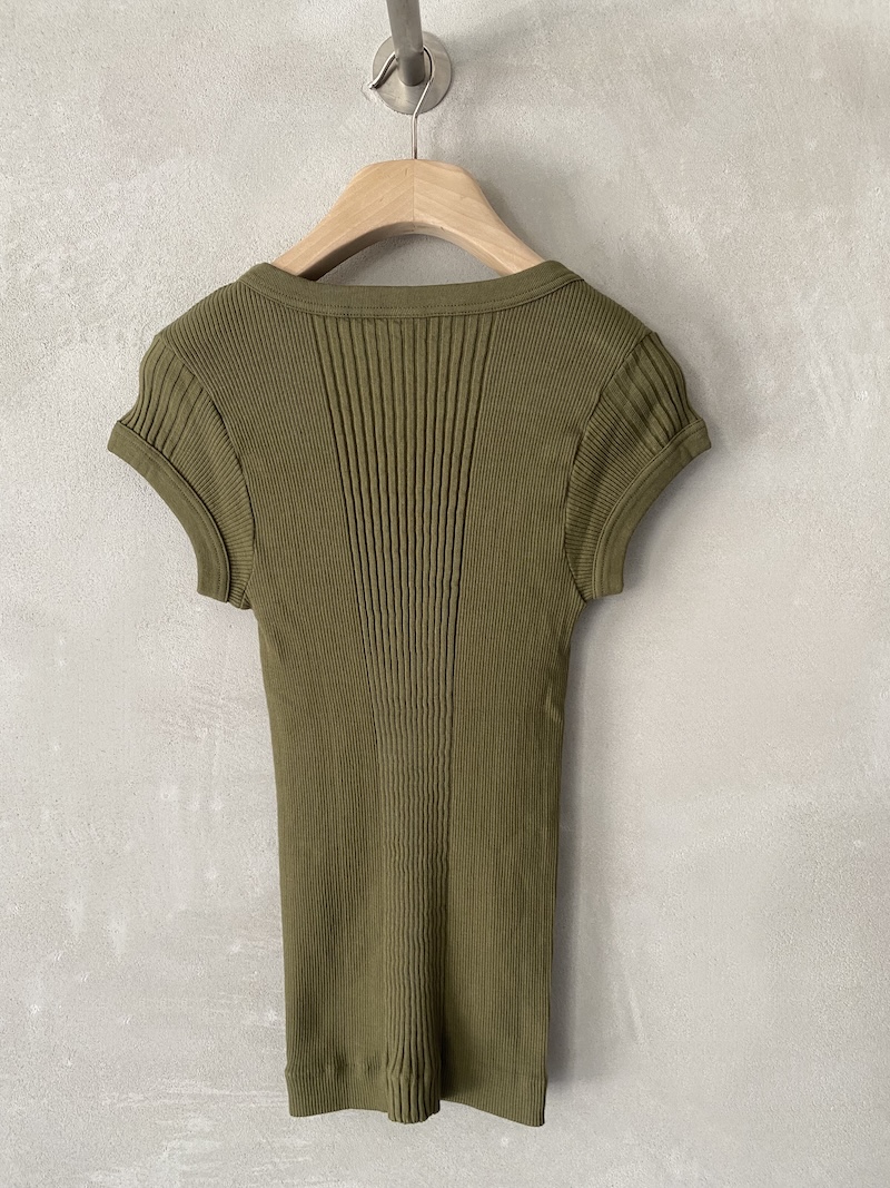 T-shirt in jersey di cotone a costine. Presenta scollo rotondo, spalla regolare, manica corta aderente, linea fitted con volume slim, fondo dritto. Vestibilità aderente. La larghezza non è definibile poiché la lavorazione a costine si adatta al corpo, espandendosi e restringendosi in base alla vestibilità.