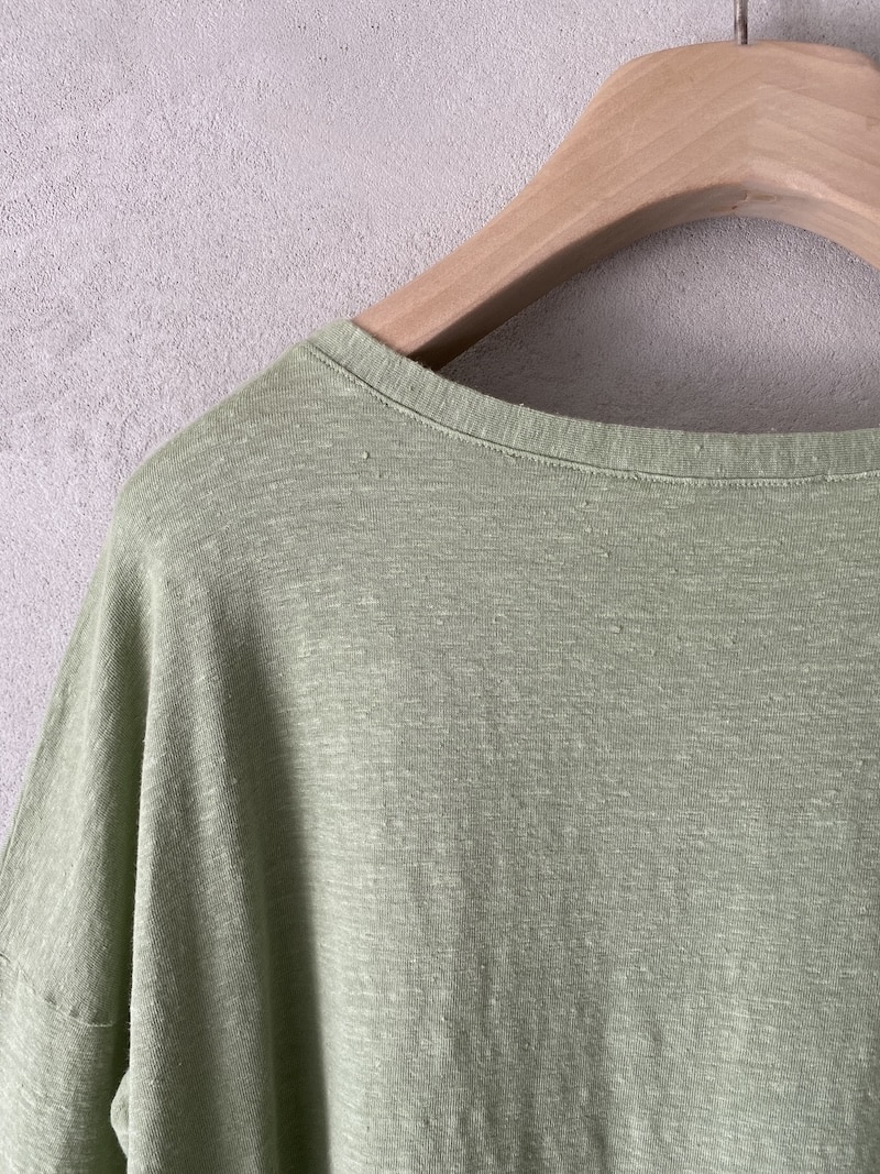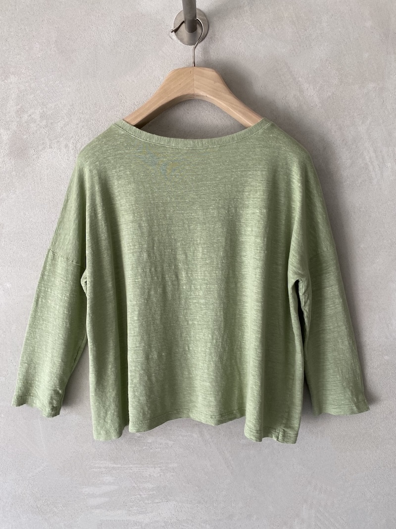 T-shirt boxy in jersey di lino elasticizzato. Scollo tondo ampio e sceso. Spalla calata. Manica lunga al polso con linea aderente. Linea boxy con volume morbido.