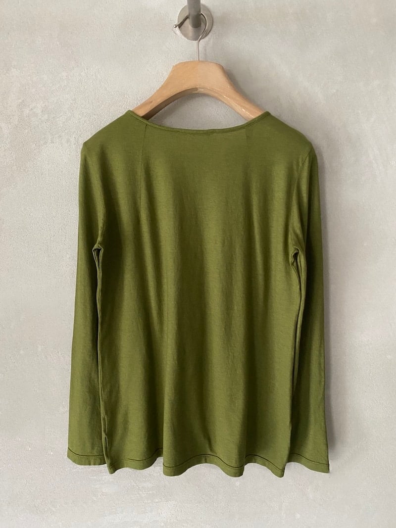 T-shirt slim in cotone e cashmere tinto capo. scollo tondo ampio e sceso, manica lunga. Misure taglia 40: lunghezza 62 cm, larghezza 45 cm. Le misure delle taglie successive aumenteranno 2 cm in lunghezza e 4 cm in circonferenza.