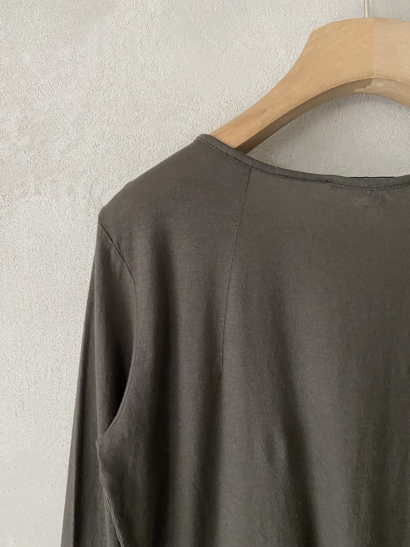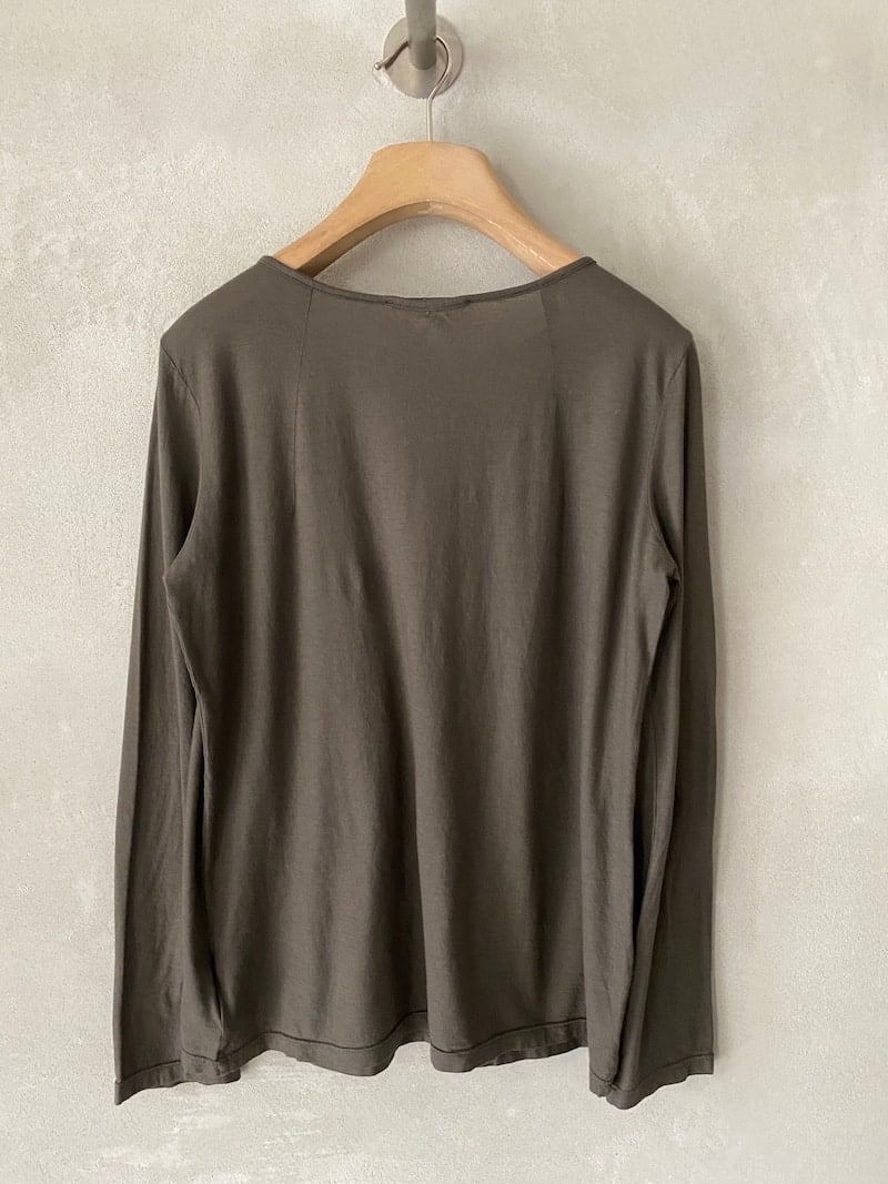 T-shirt slim in cotone e cashmere tinto capo. Scollo tondo ampio e sceso, manica lunga. Misure taglia 40: lunghezza 62 cm, larghezza 45 cm. Le misure delle taglie successive aumenteranno 2 cm in lunghezza e 4 cm in circonferenza.