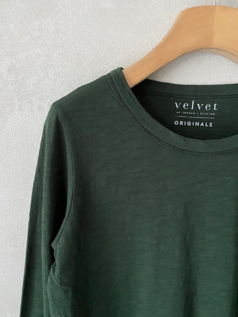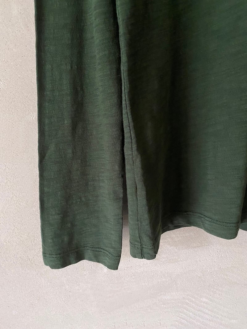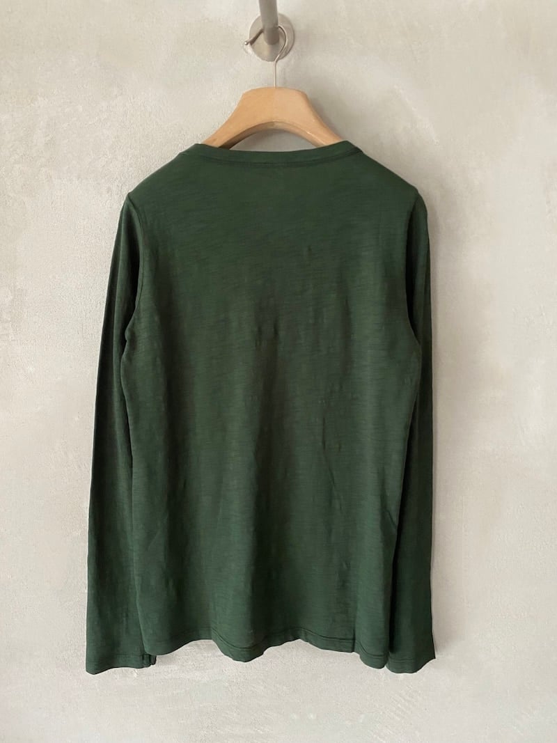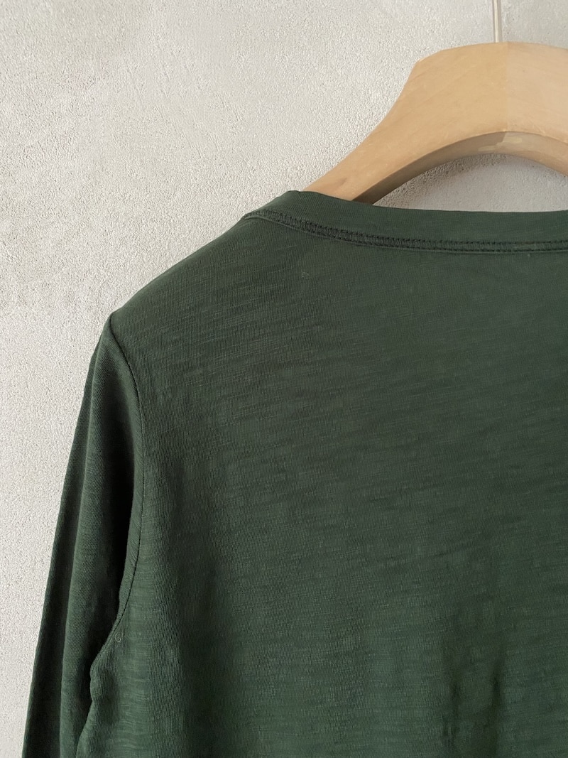 T-shirt slim in cotone tinto in capo, scollo tondo sceso, manica lunga. Misure taglia XS: lunghezza 63 cm larghezza 41 cm. Le misure delle taglie successive aumenteranno 2 cm in lunghezza e 6 cm in circonferenza.