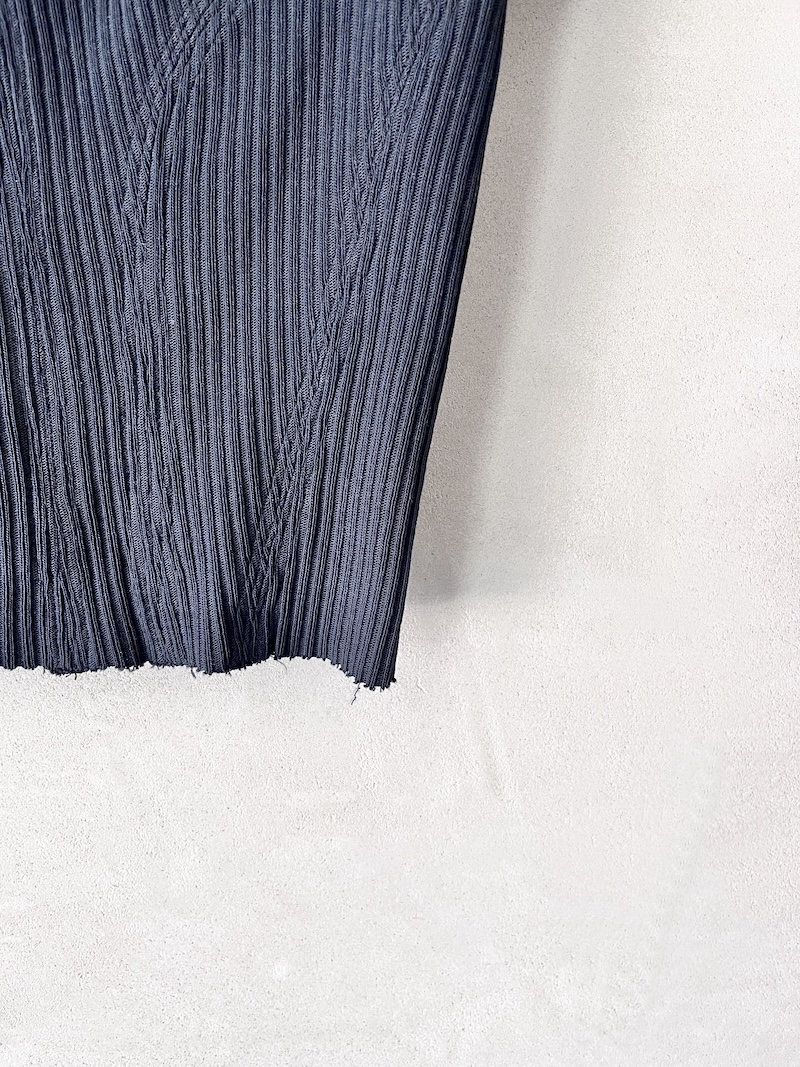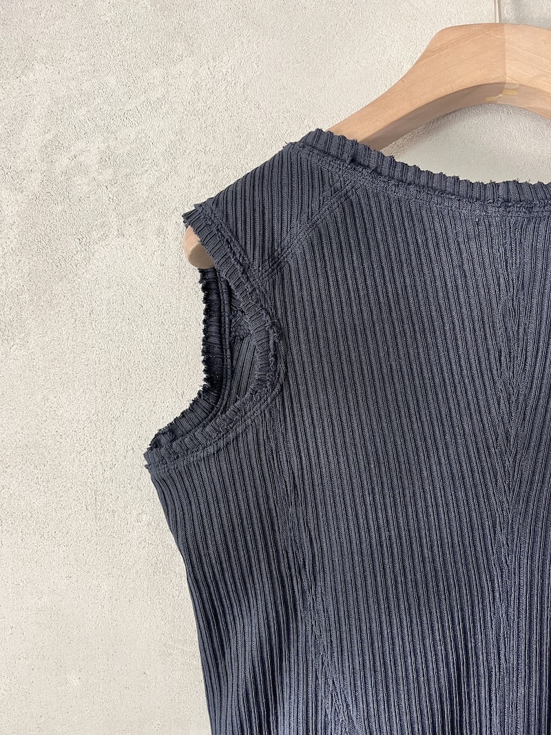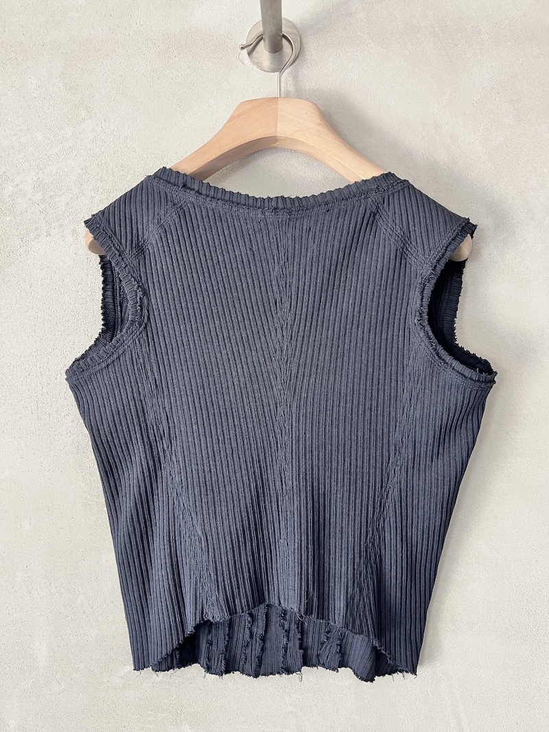 Top in cotone a costine. Presenta scollo ampio arrotondato, senza maniche. Le cuciture sagomate, visibili e decorative, disegnano il capo e valorizzano la struttura del busto, seguendo naturalmente le forme del corpo. Rifiniture a taglio vivo su scollo e giromanica, con effetto leggermente sfrangiato. Fondo rifinito a taglio vivo. Vestibilità aderente grazie alla naturale elasticità del tessuto.