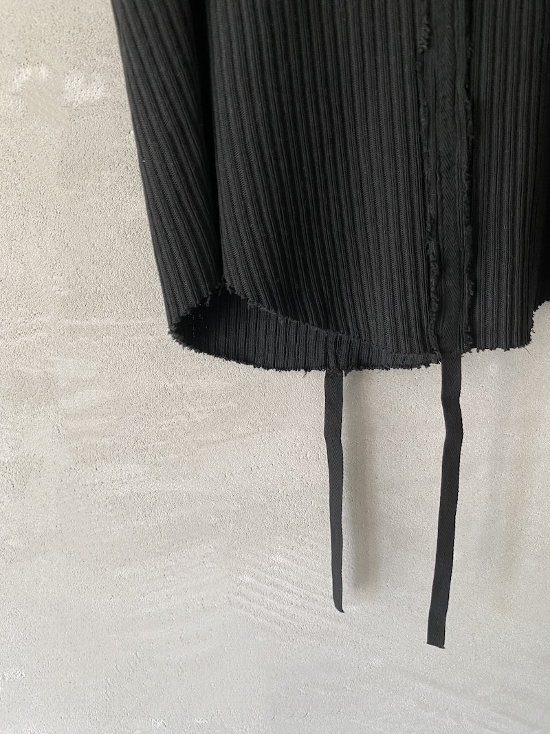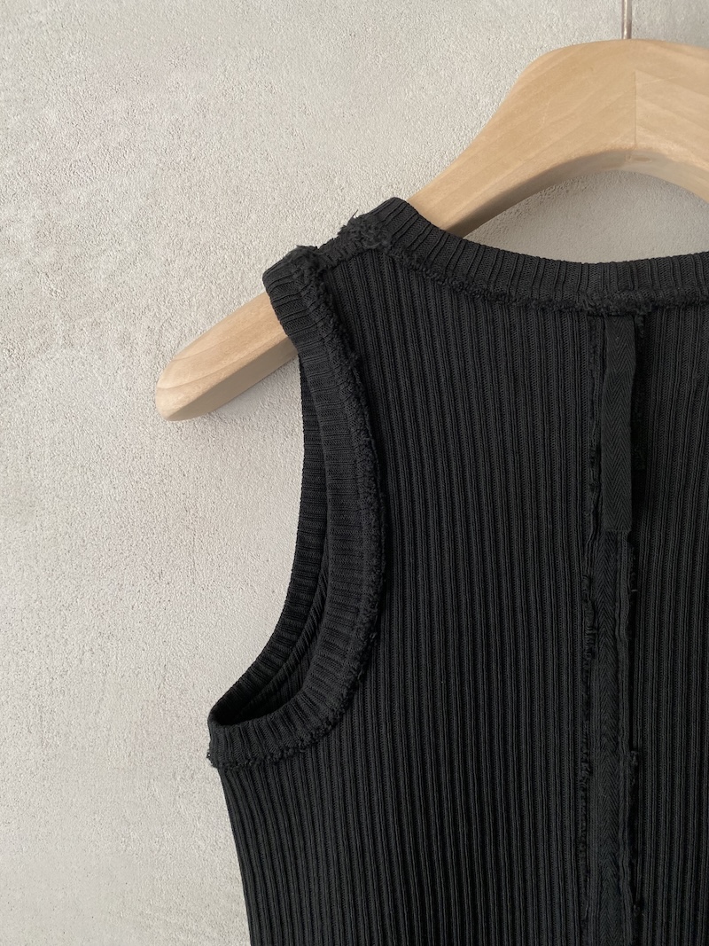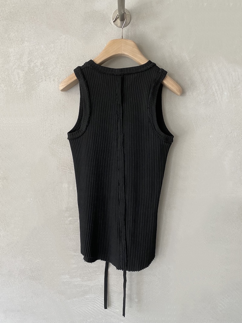 Top in cotone a costine. Presenta scollo ampio arrotondato e senza maniche. La struttura è definita da una cucitura centrale frontale a vista con nastro applicato che prosegue sul fondo, creando un dettaglio distintivo e verticale. Rifiniture a taglio vivo su scollo e giromanica con effetto leggermente sfrangiato. Fondo arrotondato con taglio vivo. Vestibilità aderente grazie alla naturale elasticità del tessuto.
