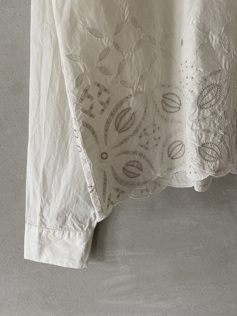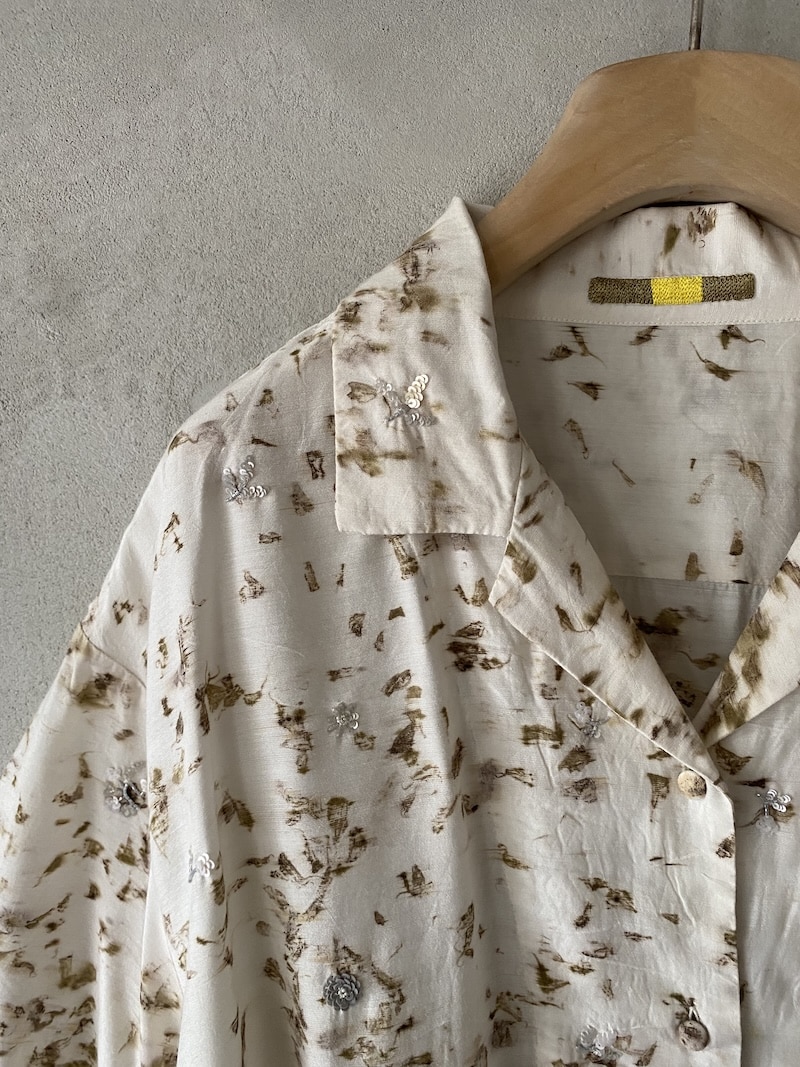 Top senza maniche in lino color naturale con scollo rotondo e linea morbida leggermente svasata. Realizzato in lino leggermente stropicciato che valorizza l’aspetto materico del tessuto. Il fondo del capo è arricchito da un ricamo distribuito sia sul davanti che sul dietro, con piccoli motivi floreali stilizzati nei toni del rosa. Giromanica rifinita con bordo semplice e orlo leggermente arrotondato. Vestibilità confortevole e naturale. Made in Japan.