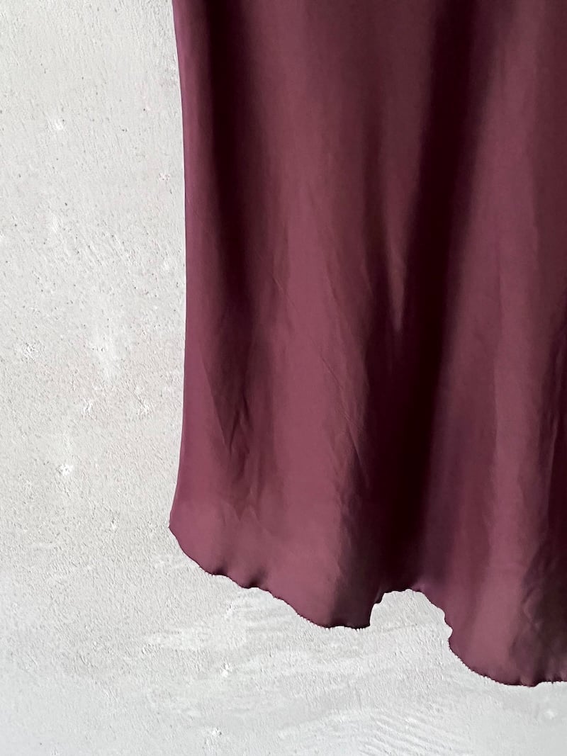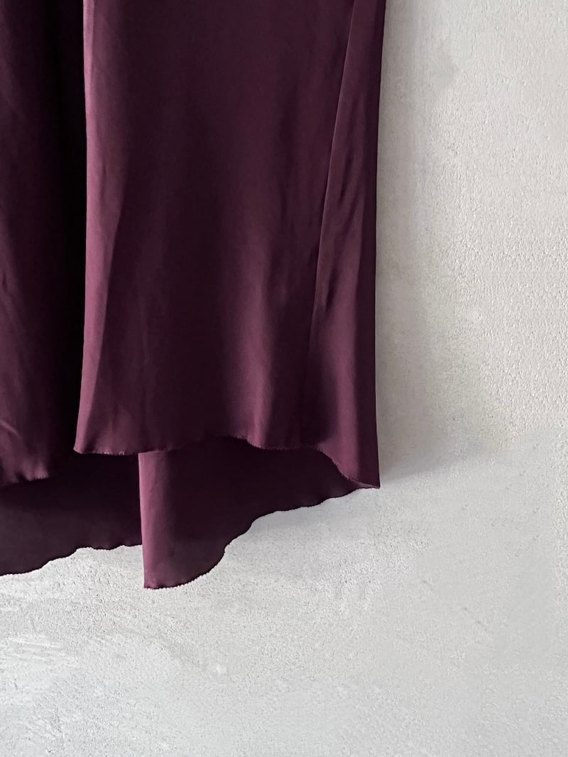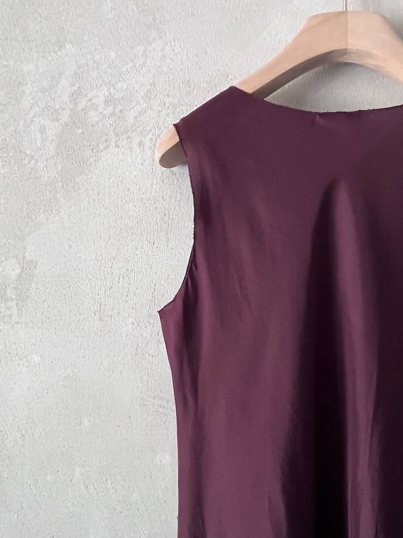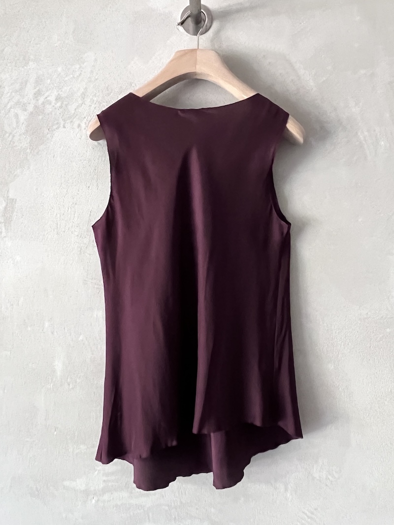 Top smanicato in seta habotai con ttaglio sbieco, scollo tondo ampio e sceso. Misure taglia 36: lunghezza 66 cm, circonferenza torace 92 cm. Le misure delle taglie successive aumenteranno 2 cm in lunghezza e 4 cm in circonferenza.