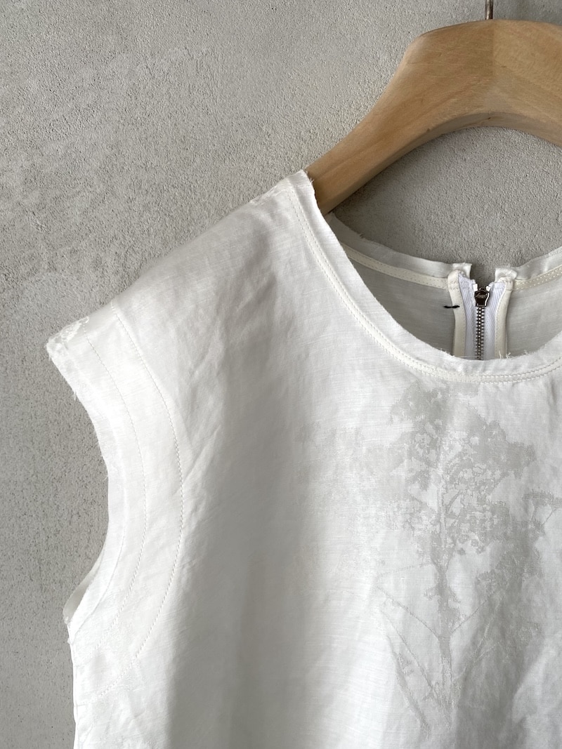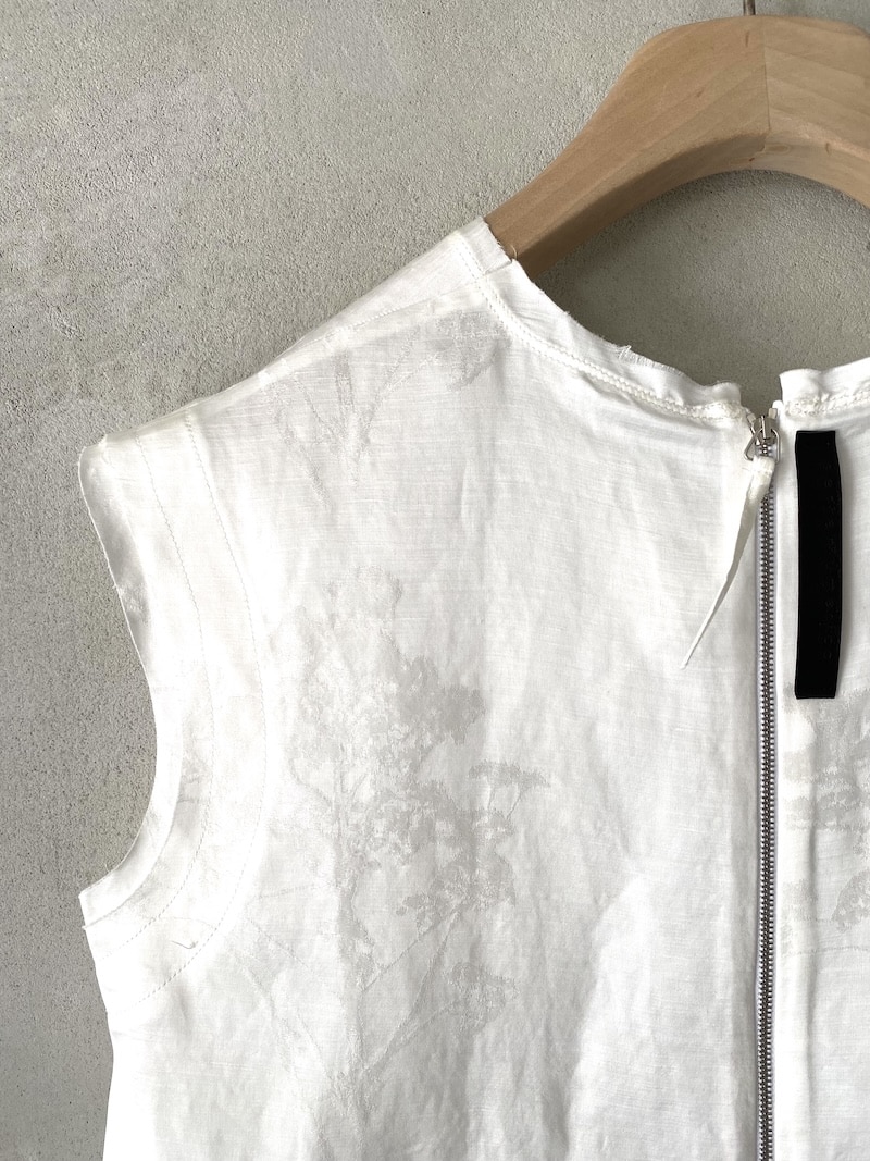 Top corto in tessuto jacquard damascato con motivo botanico realizzato a telaio su fondo grigio. Scollo rotondo ampio e sceso. Senza maniche con spalla scesa. Linea ampia e leggermente svasata. Chiusura sul retro con zip a vista. Rifiniture a taglio vivo su scollo, giromanica e fondo. Vestibilità morbida.