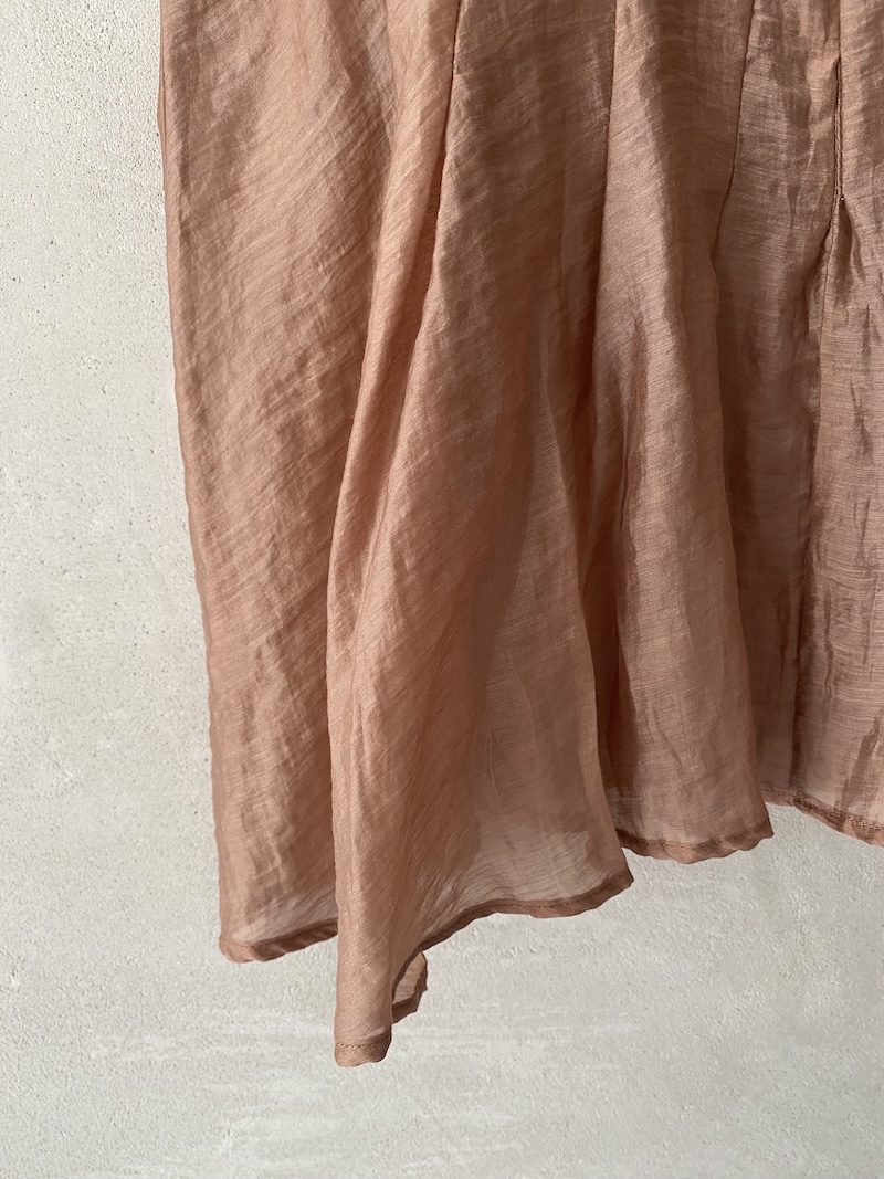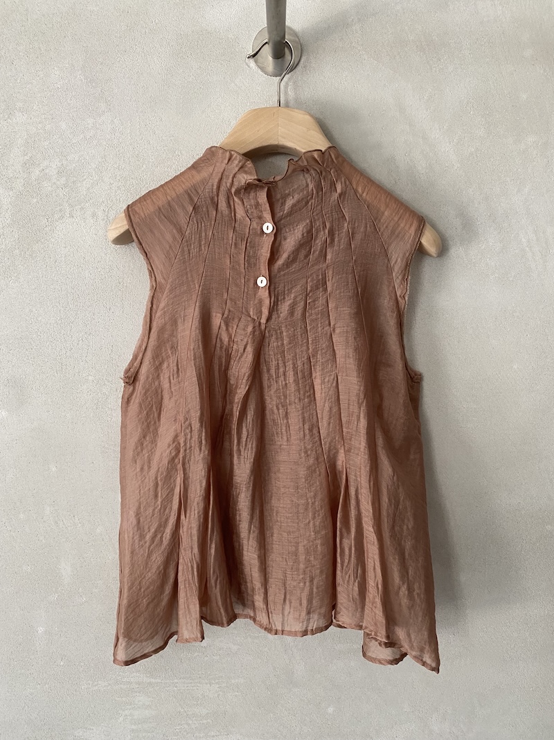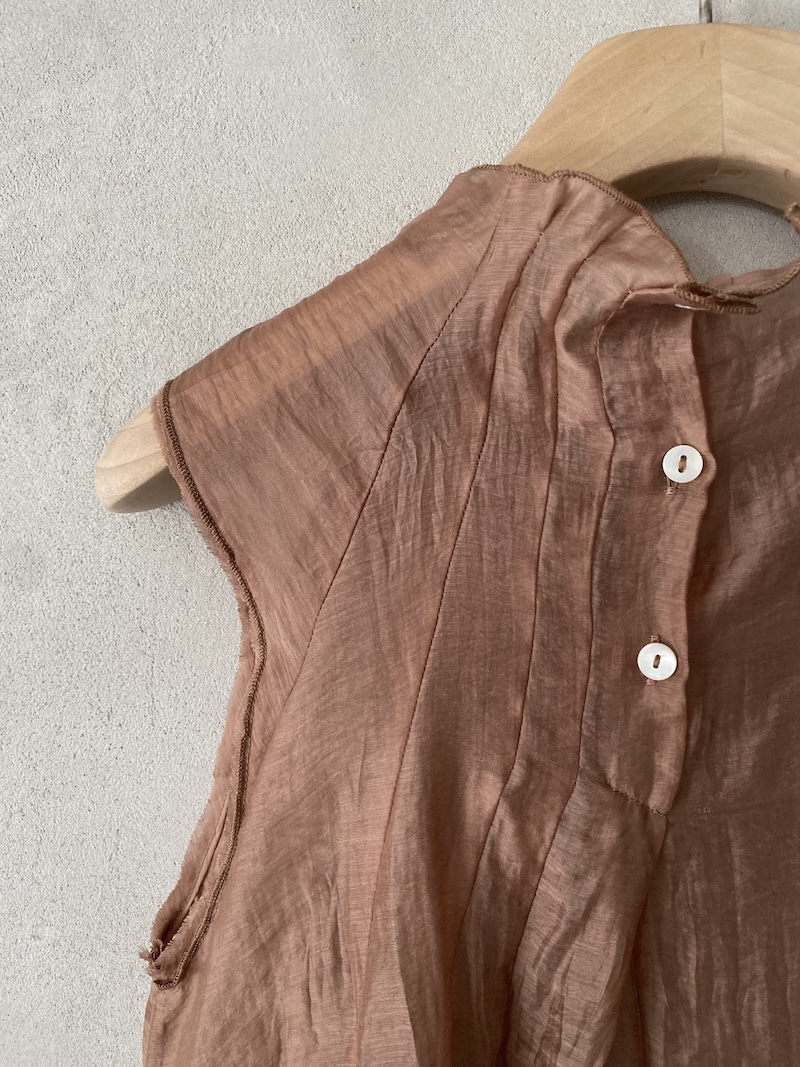 Top in tessuto tencel semi trasparente. Presenta collo alto arricciato con apertura sul retro chiusa da bottoni, spalla leggermente scesa, linea ampia con volume fluido. Costruzione caratterizzata da cuciture verticali che si interrompono all’altezza del torace trasformandosi in pieghe aperte che ampliano il volume del capo, fondo arrotondato con rifiniture sottili, giromanica a taglio vivo rifiniti con bordino interno. Vestibilità morbida.