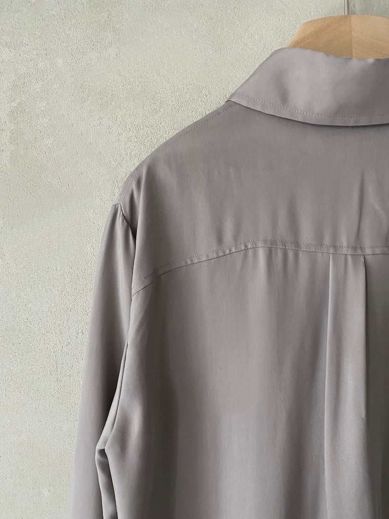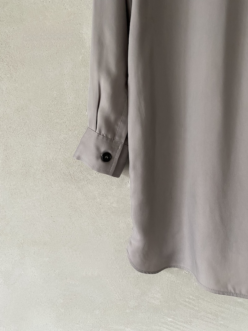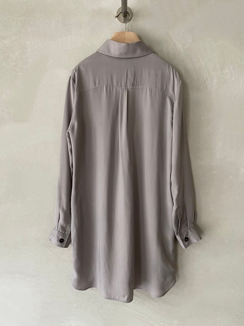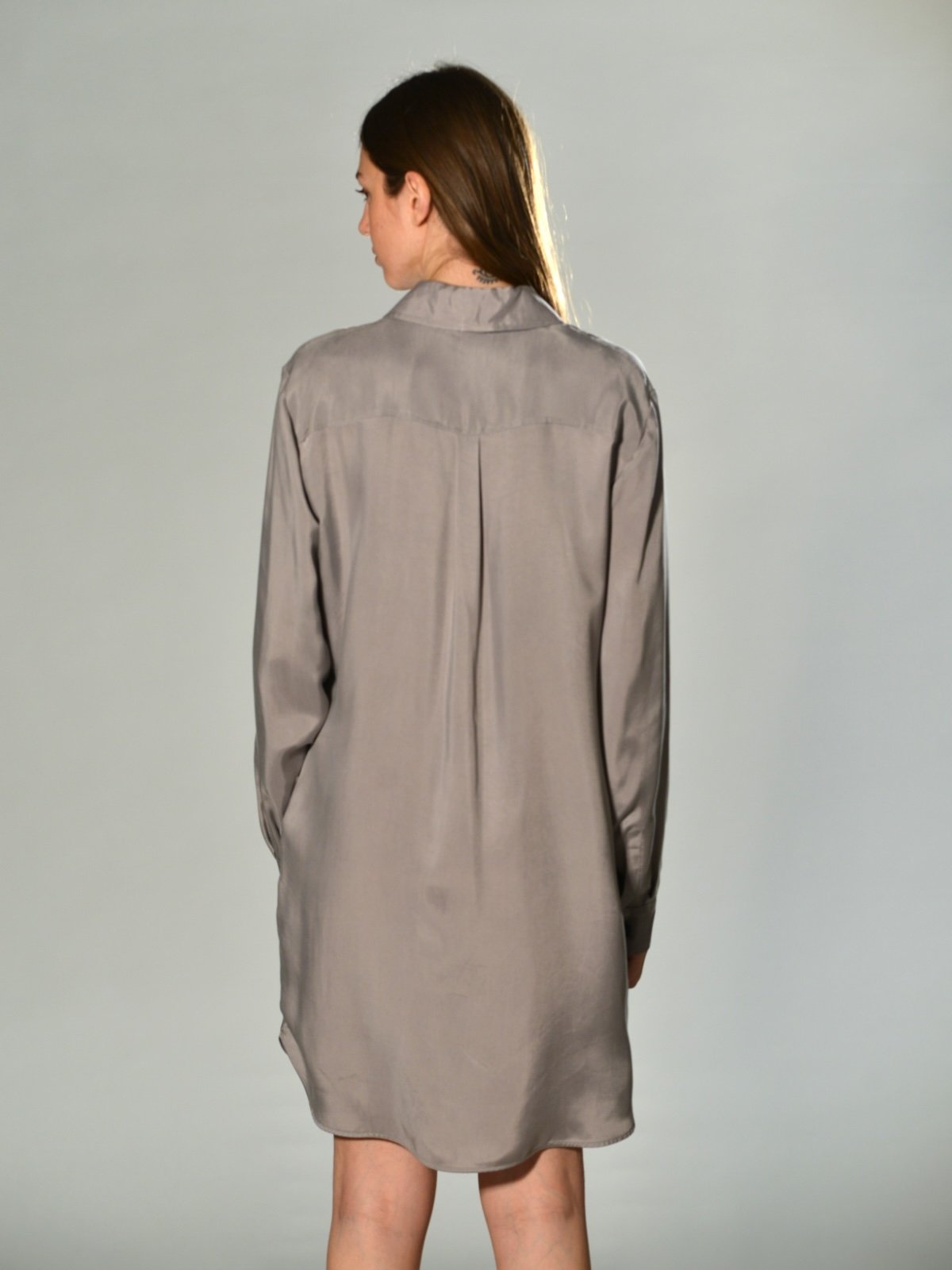 Abito/camicia in cupro, chiusura centrale davanti con 4 bottoni, due tasche a toppa con patta e bottone, manica lunga con polsino chiuso con 1 bottone, spalla con sprone e cannello. Misure taglia 40: lunghezza 88 cm, torace 48 cm. Le taglie successive aumenteranno 1 cm in lunghezza e 4 cm in circonferenza.